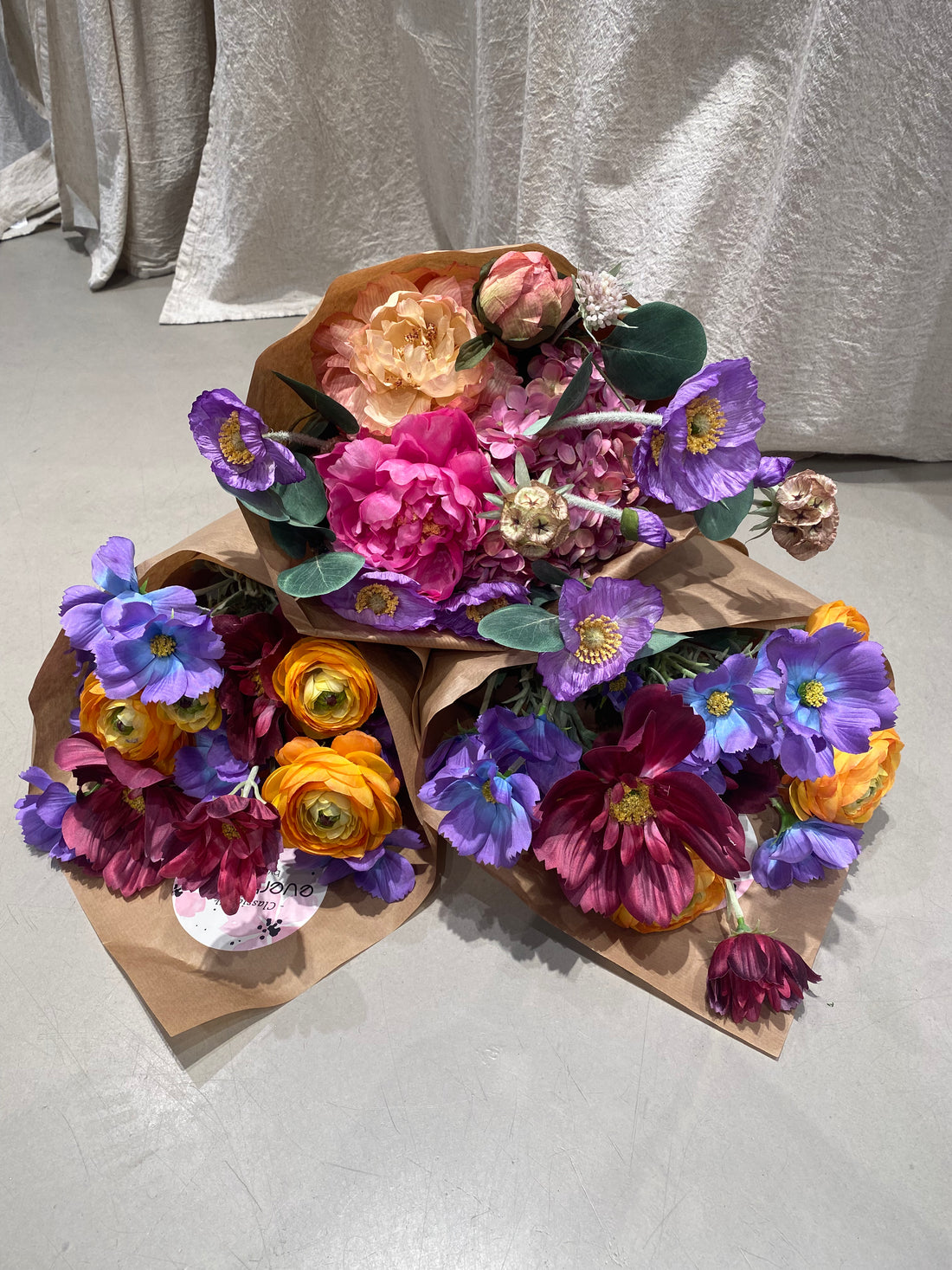 Færdig bundet – du får en færdig buket i flotte farvekombinationer.