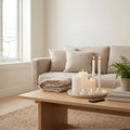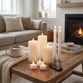 Bloklys og stagelys har en rustik overflade og er belagt med ægte stearin, hvilket giver et flot og autentisk look – helt uden sod, brandfare eller varme.