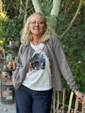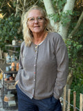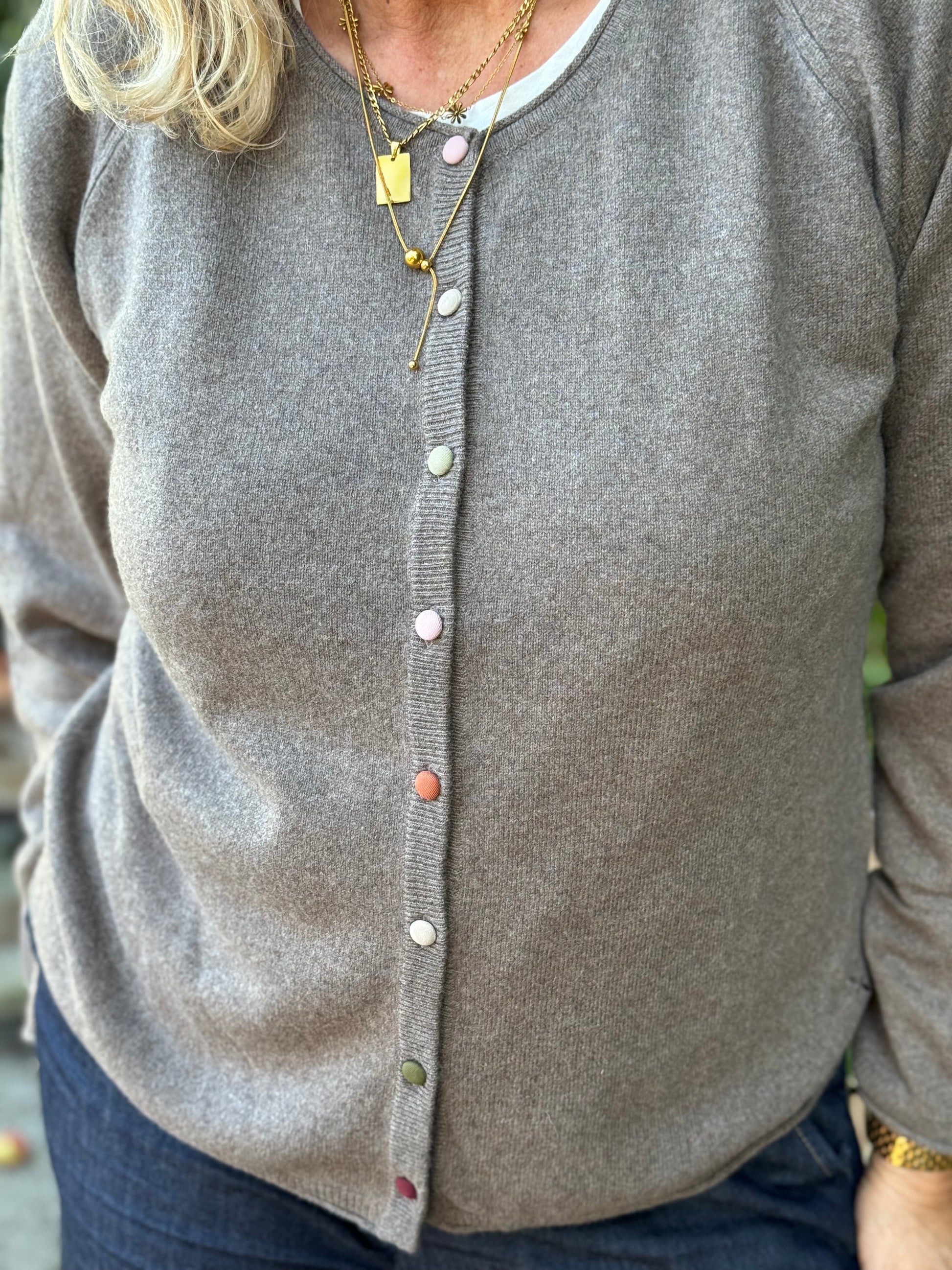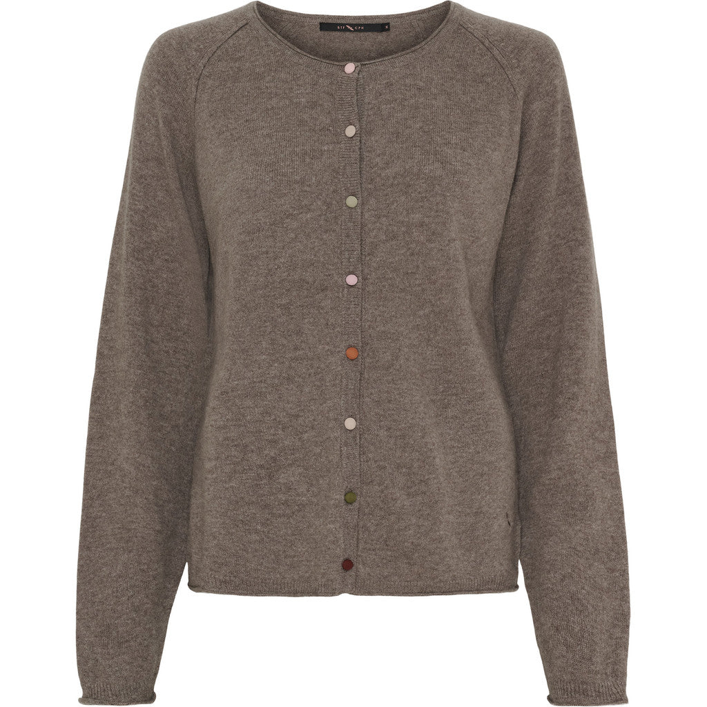 En smuk og elegant cardigan i det skønneste materiale. Cardiganen er med langeærmer som afsluttes med en fin ribkant, som også ses ved den runde halsudskæring og nederst. Den er gennemknappet med forskellige farvede knapper.