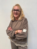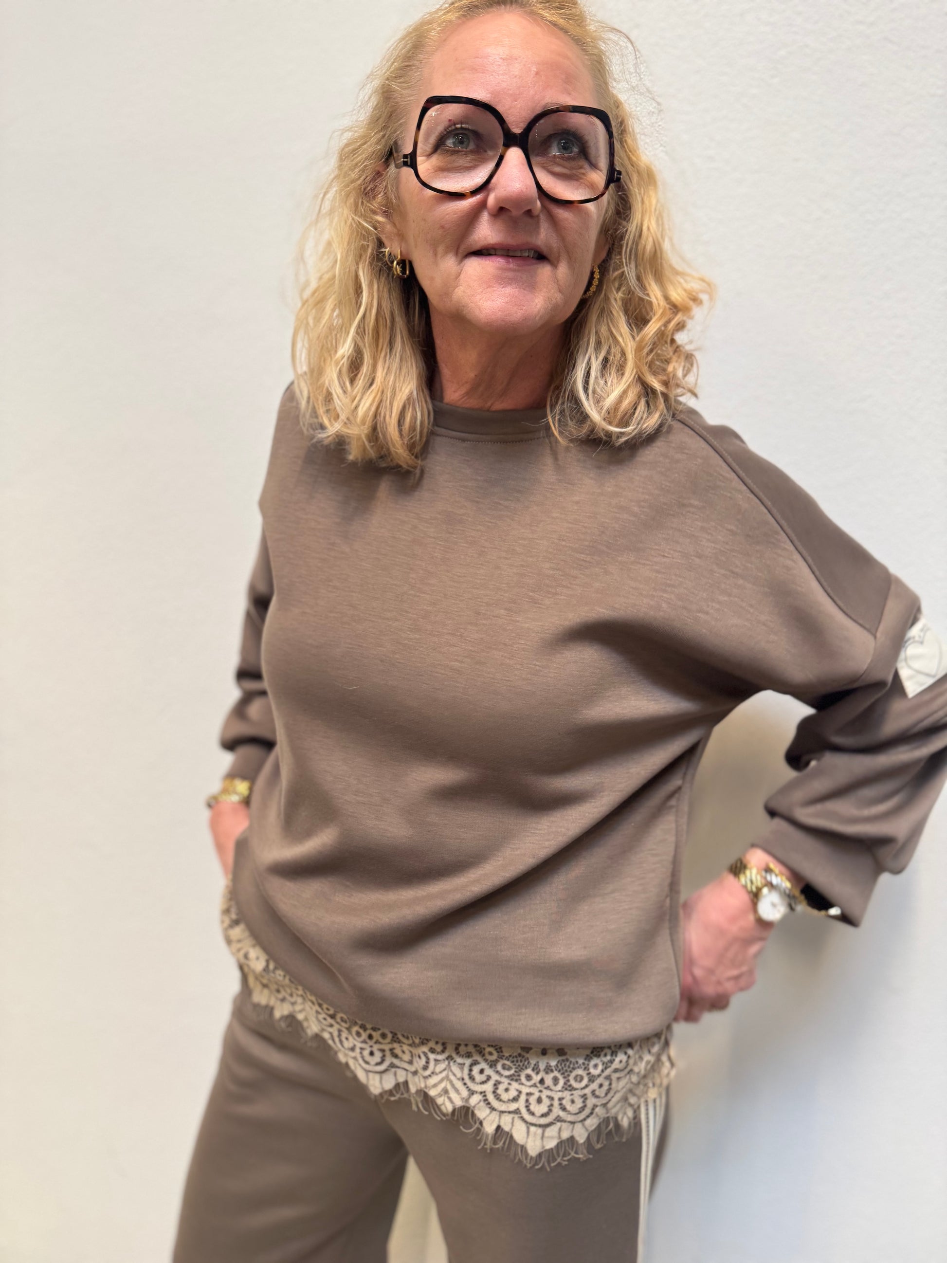 Lækker blød sweatshirt - Sweatshirten har rundhals med en lille kant, som går igen ved ærmerne og forneden. Som en sød detalje har den et lille hjerte på det ene bryst.