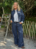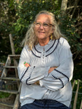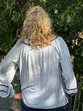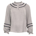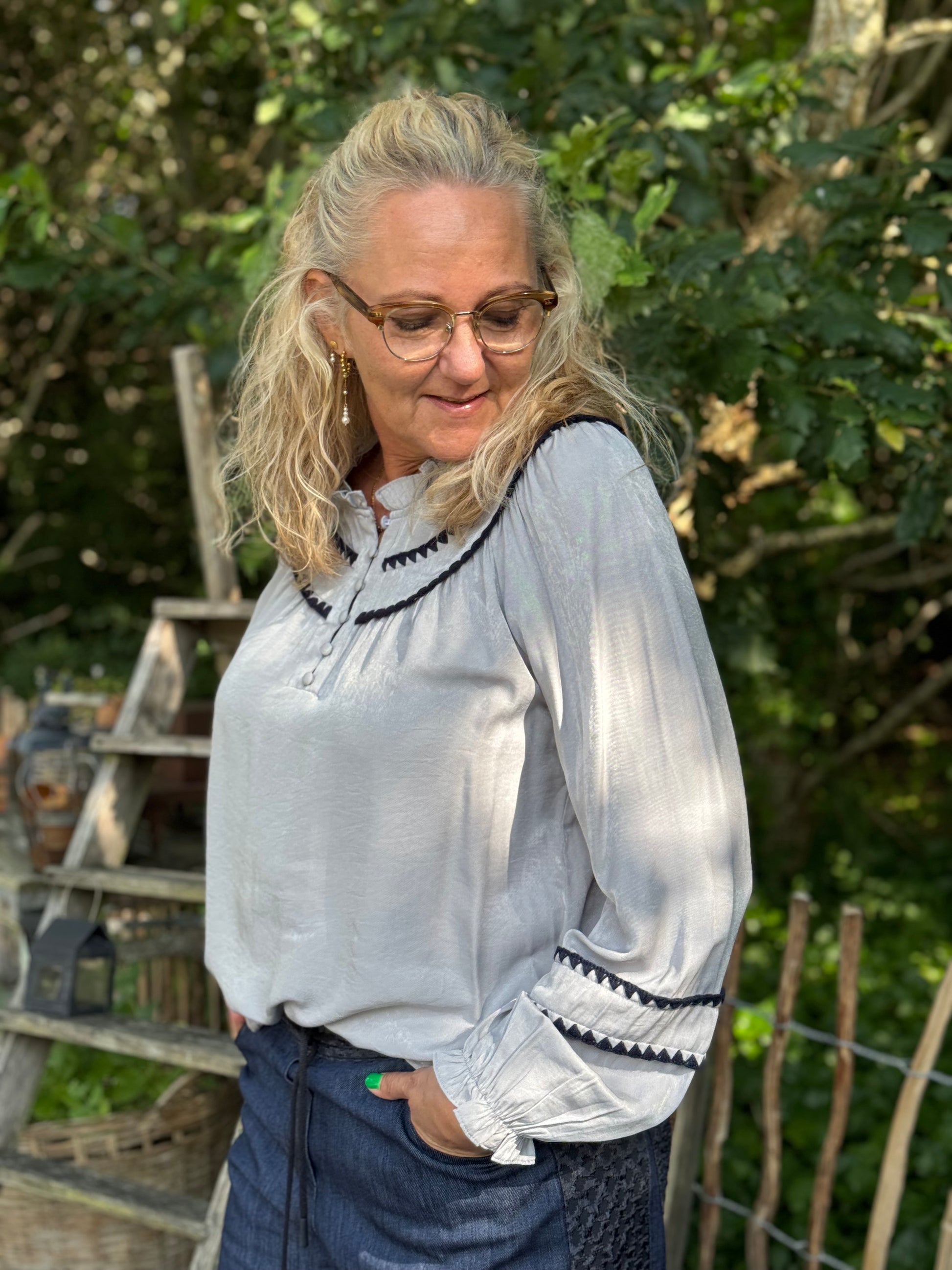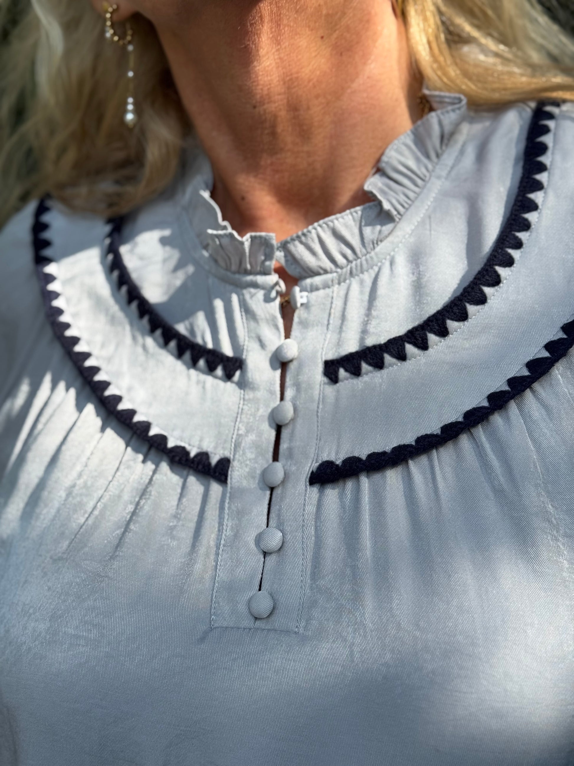 Her får man en feminin bluse, som kan pifte et hvert outfit op. Blusen en lille høj krave, som kan åbnes op med knapper. Som en fin detalje har den tråd mønster ved kraven og på ærmet som afsluttes med en fin lille rynk.