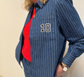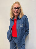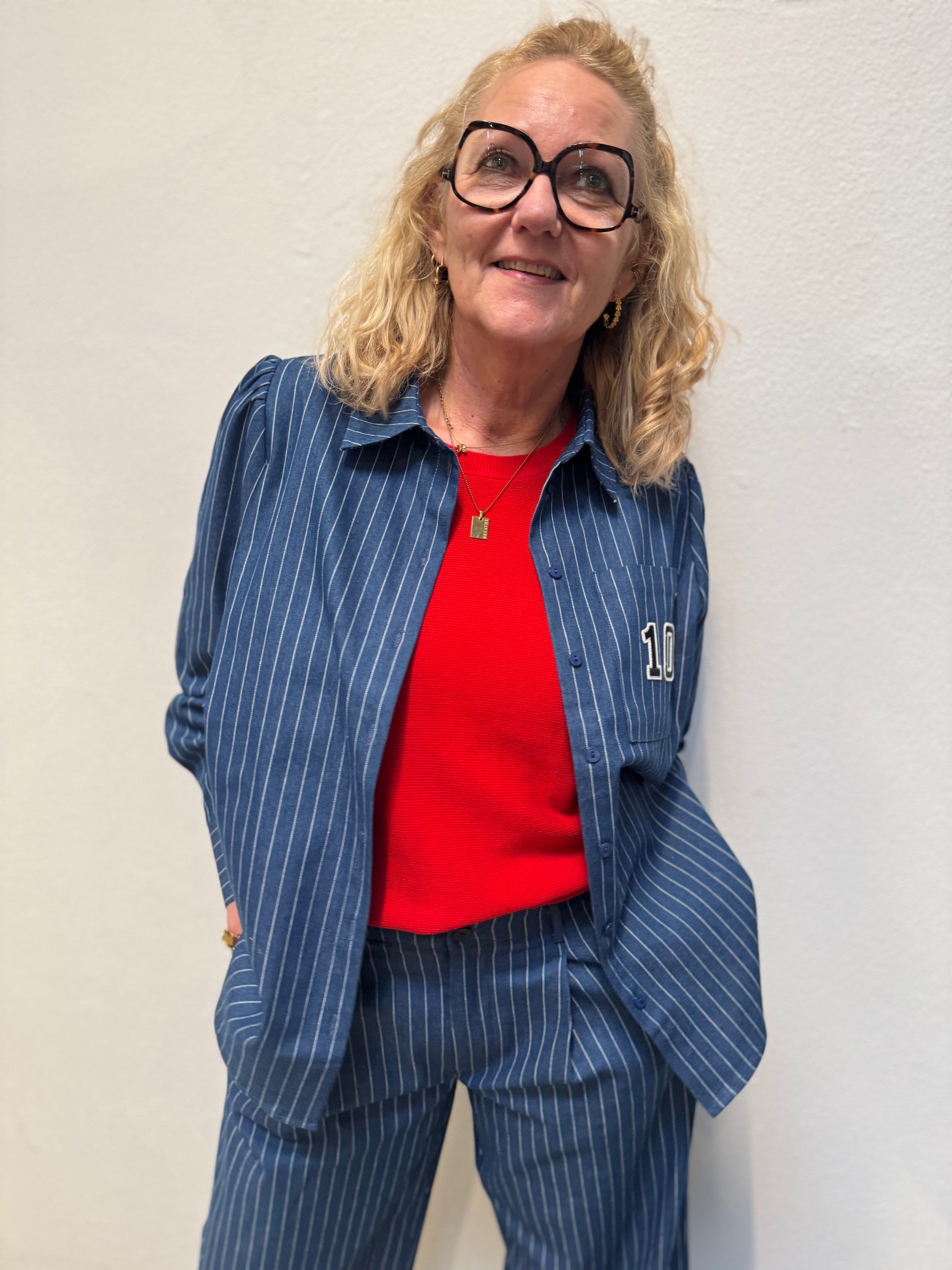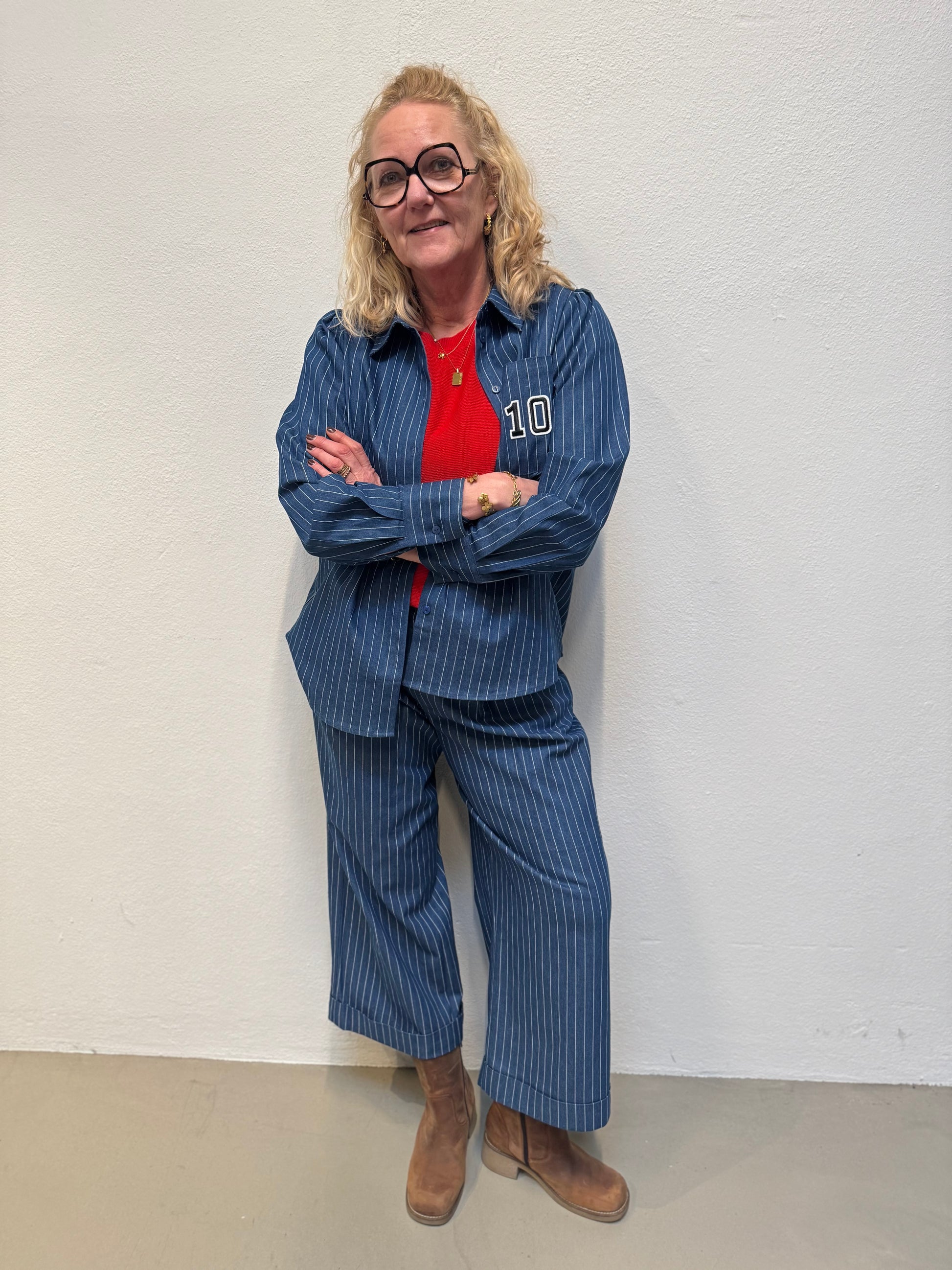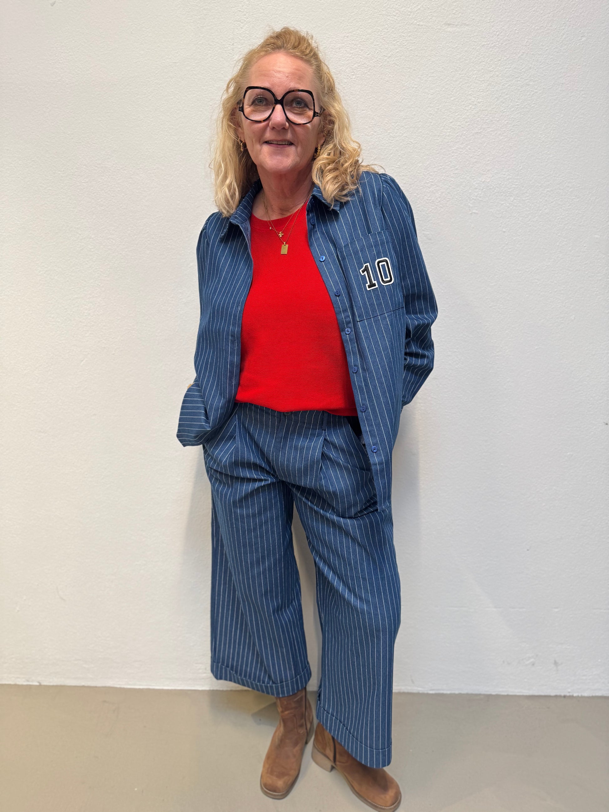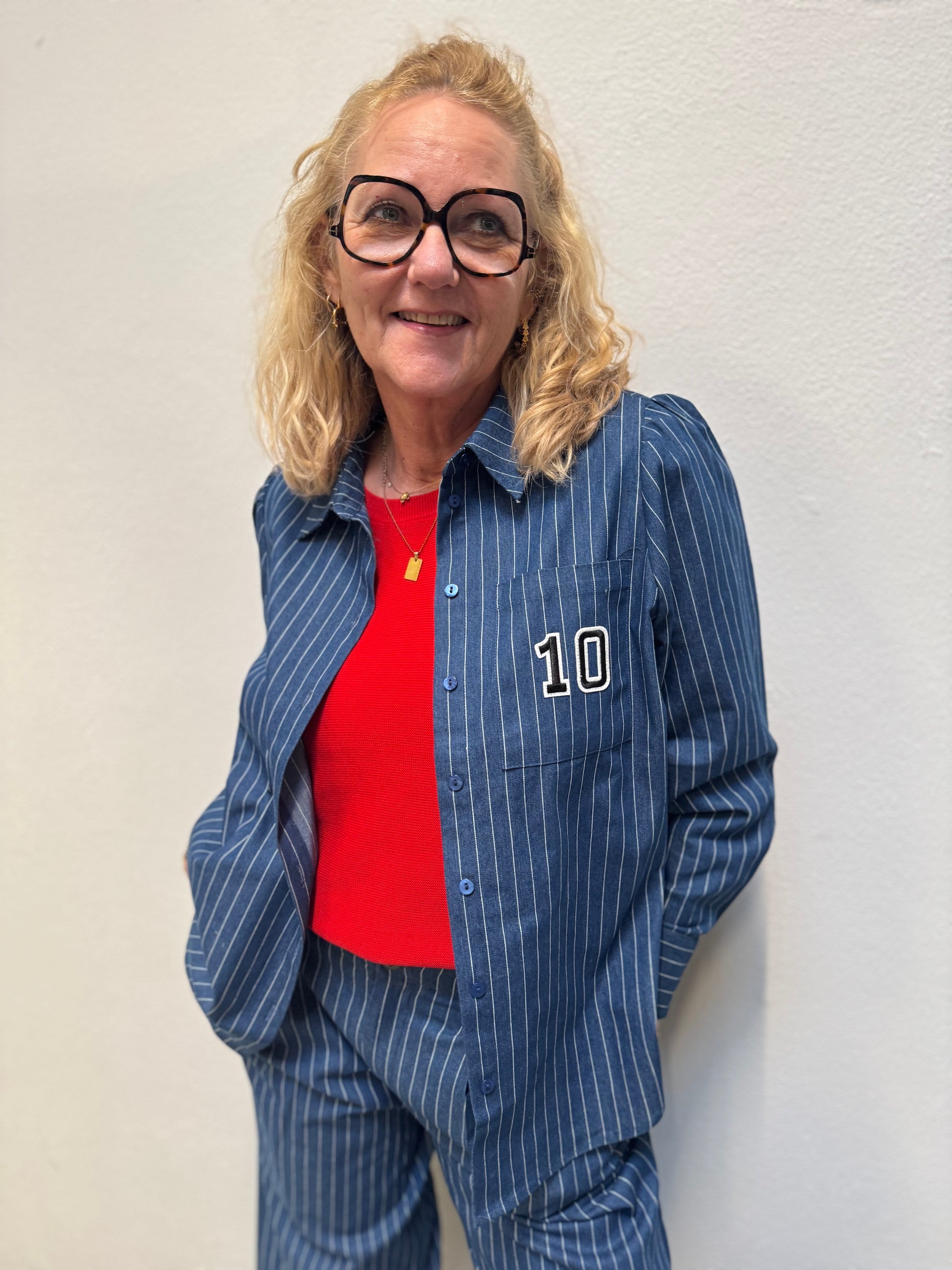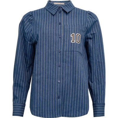 Skøn stribet denimskjorte i den lækreste kvalitet. Skjorten har en klassisk krave og knaplukning foran. Som en lækker detalje er der en brystlomme med et 10 tal broderet, som sammen med de afrundende kanter giver et sporty udtryk.