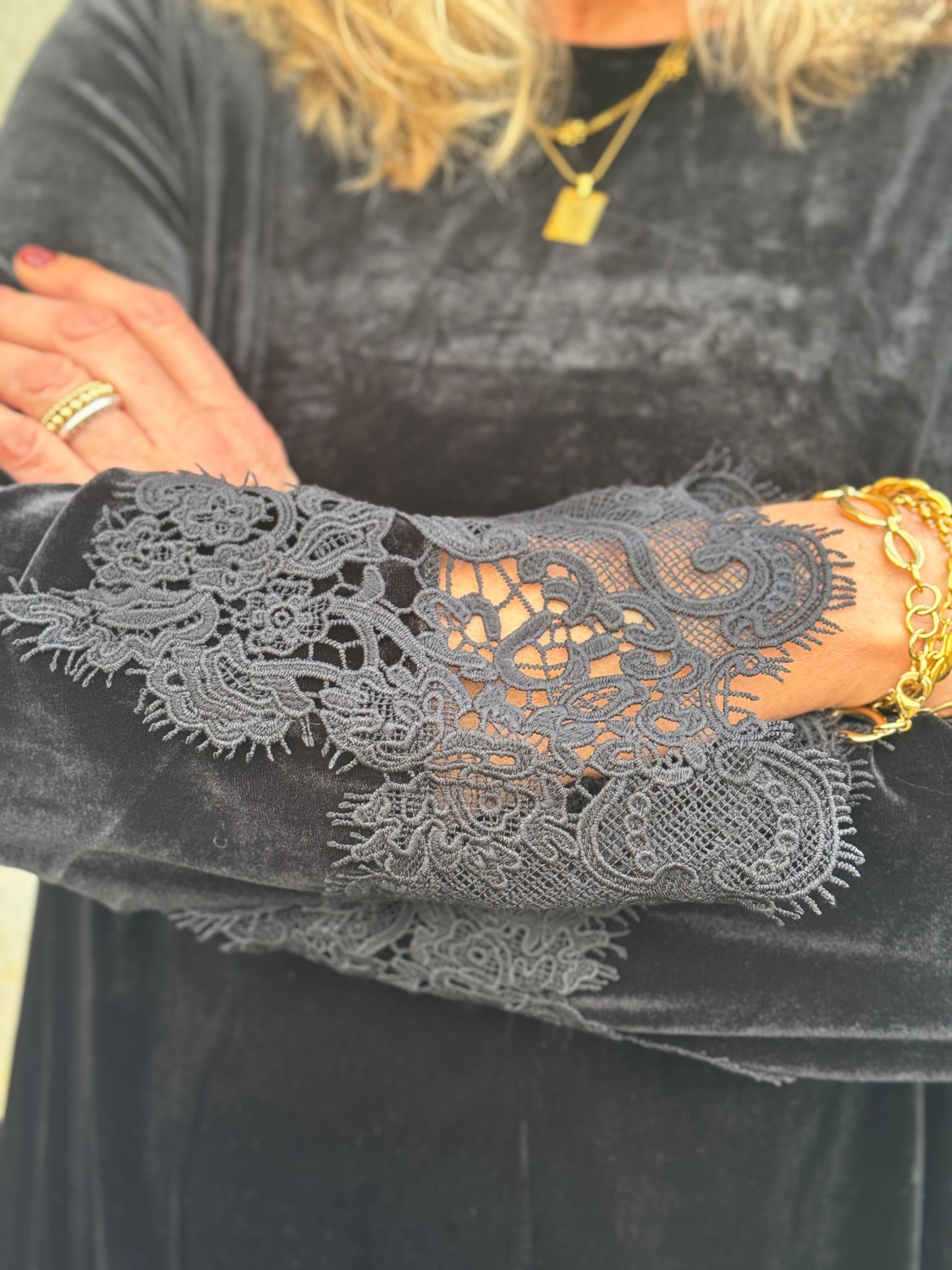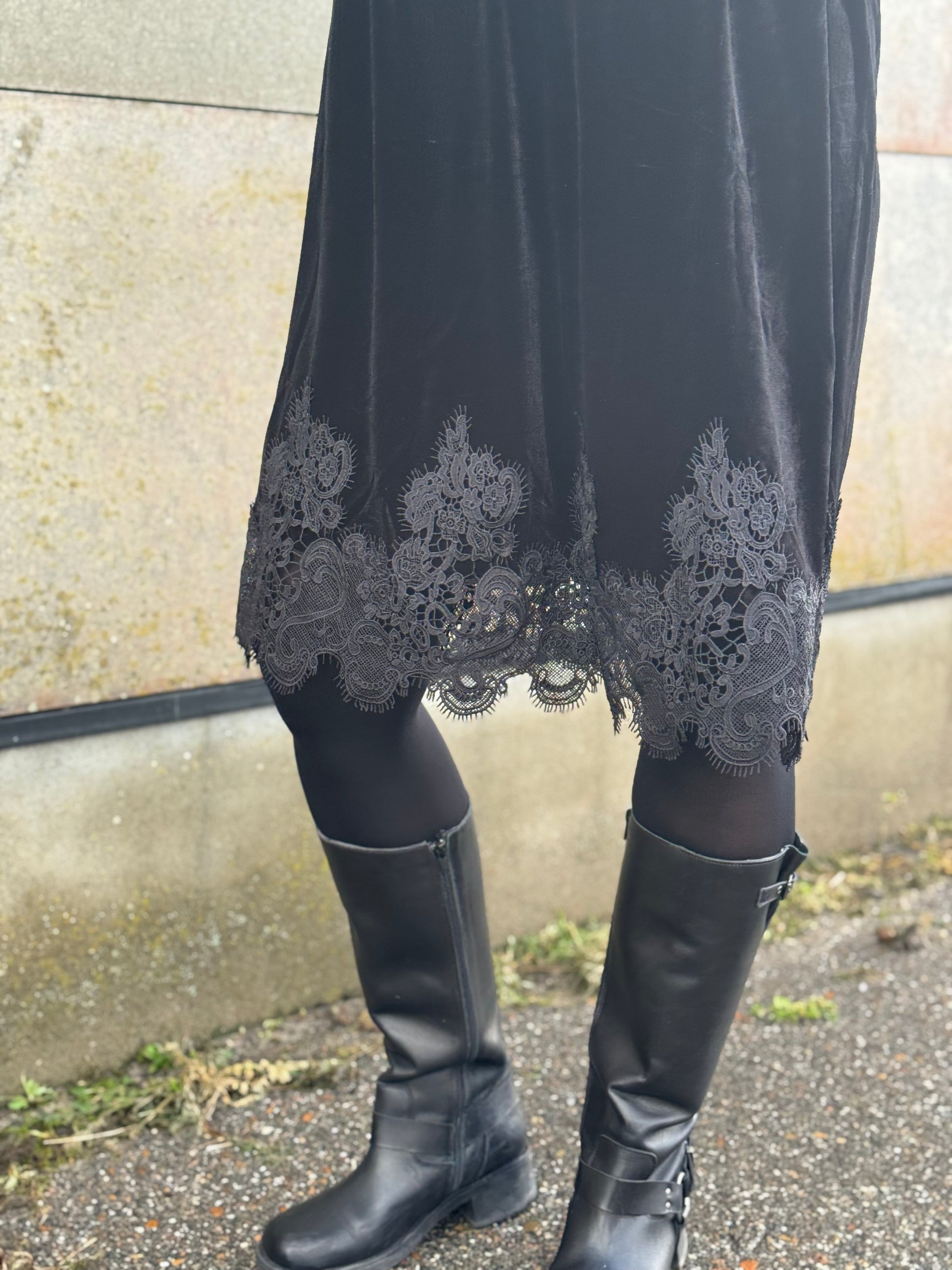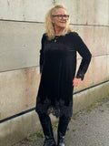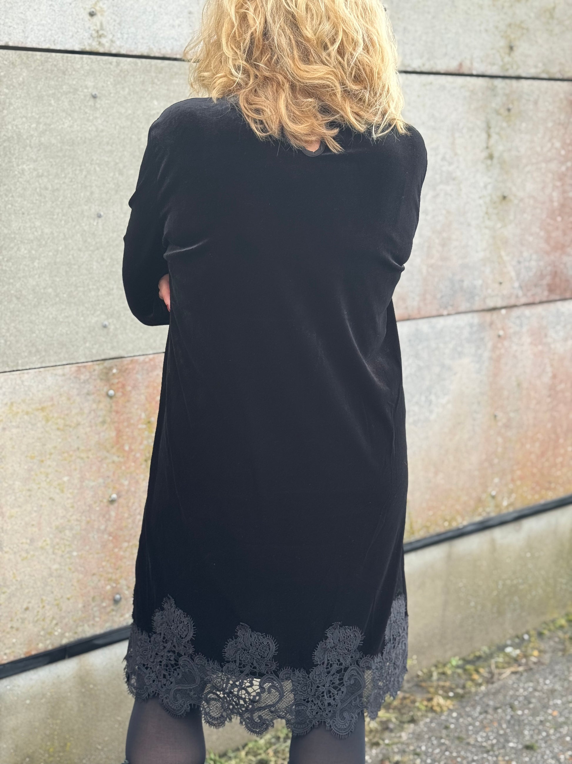 Super smuk kjole fra Costa Mani som kan redde en hver tøjkrise. Kjolen har en fin rundhals som lukkes med en knap bagpå. Den har lange ærmer, som afsluttes med et fint blondestykke, som går igen forneden på kjolen.
