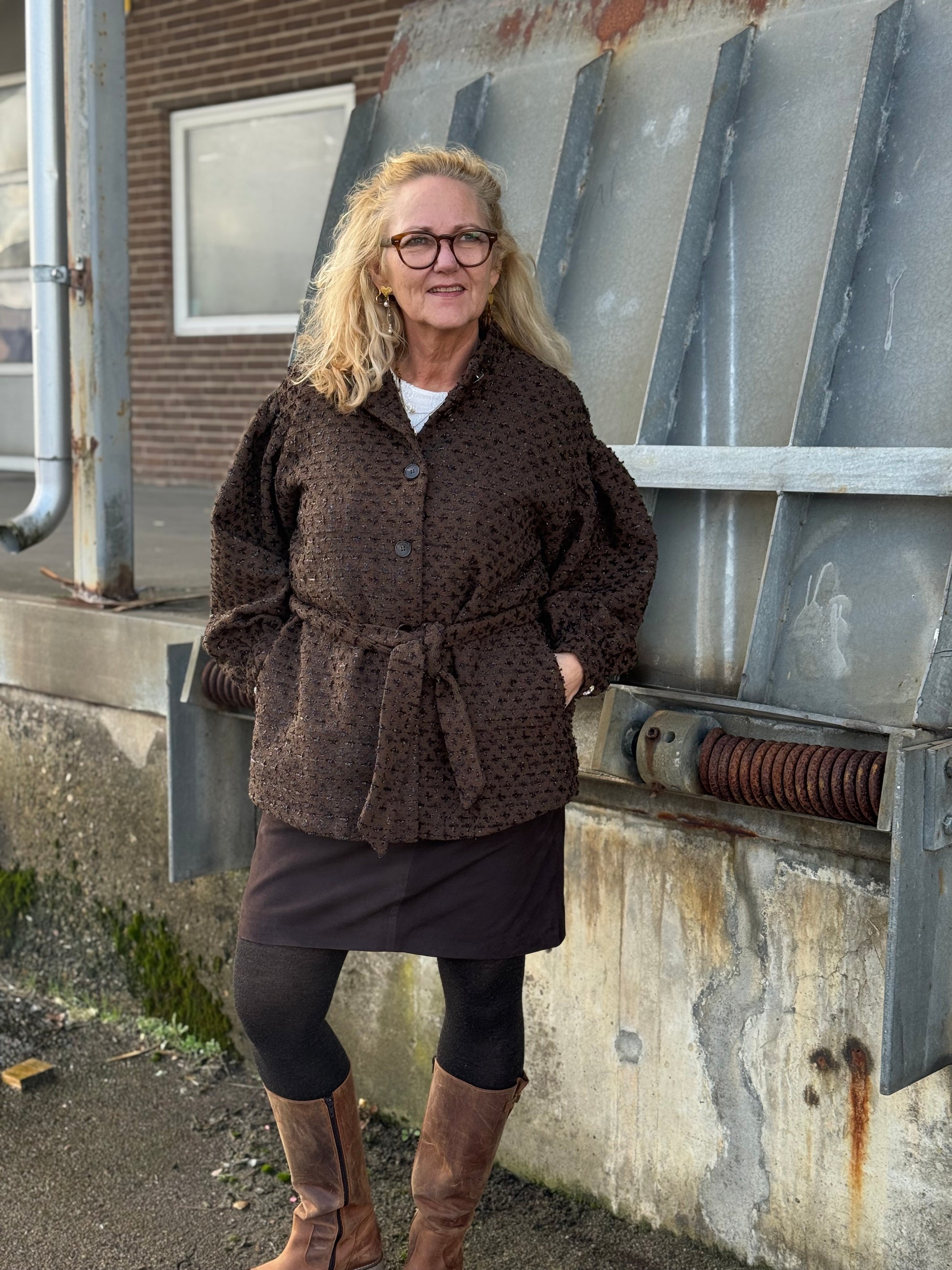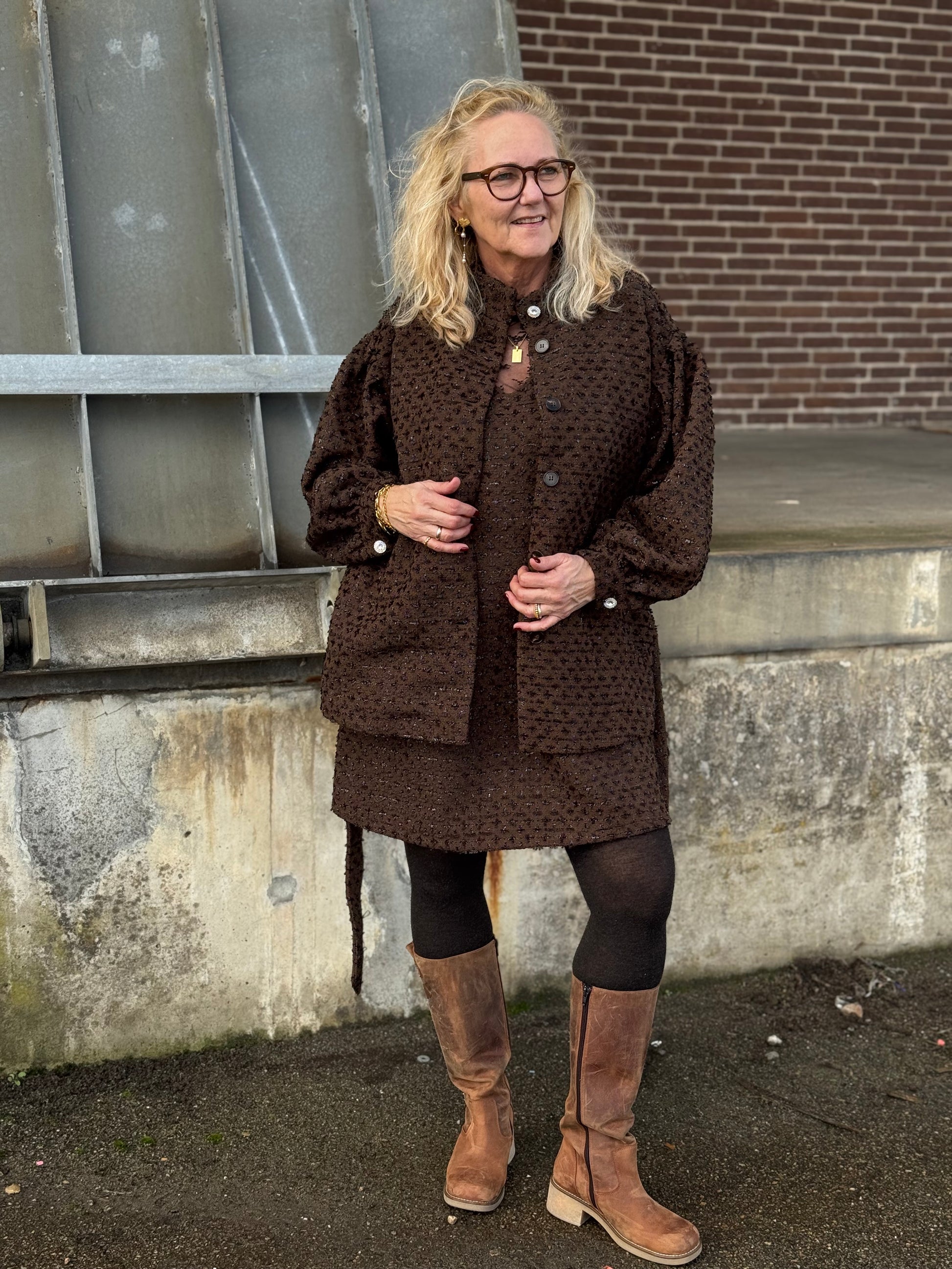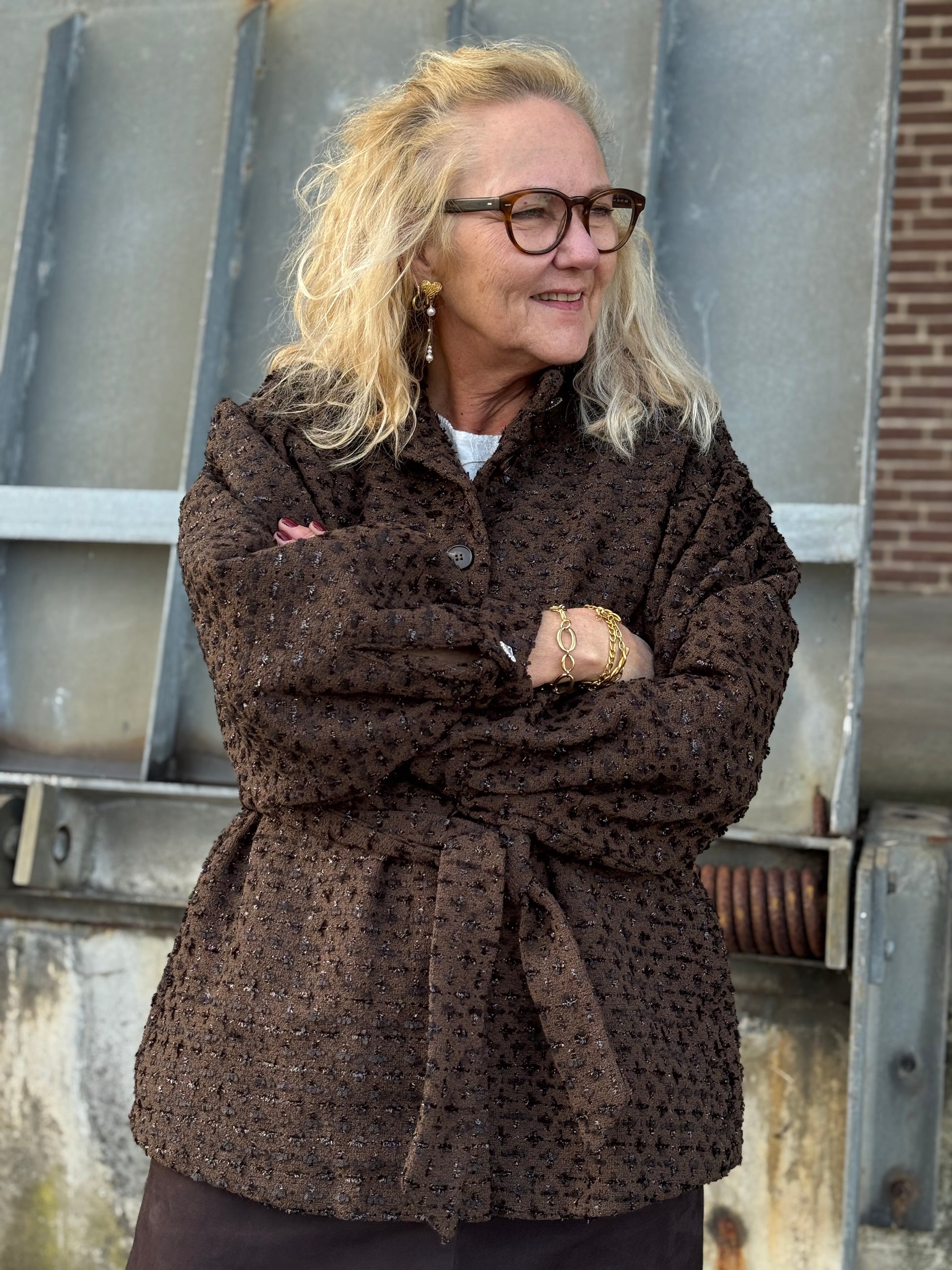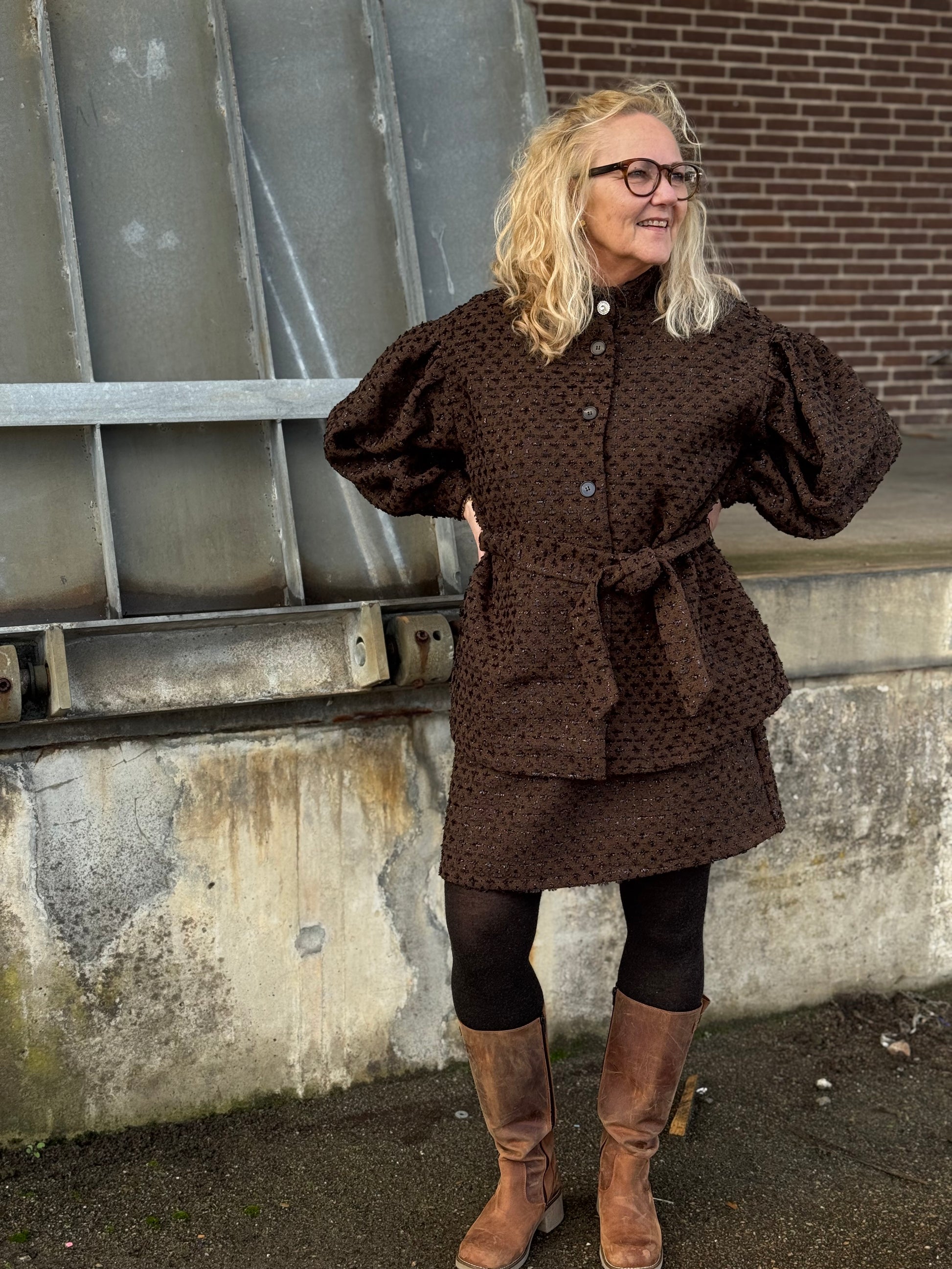 Denne lækre jakke kan redde en hver tøjkrise - Jakken er i det smukkeste brune stof med sorte glimmertråde. Jakken har en lille høj hals og er gennemknappet med sorte knapper mens den øverste er en glimmerknap. Ærmerne har et smule balloneffekt og afsluttes med en lille manchet.