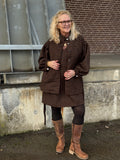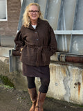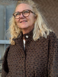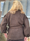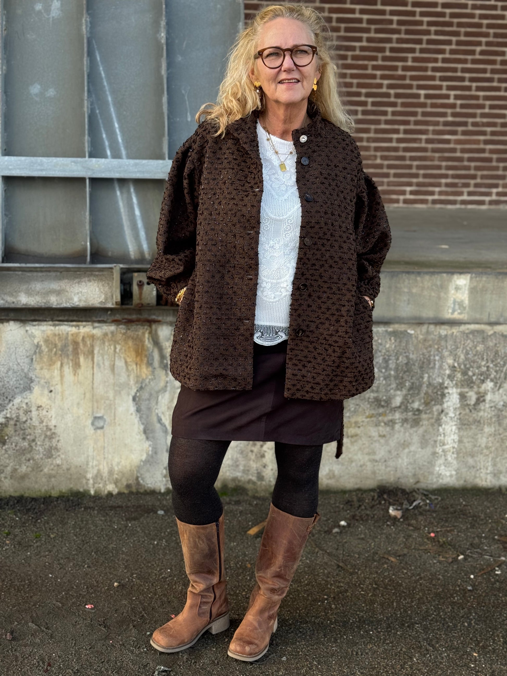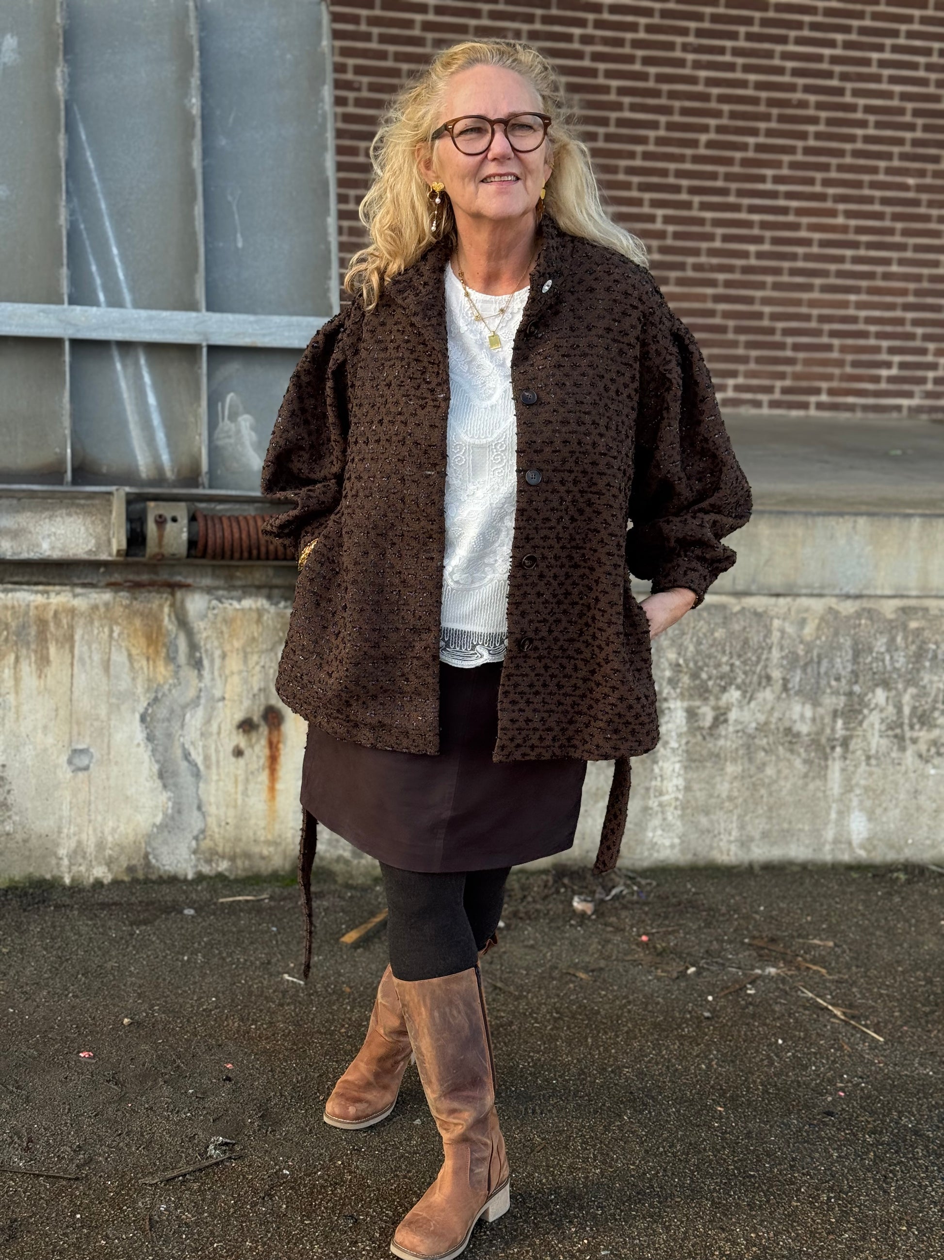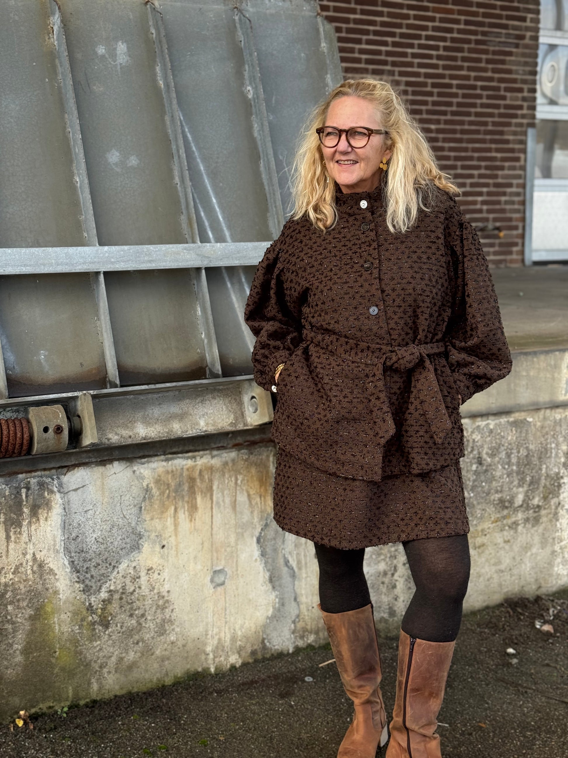 Denne lækre jakke kan redde en hver tøjkrise - Jakken er i det smukkeste brune stof med sorte glimmertråde. Jakken har en lille høj hals og er gennemknappet med sorte knapper mens den øverste er en glimmerknap. Ærmerne har et smule balloneffekt og afsluttes med en lille manchet.
