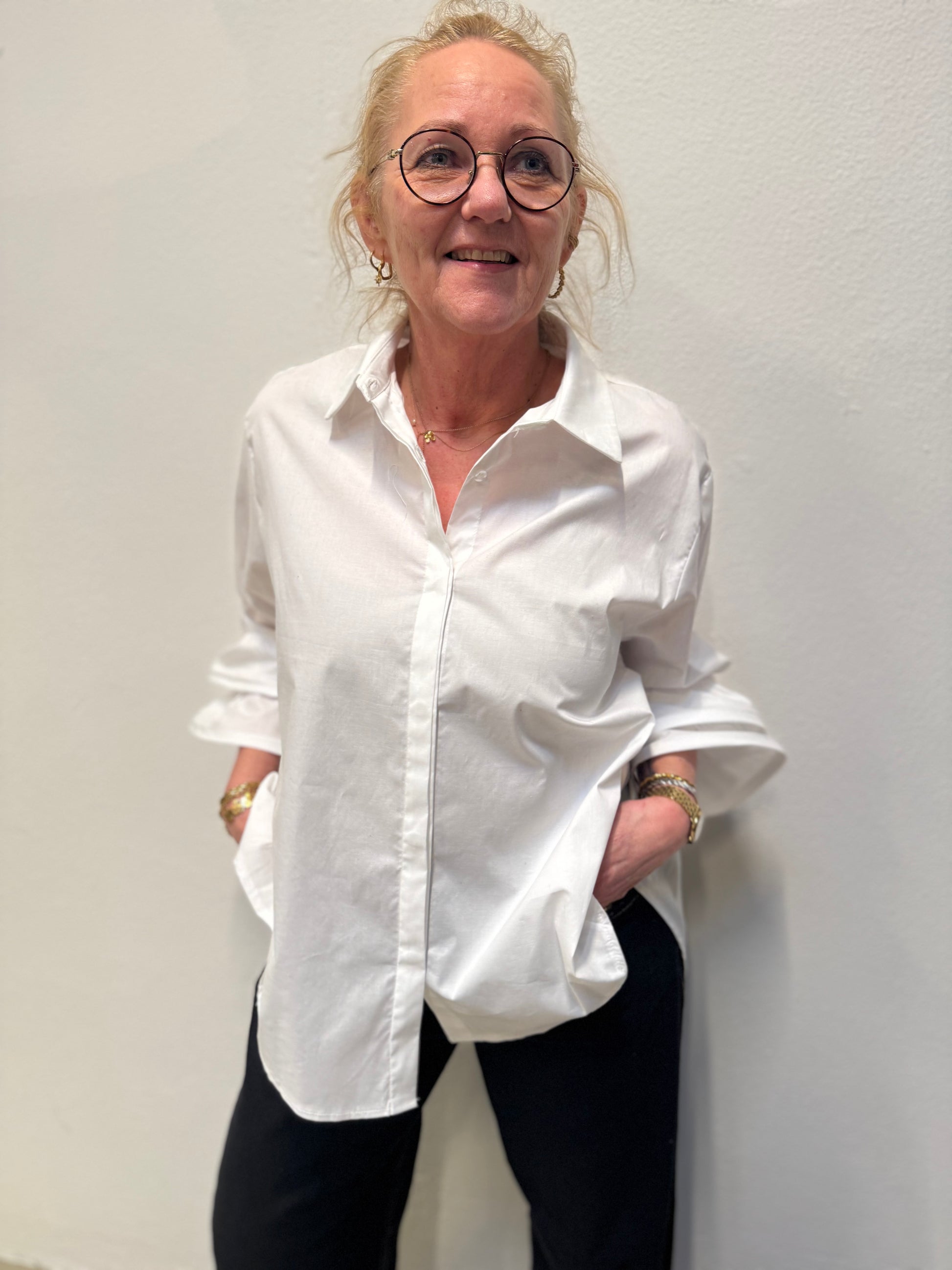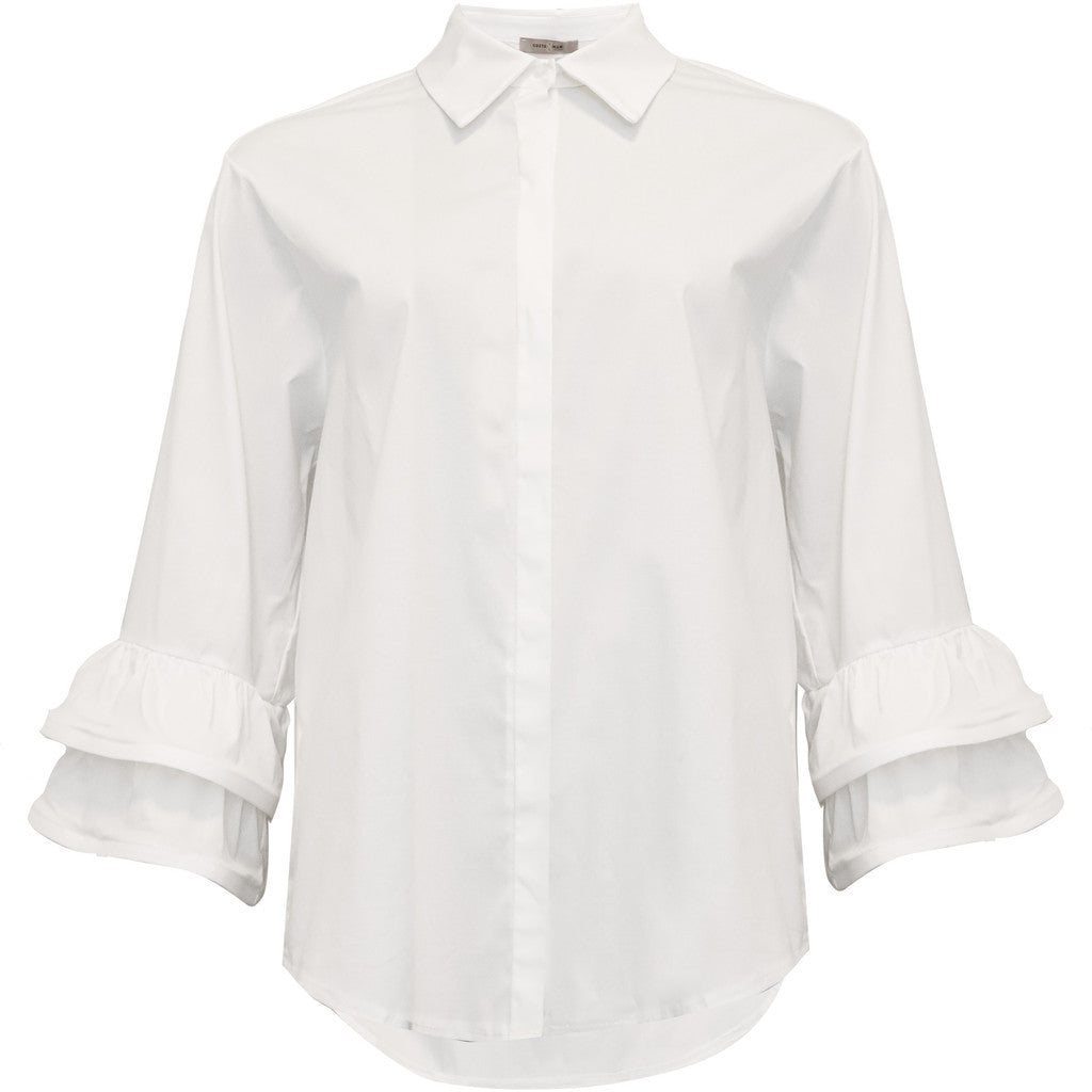 Denne lækre bomuldsskjorte fra Costa mani er mere end bare en klassisk hvid skjorte. Den har en helt klassisk skjortekrave og skjult knaplukning, men som noget ekstra har den trekvart ærmer med "flæse" lag som afslutning. Den er en lille smule længere bagpå end foran.