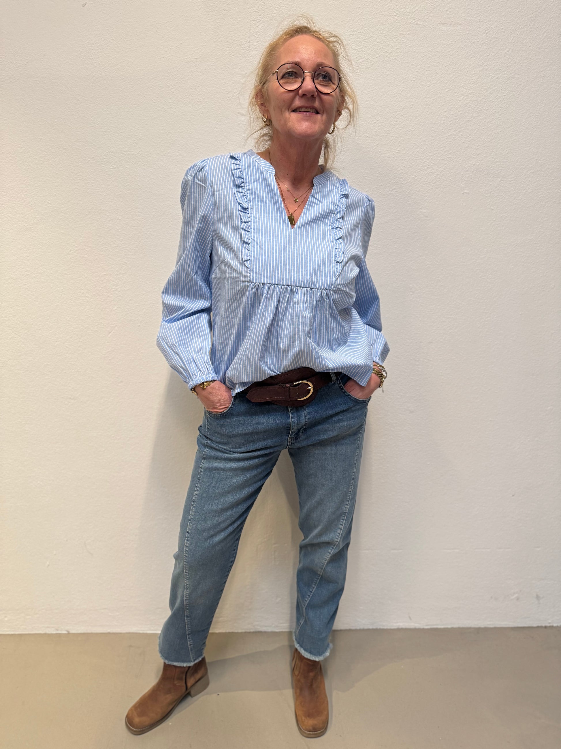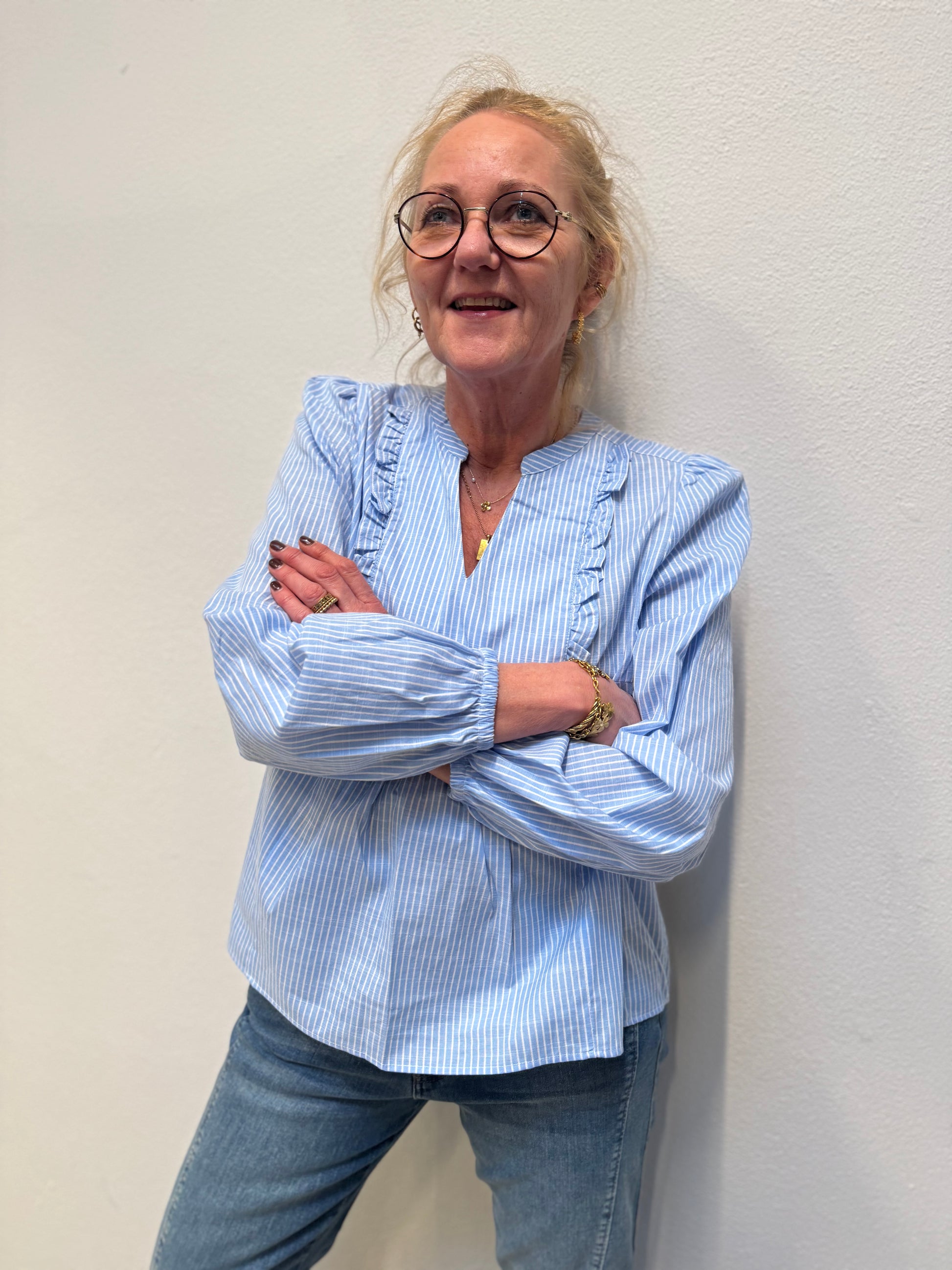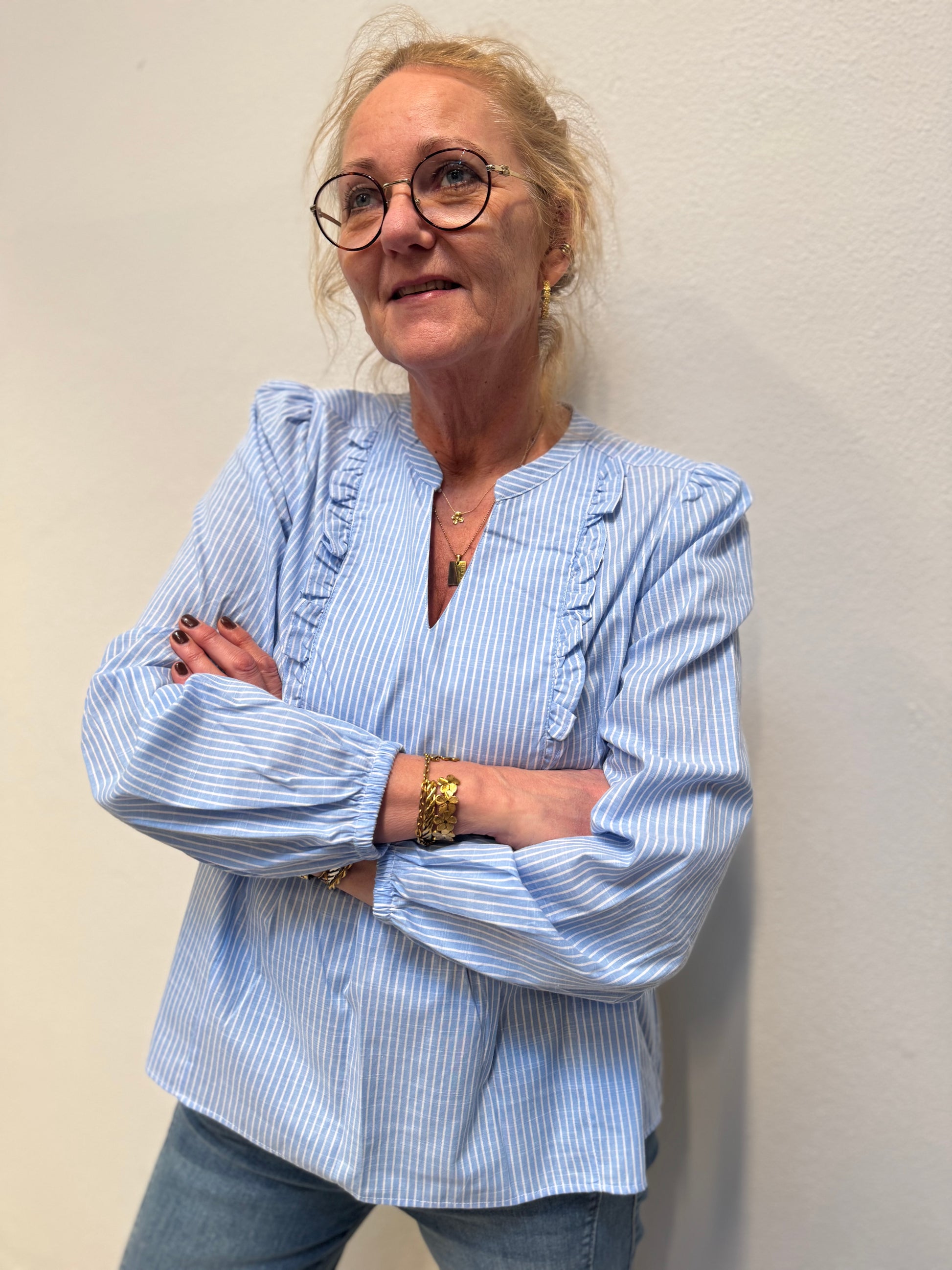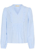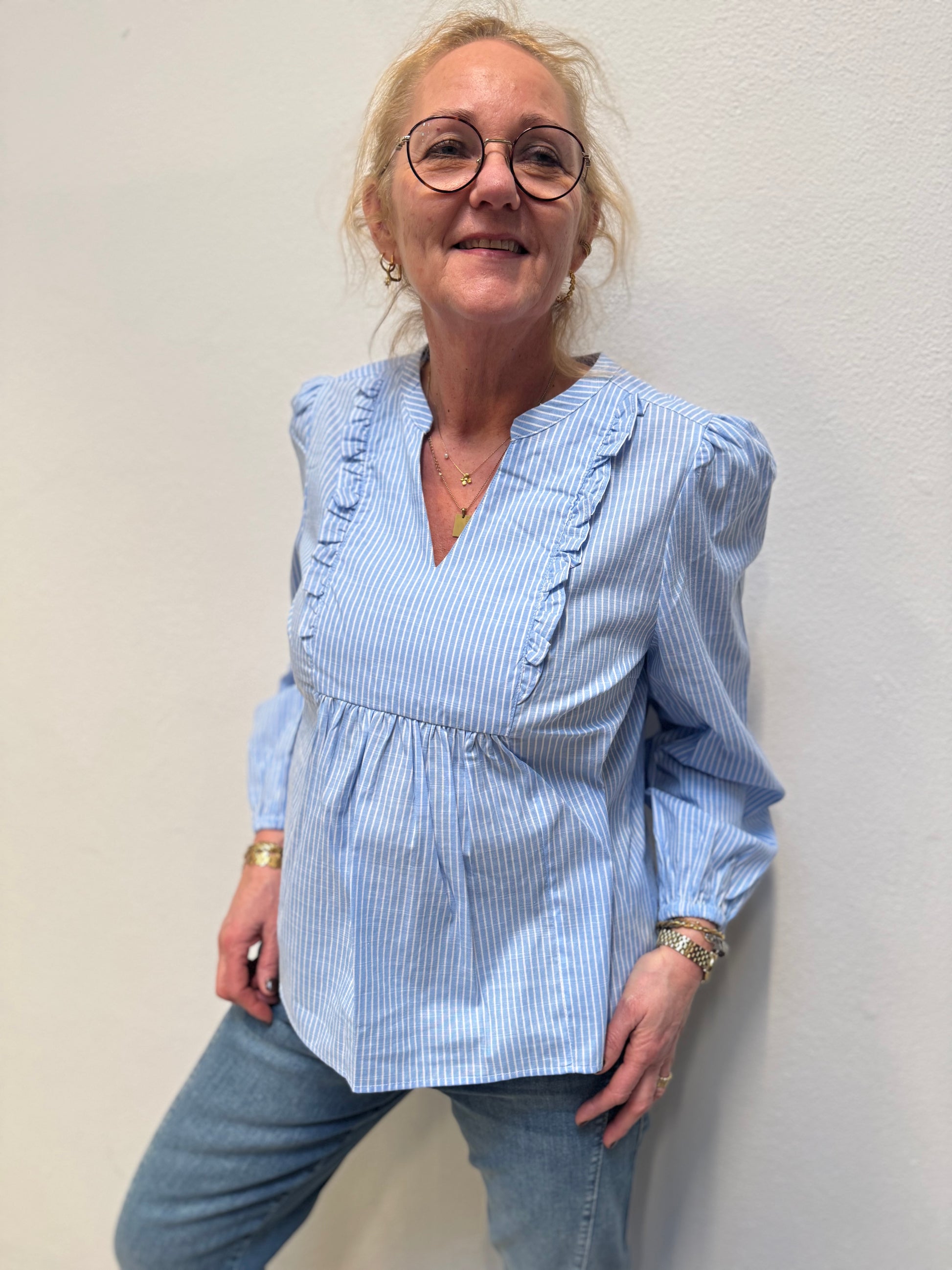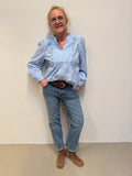 Denne fine bluse stribet bluse fra Cream er et must have. Blusen har en fin lille V-udskæring, med fine flæser i siderne og et lille puf på skulderen. Dens ærmer afsluttes med en lille elastik, som giver en fint touch.