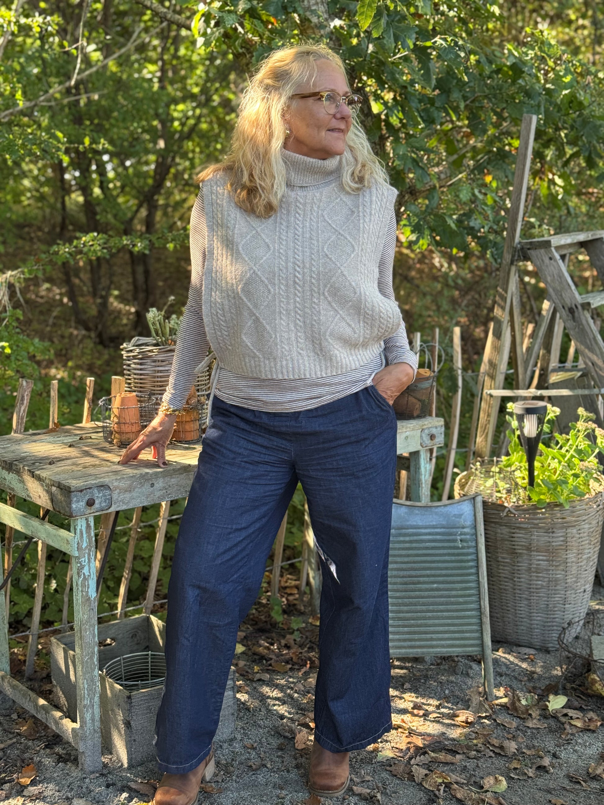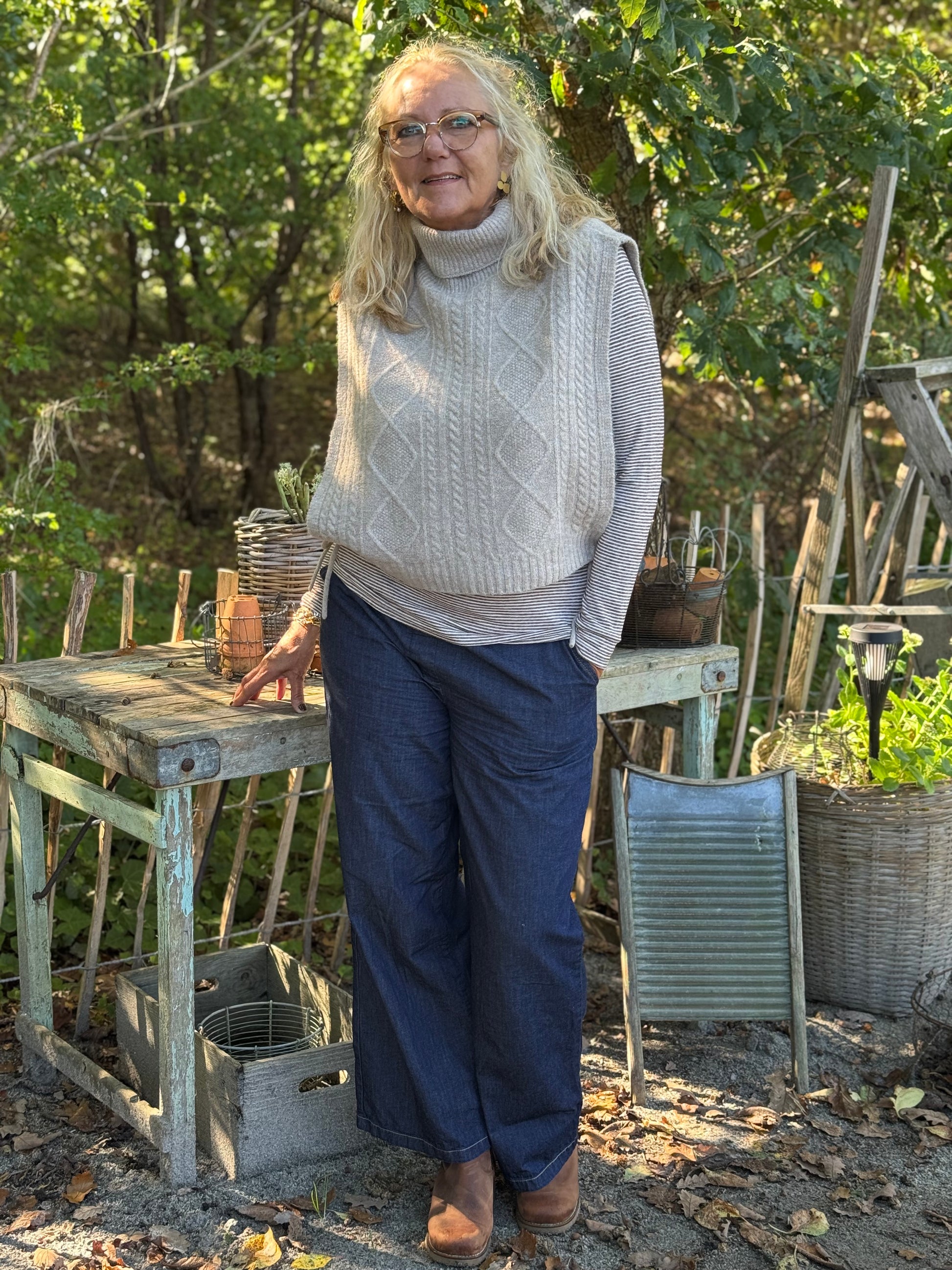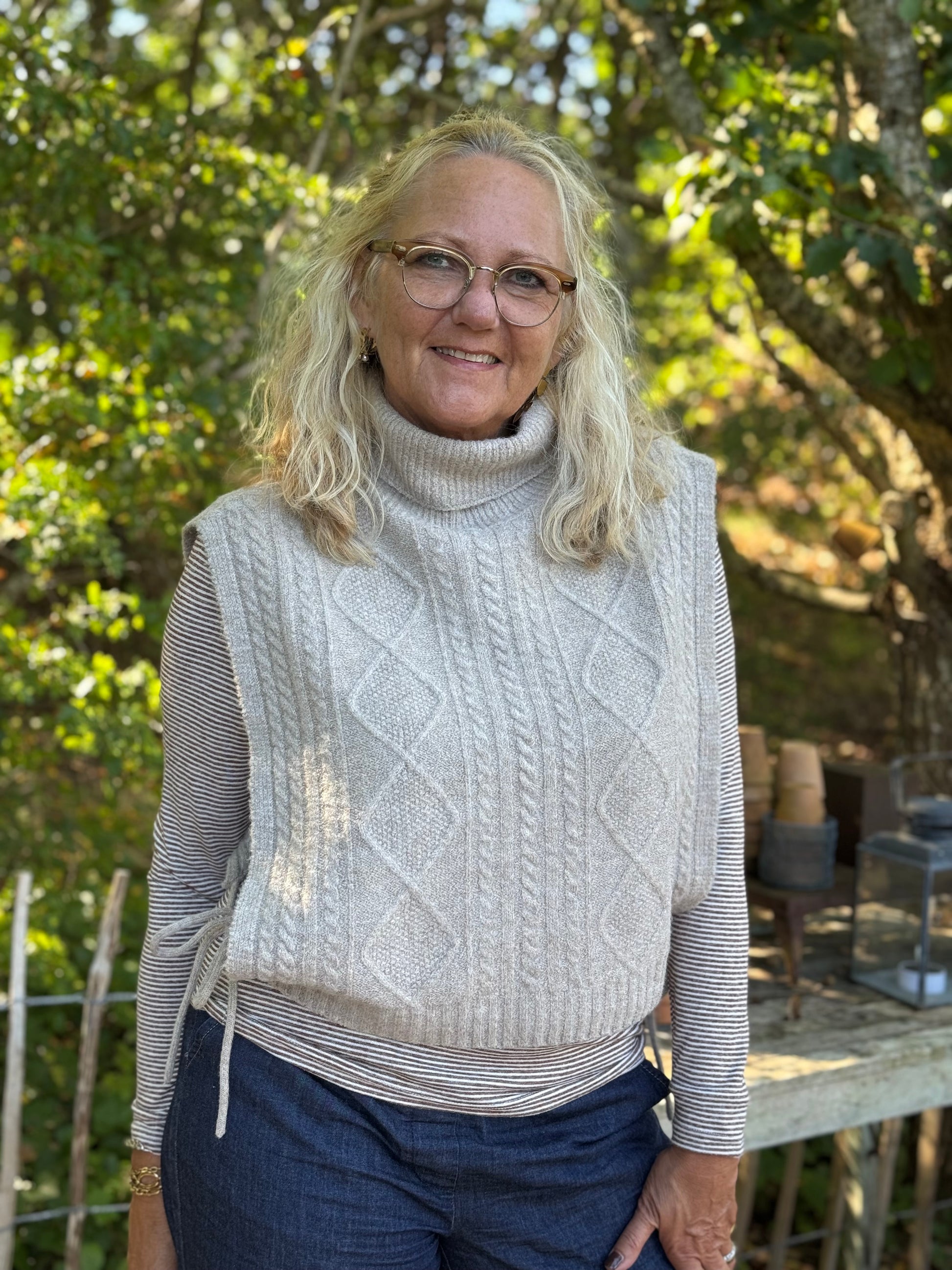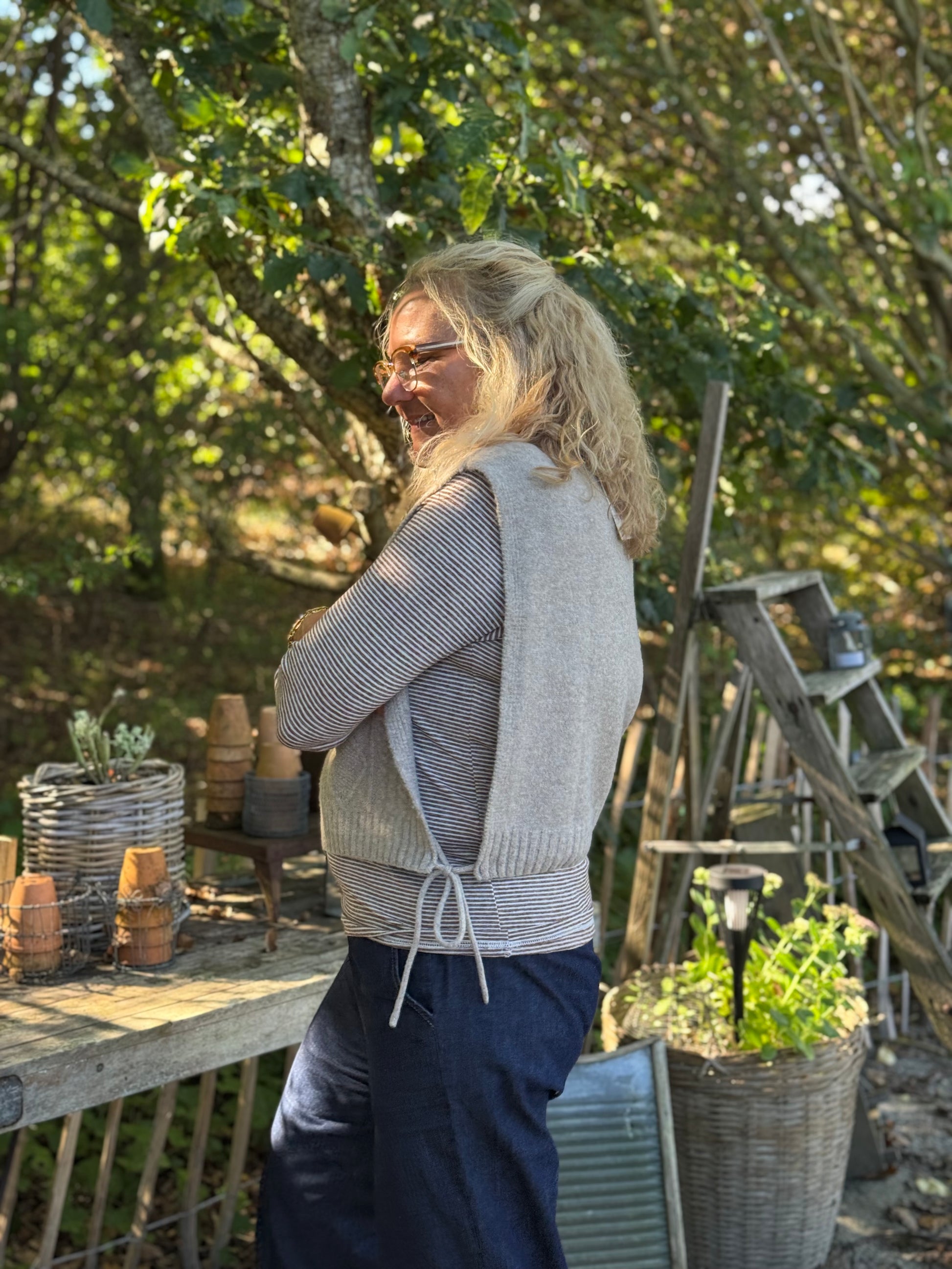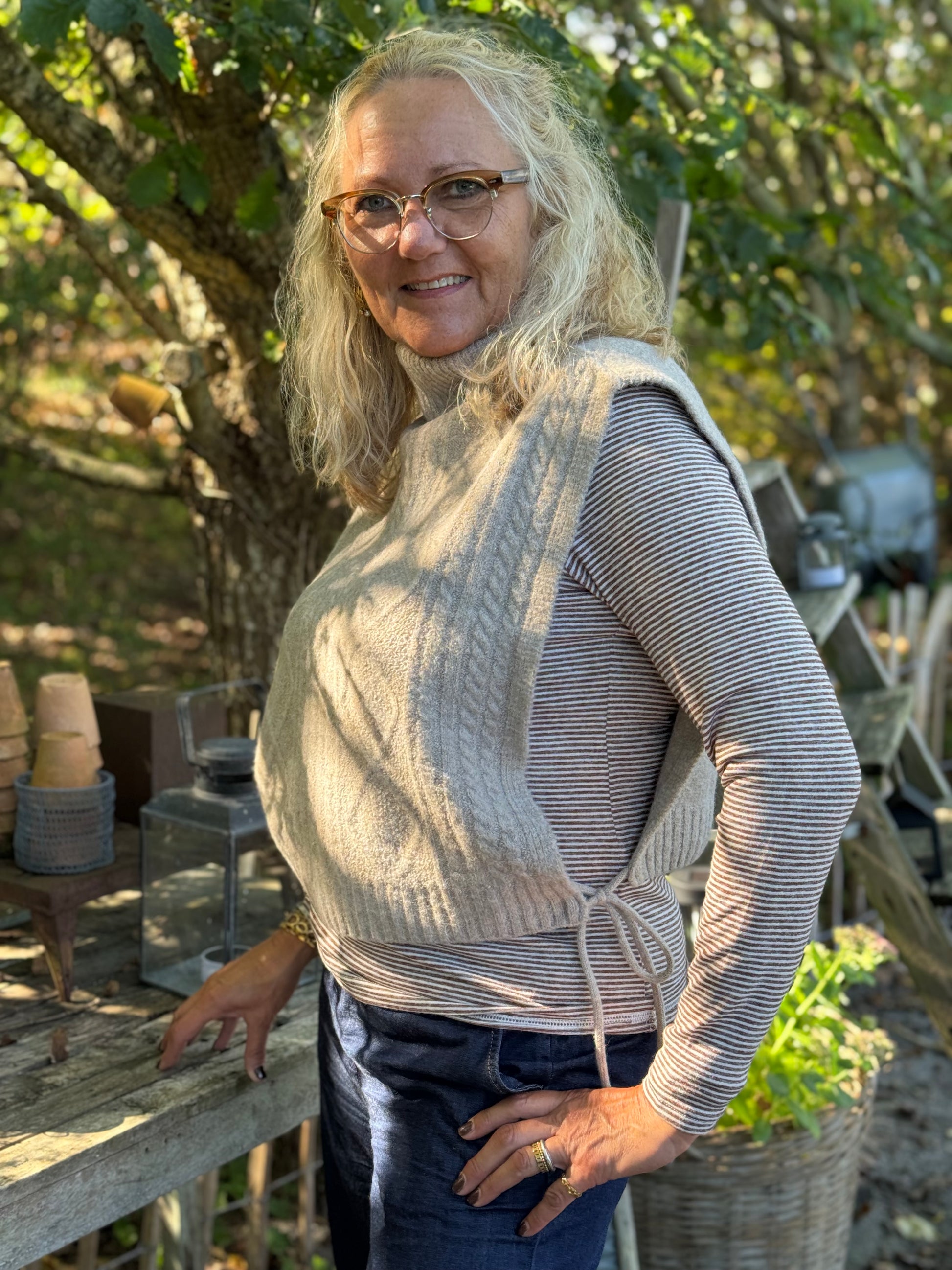 Smart strik vest Cream, som kan pifte et hver outfit op. Vesten er i det lækreste strik, har en halvhøj hals og bindes i siderne.