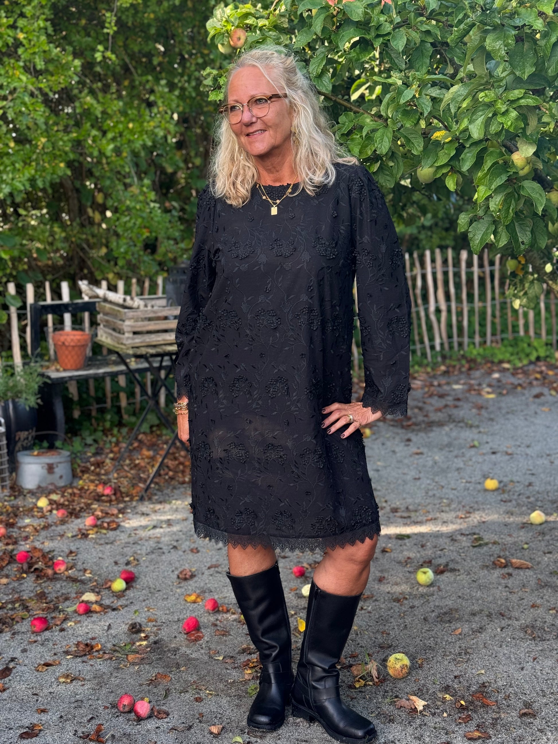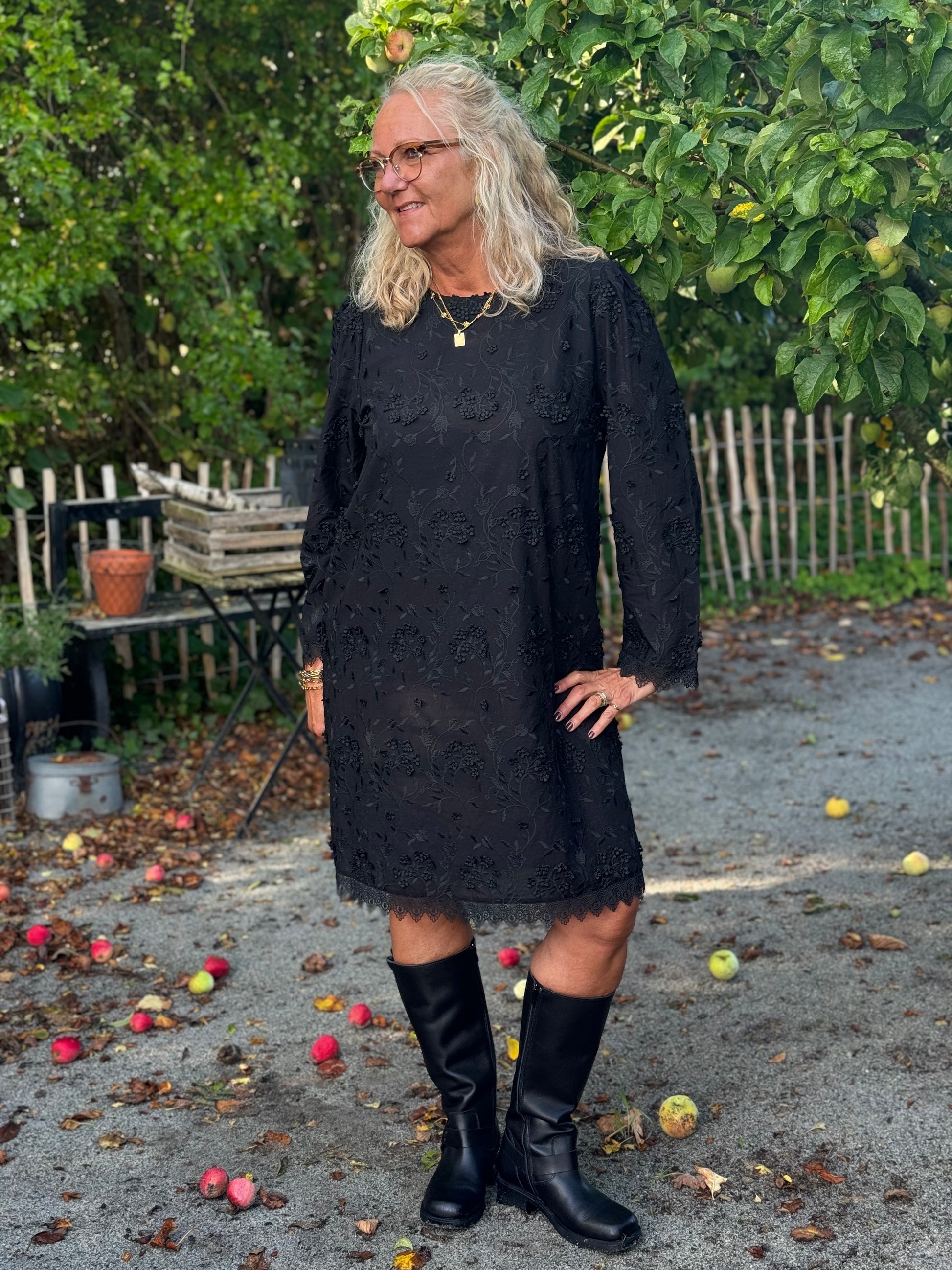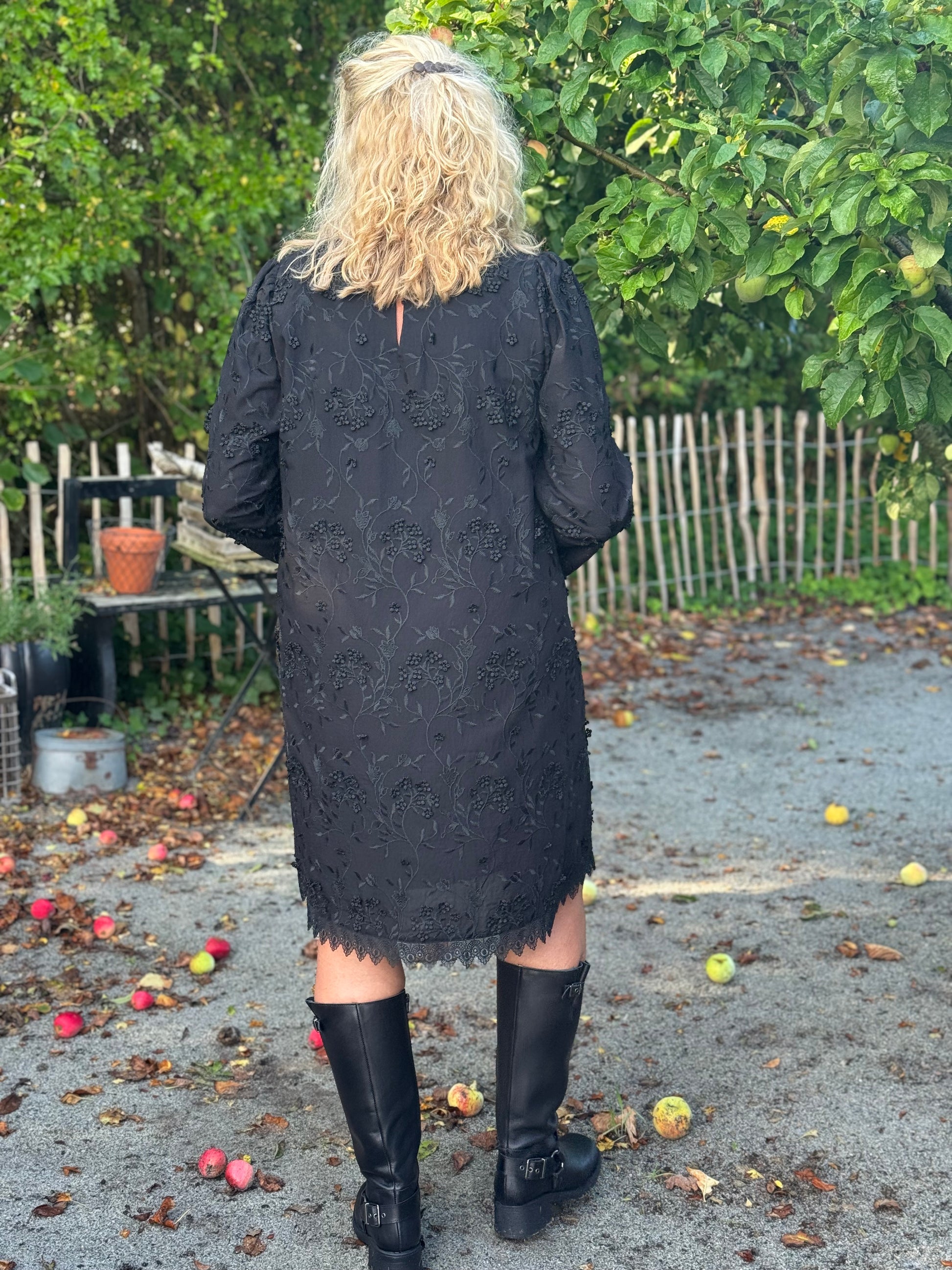 En sort kjole kan redde en hver tøjkrise og denne er ingen undtagelse. Kjolen har det smukkeste print i stoffet og blonde på ærmet og i bunden. Den har en find rundhals og lukkes med en knap bagpå.