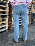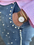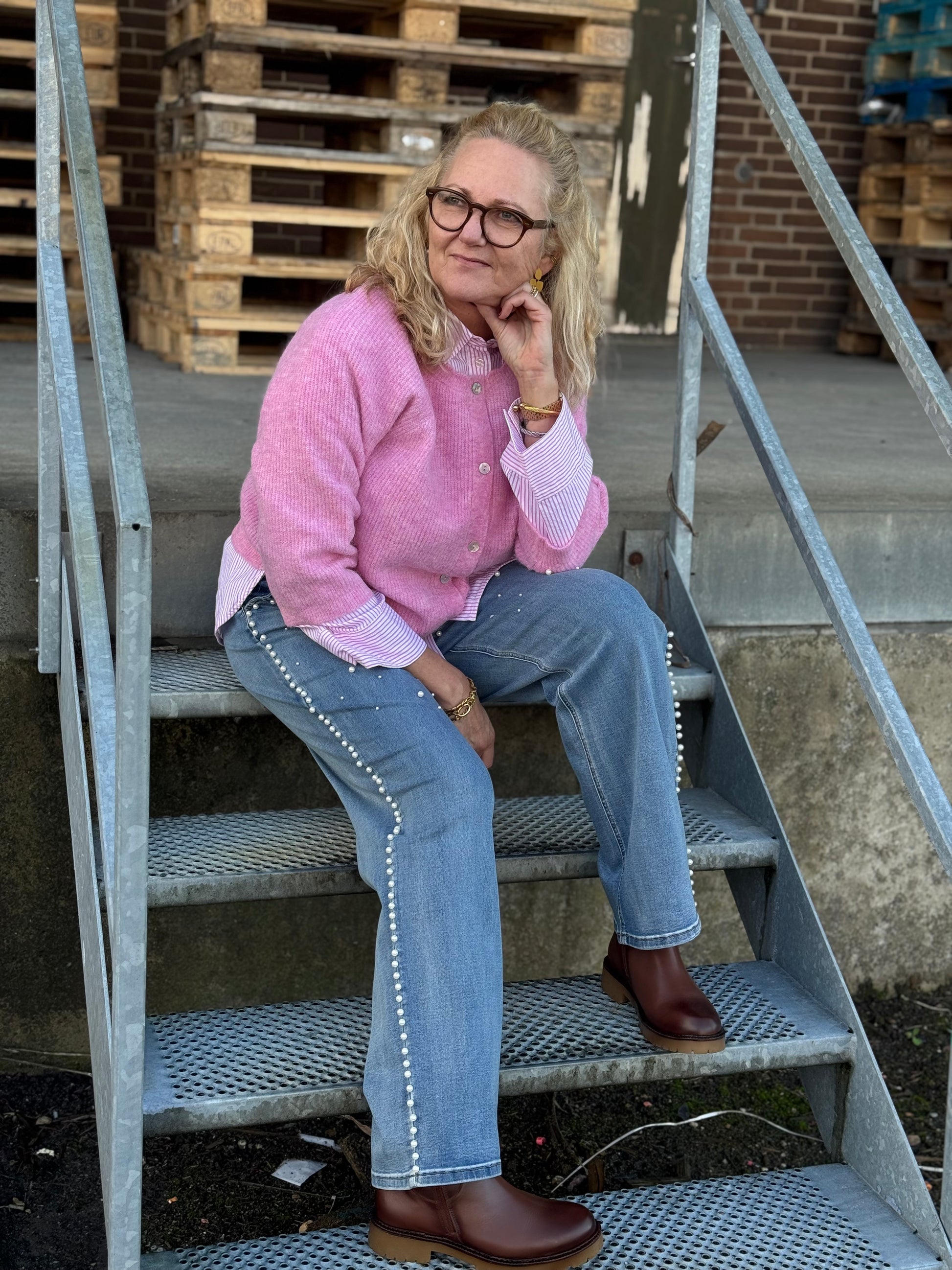 Denne super cool jeans fra Cream er dekoreret med perler ned langs siden og foran. Jeansene er med fast højtaljet linning med bæltestropper og skjult knaplukning. Benene er straight med fuld længde, og så er der skrålommer i siden.