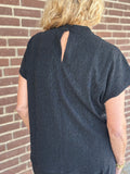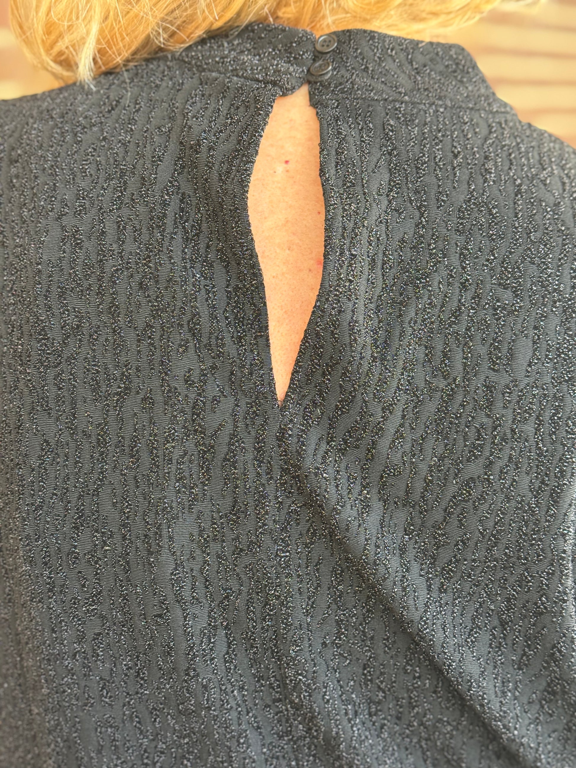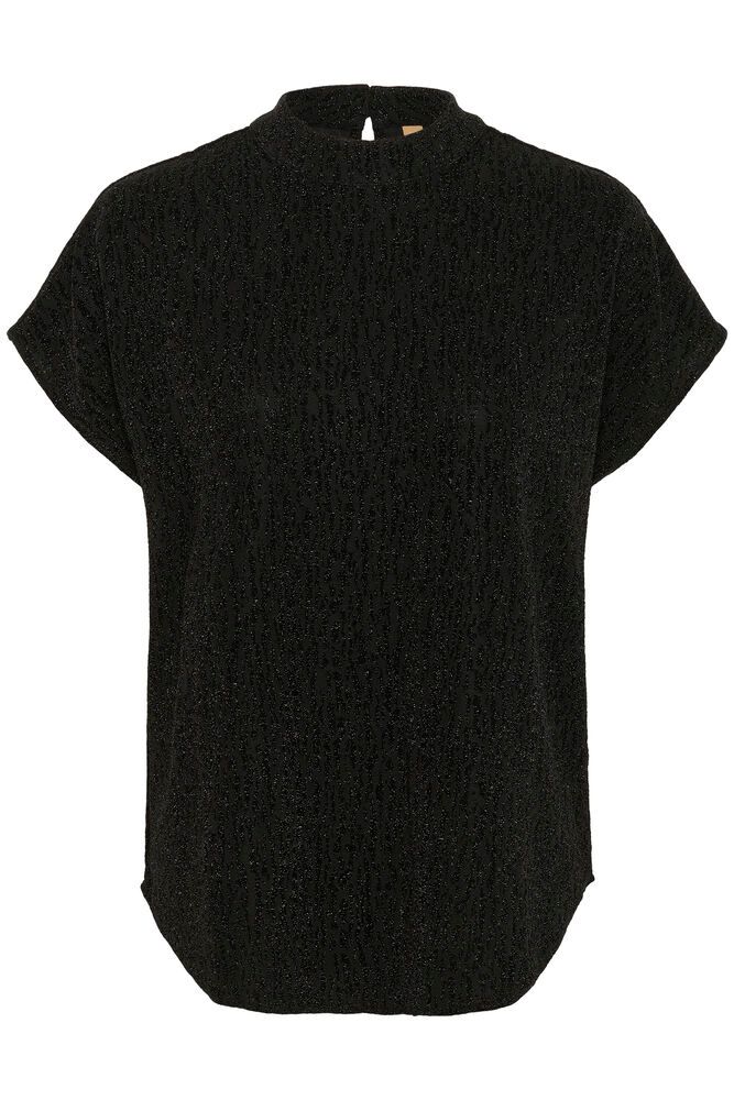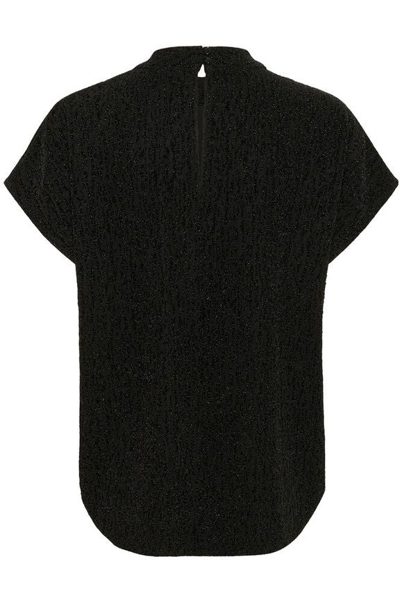 Denne fine kortærmet bluse fra Culture er lidt ekstra med den fine metaltråd. Blusen har en lille høj hals, som lukkes med en enkelt knap bag på.