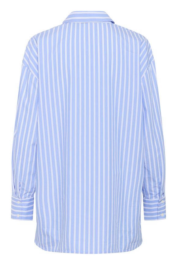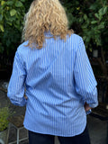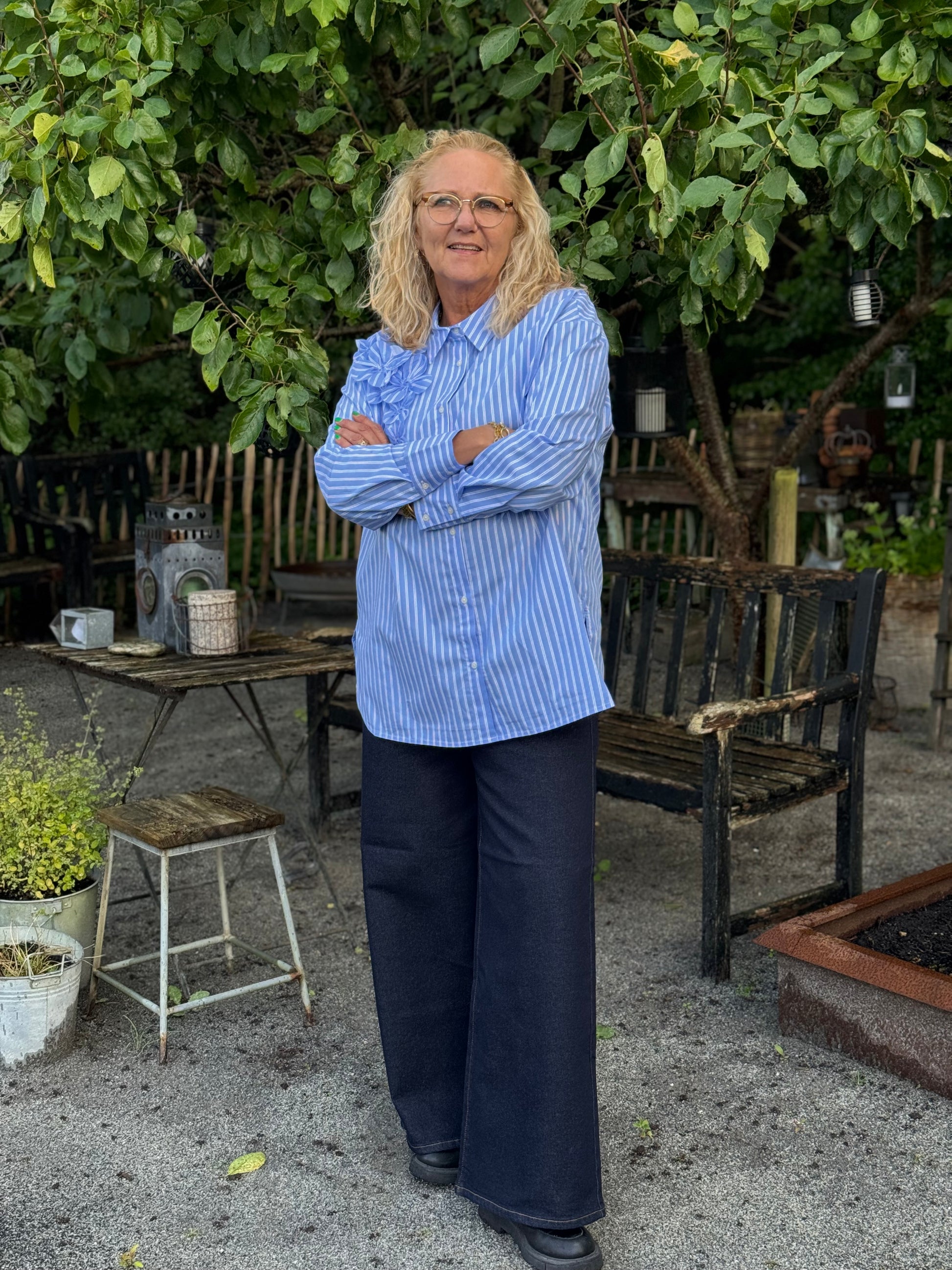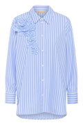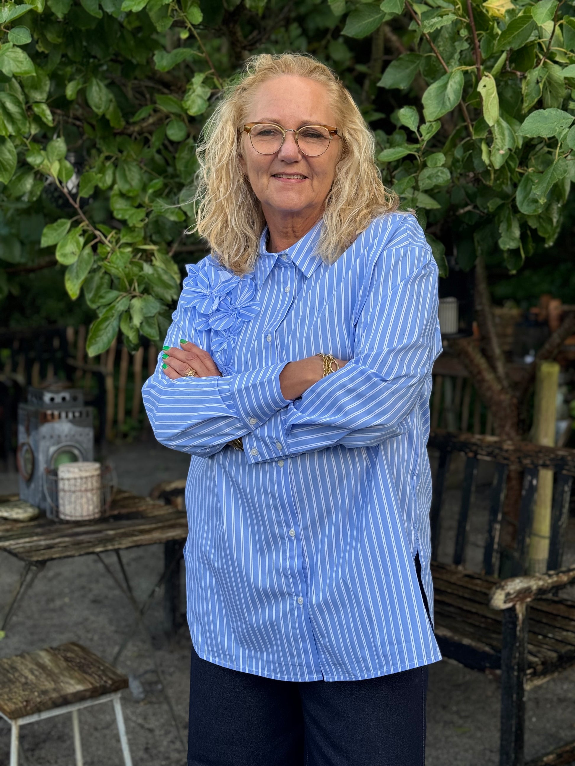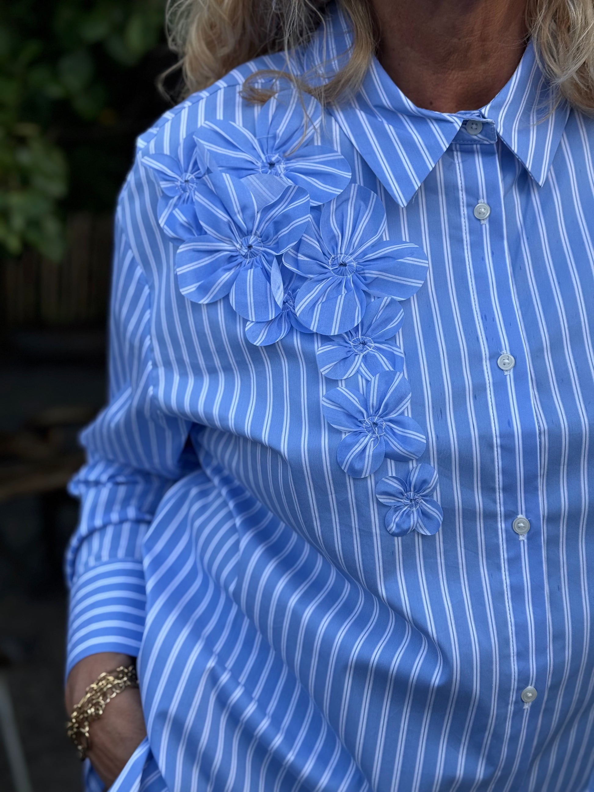 Denne smukke stribet bluse fra Culture er et must have. Blusen har en klassisk skjortekrave og knaplukning. Som en fin detalje har den påsyet de smukkeste stof blomster fra den ene skuldre og ned på brystet.