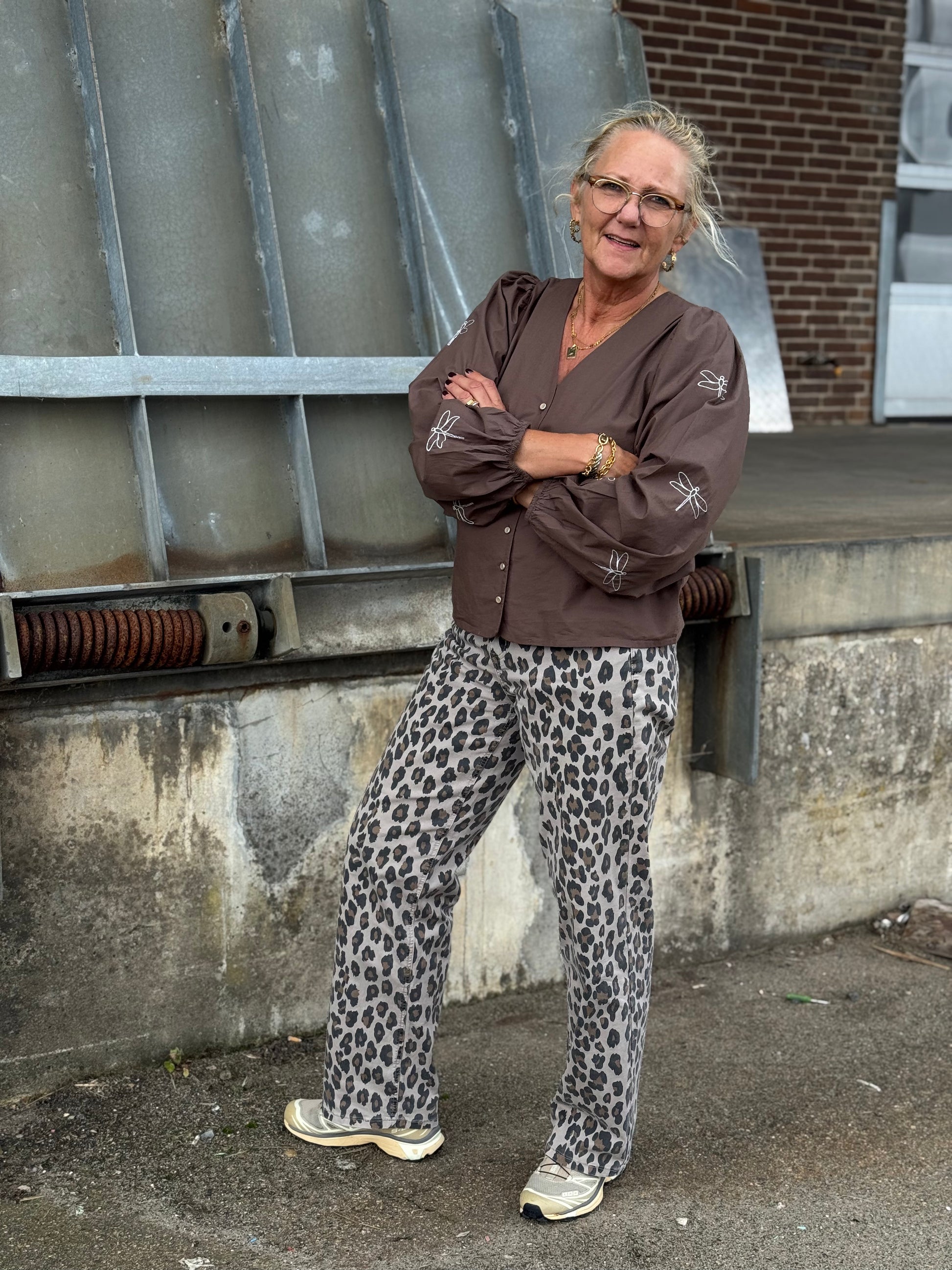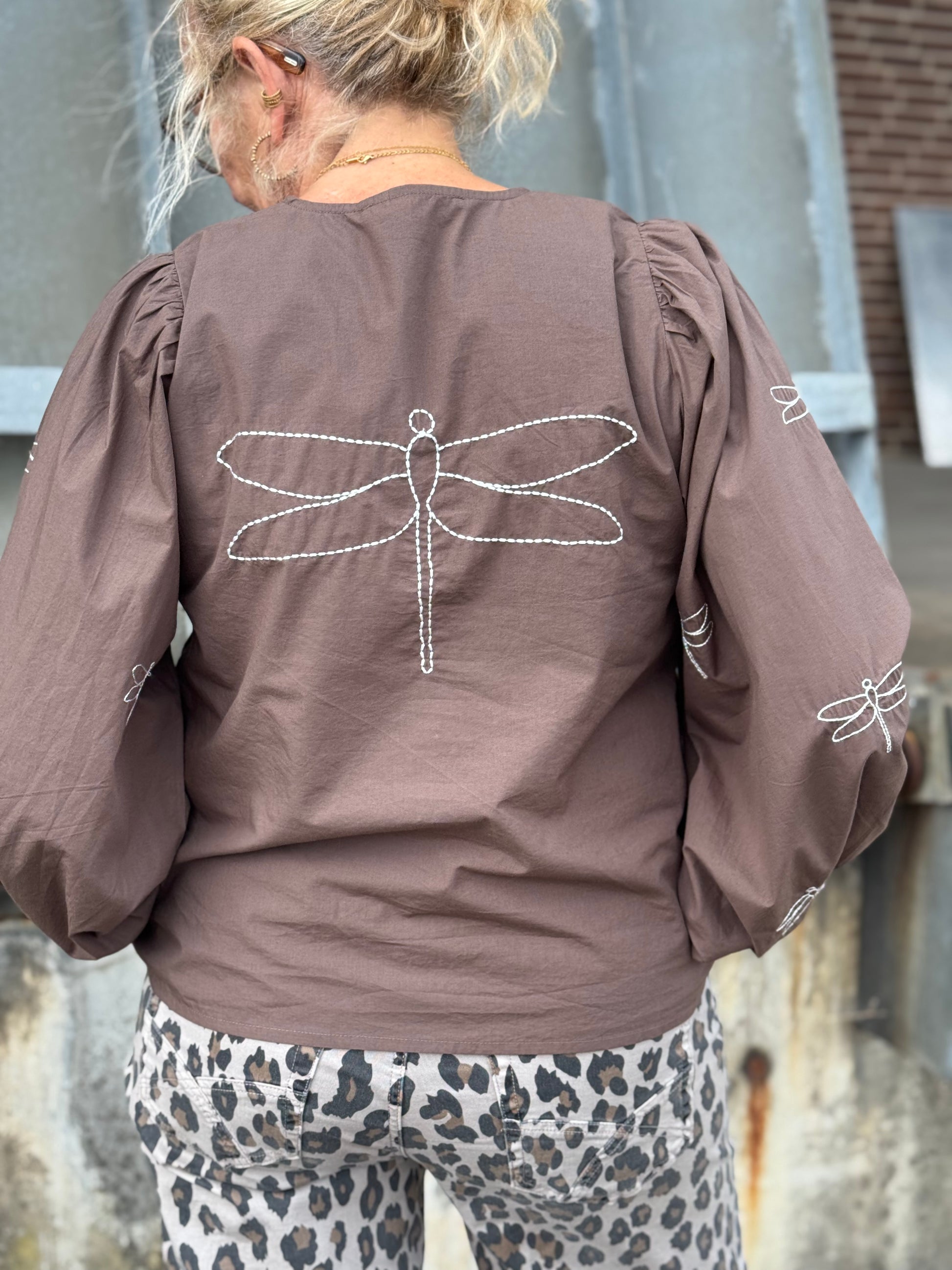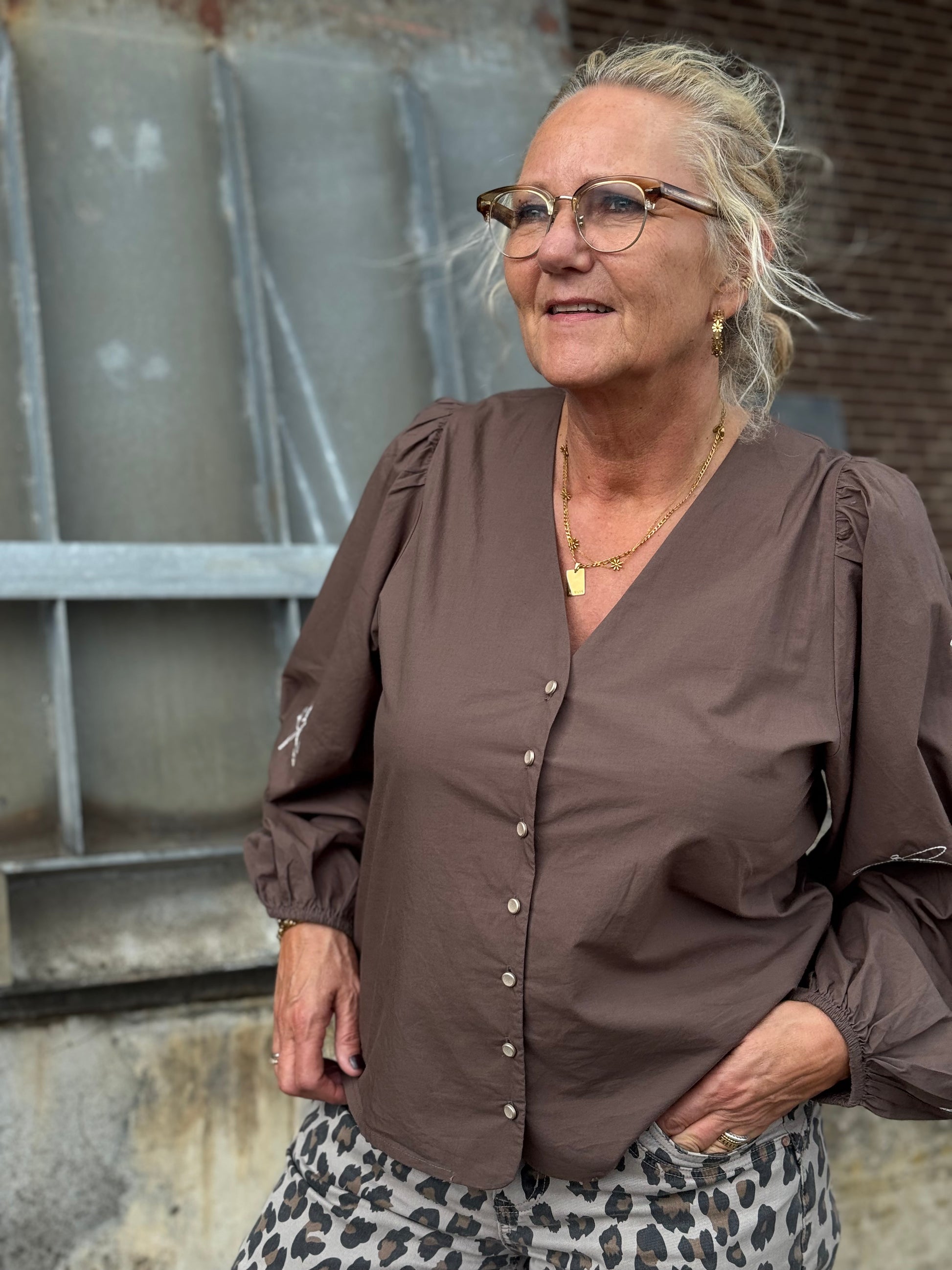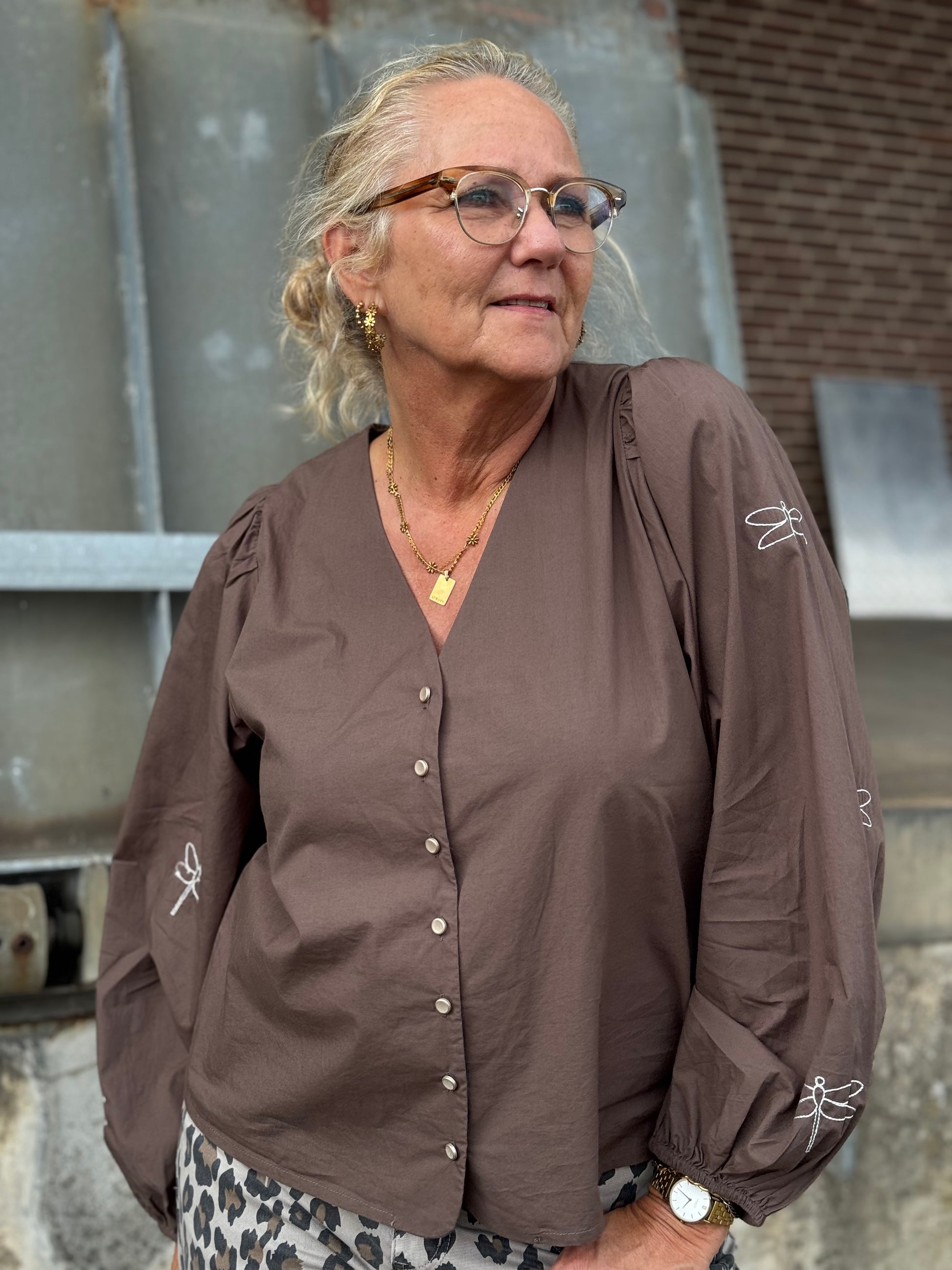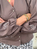 Denne fine skjorte fra Gaspar er fyldt med de fineste detaljer som den lille guldsmeden som er broderet forskellige steder på skjorten. Skjorten har v-udskæring og synlige gyldne knapper. Ærmet afsluttes med en lille elastik, som giver ballon effekt.