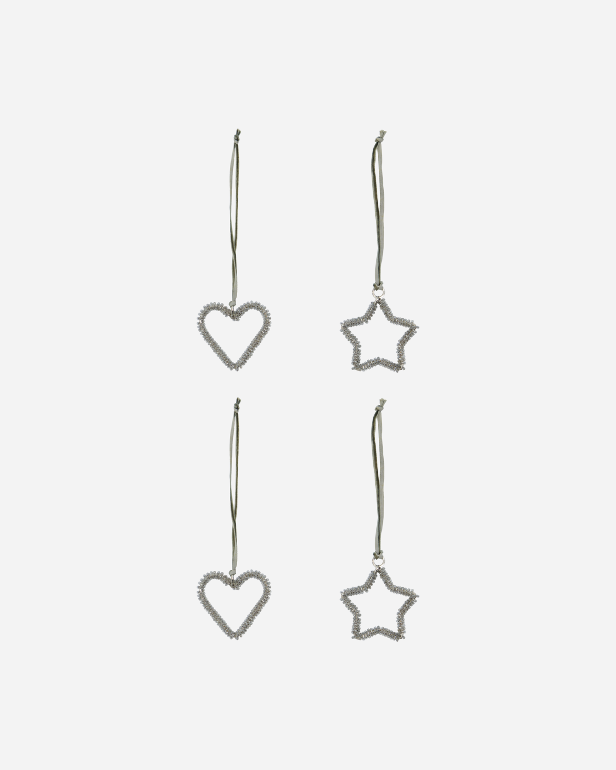 Skab magien omkring julen med disse fine ornamenter fra House Doctor. Ornamenterne er besat af sølvfarvet glasperler, som giver et fint og funklende glimt. Sættet indeholder 2 hjerter og 2 stjerner.