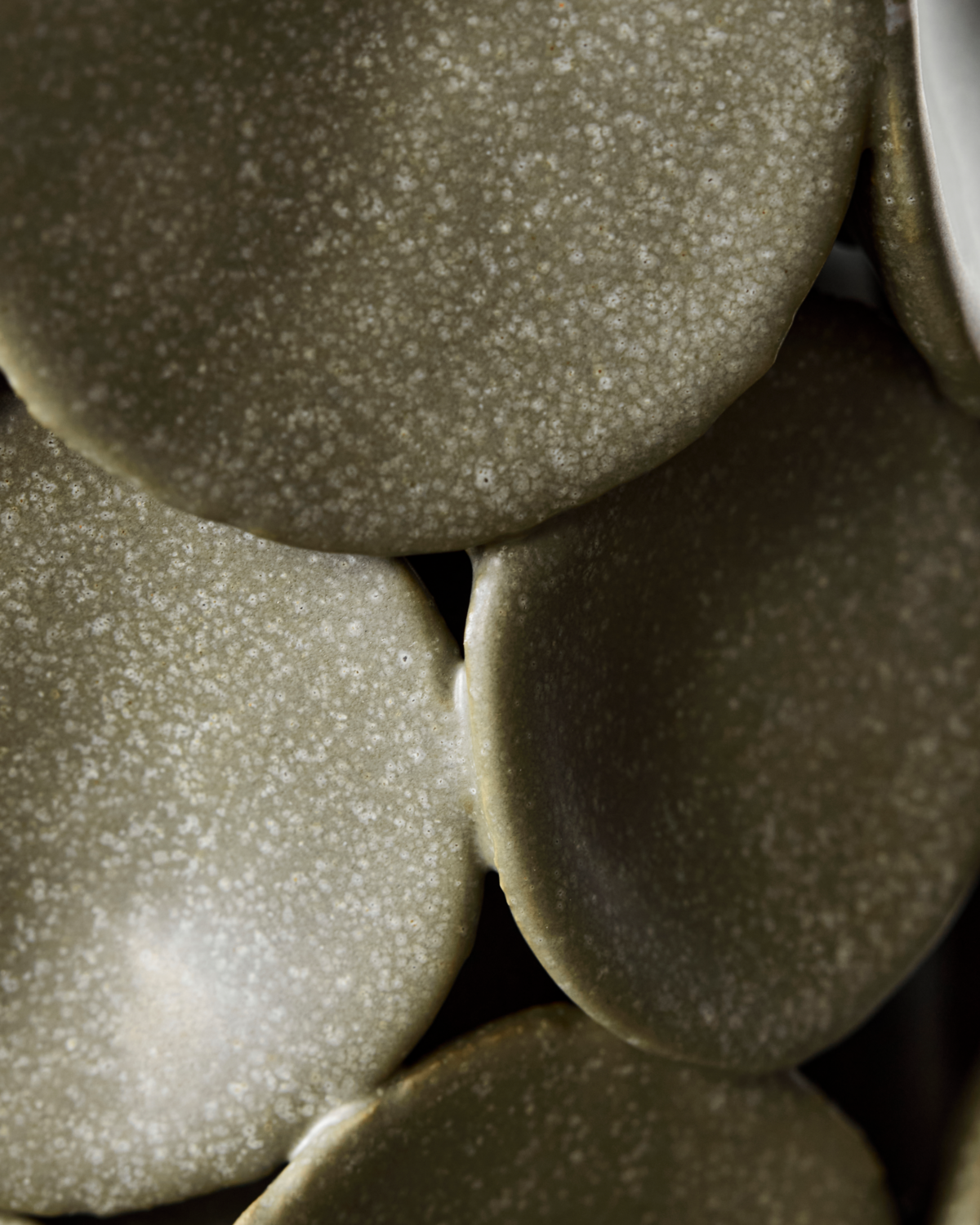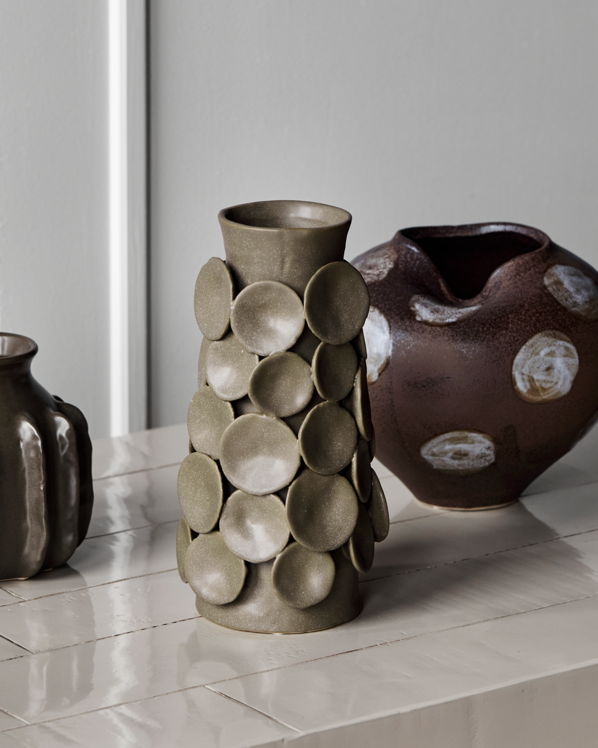 Skab et skulpturelt udtryk med denne kunstneriske stoneware-vase fra House Doctor med cirkulære elementer påsat. Vasen er håndlavet og har en mat khaki-nuance som fremhæver detaljerne.