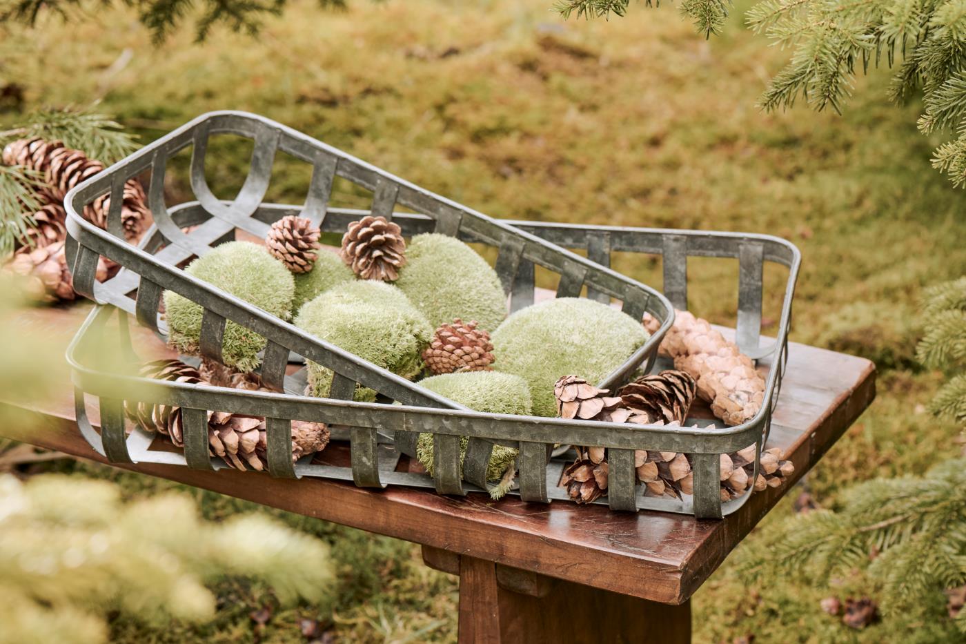Denne lækre zink kurv fra Ib Laursen er perfekt til efterårsdekorationer. Brug den som en dekorativ opbevaring på spisebordet med krukker og lys, eller på en bænk udendørs med mos, kogler og lys.