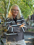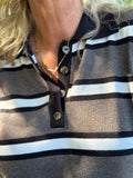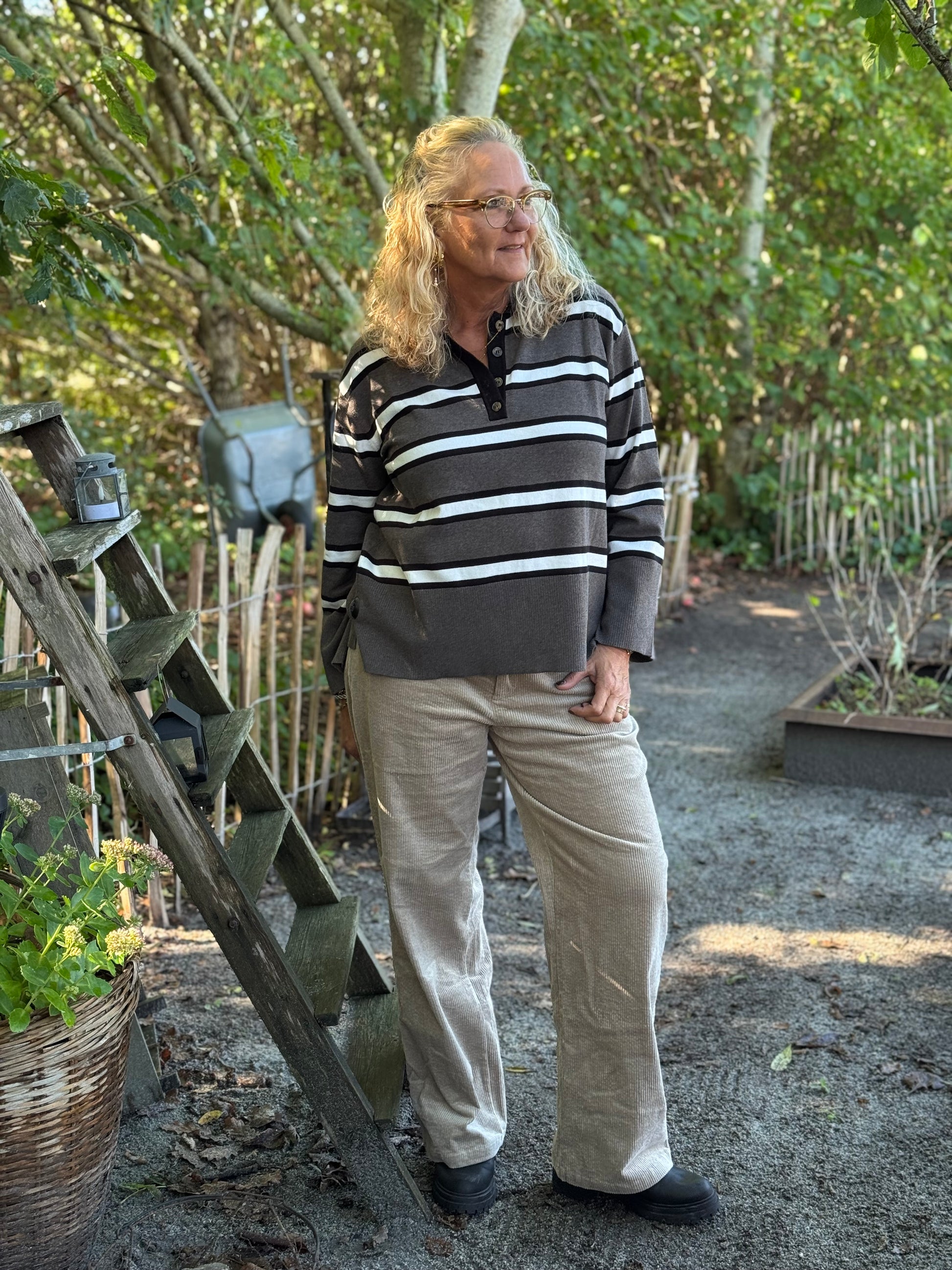Skøn stribet polo bluse i den lækreste bomuldskvalitet kan pifte et hvert outfit op. Den har lange ærmer og klassisk polo hals med krave og stolpelukning med knapper. Ærmerne har en smule vidde, mens der er en slids i siden af blusen.