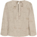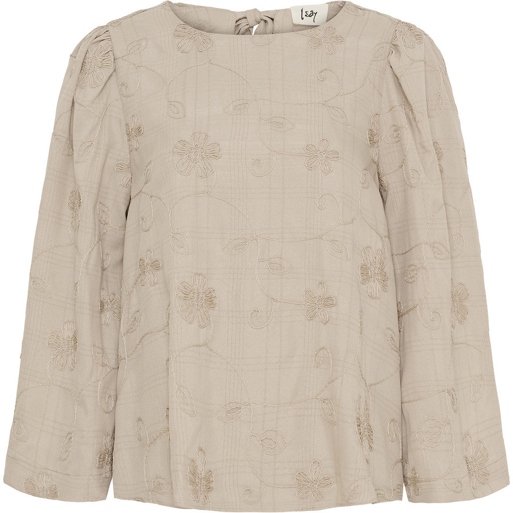 Denne super fine og feminine bluse er et must have til foråret. Blusen har en fin struktur i stoffet med broderier. Den er med rund hals og lukkes i ryggen med et dekorativt bindebånd. På skuldreren er der en let rynkning og ærmerne har en smule vidde.