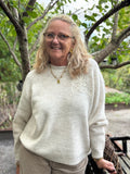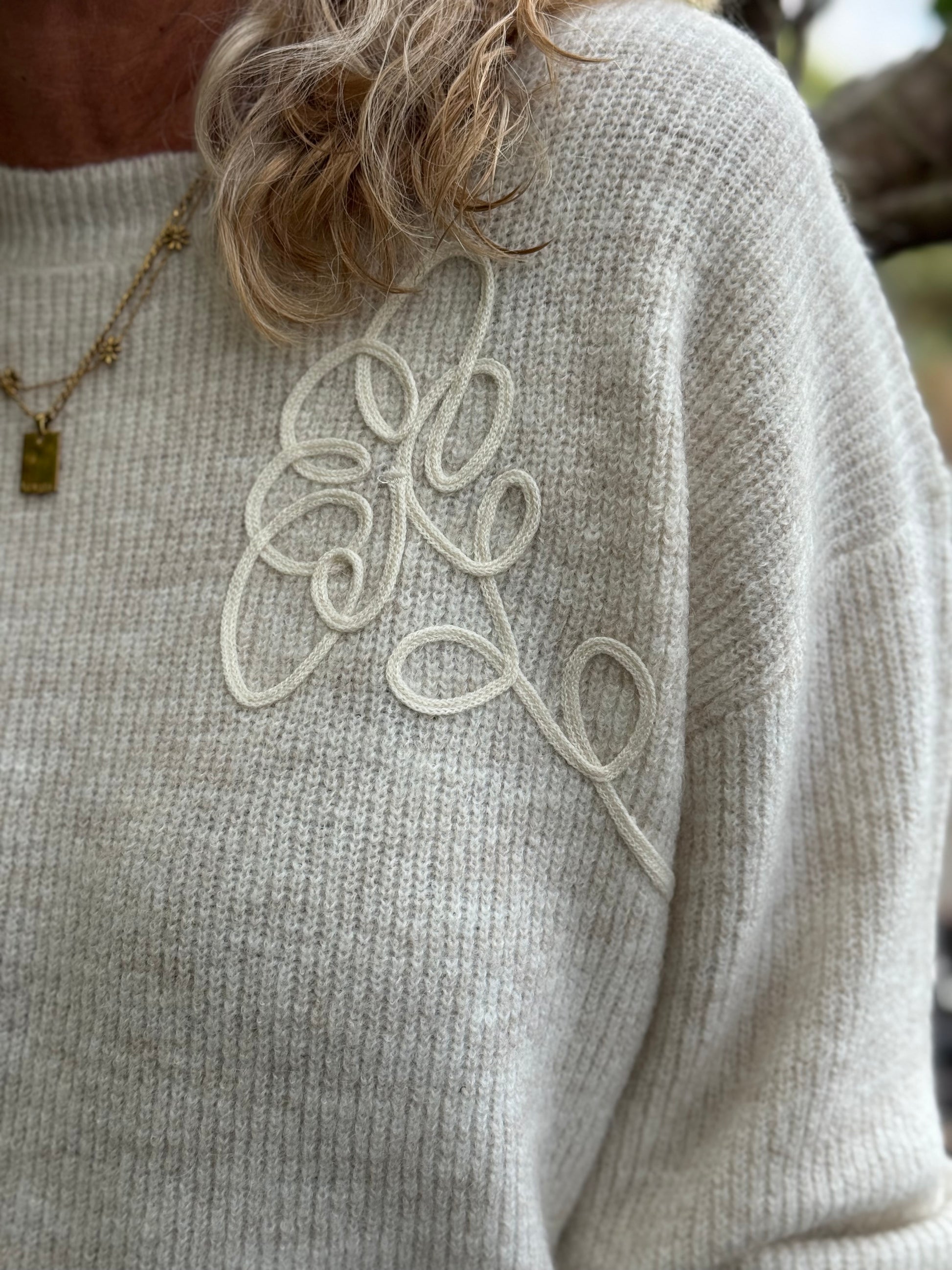 Denne lækre strik med det fineste mønster foran er utrolig feminin og nem at style. Strikken har en rund hals med rib kant, som går igen ved ærmet og forneden.