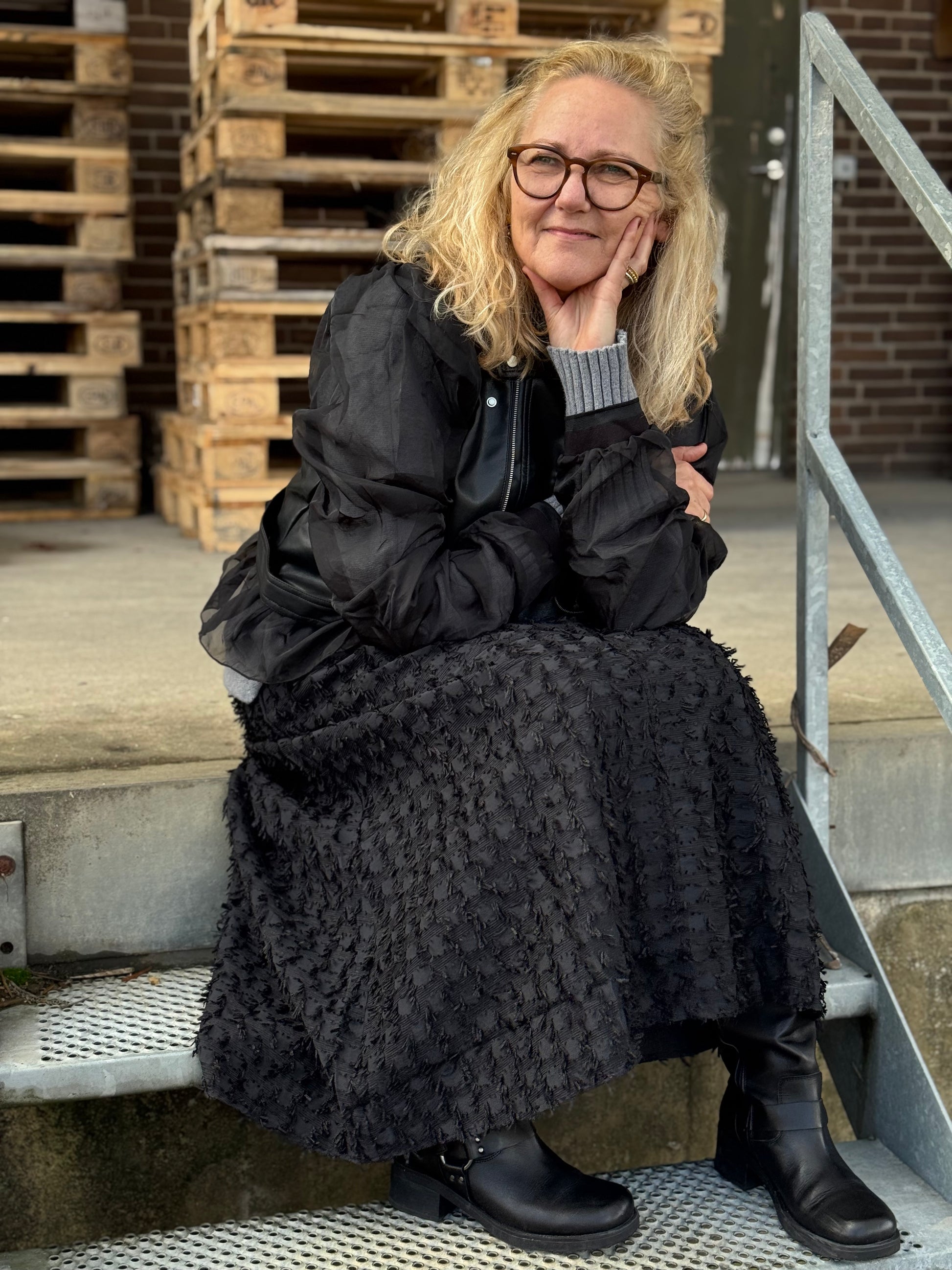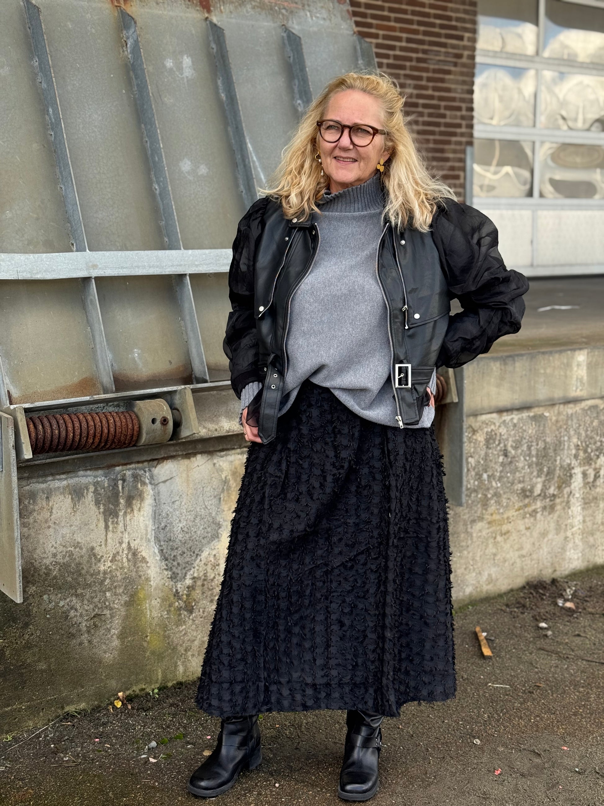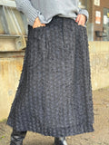 Denne fine a-formede nederdel er den perfekte nederdel til hverdag og fest. Nederdelen er i et klassisk a-formet snit med en midi længde, som er prydet med unikke dekorative frynsedetaljer. Nederdelen har fast linning med bæltestropper og lukkes med knap lynlås foran.