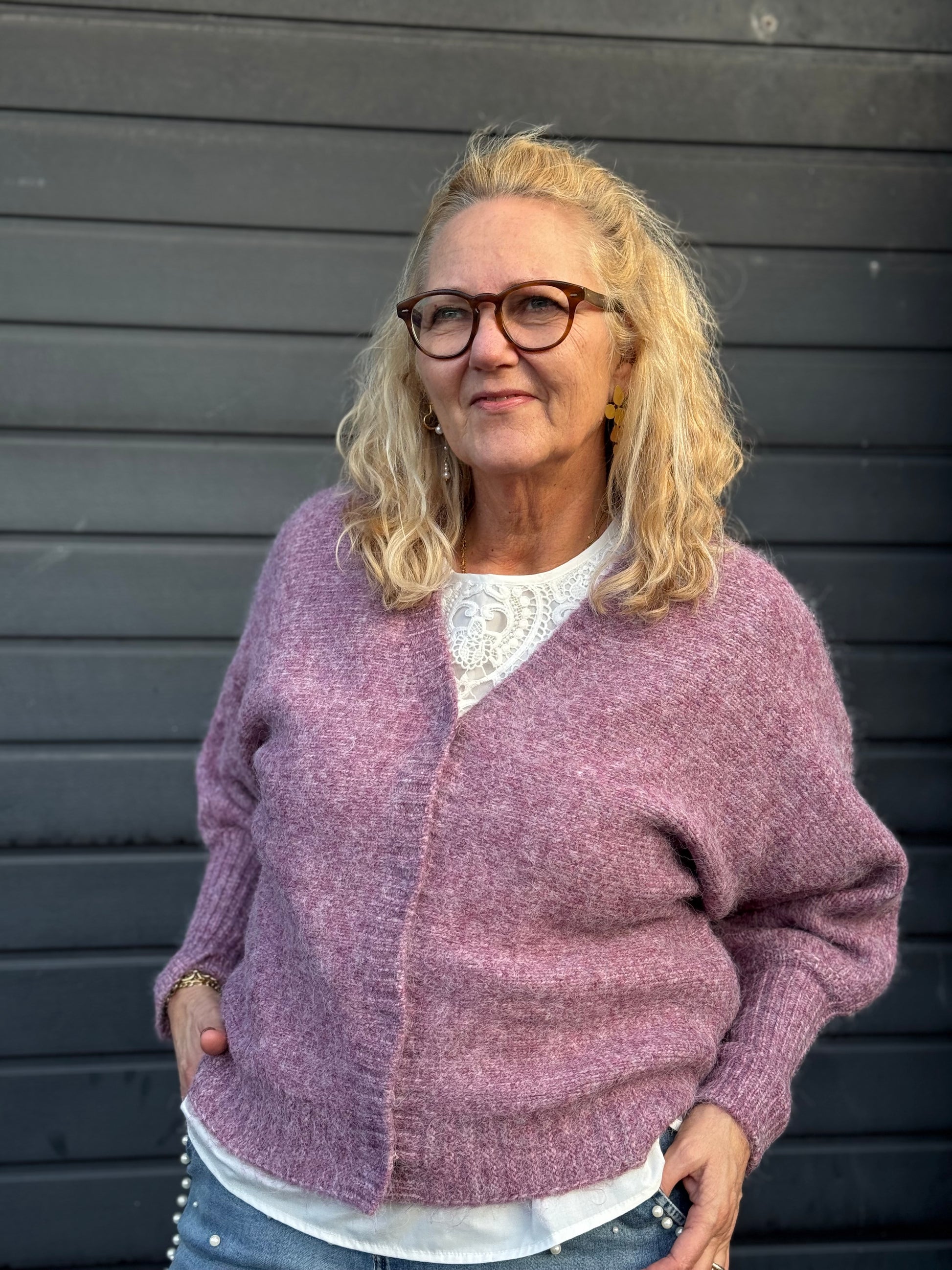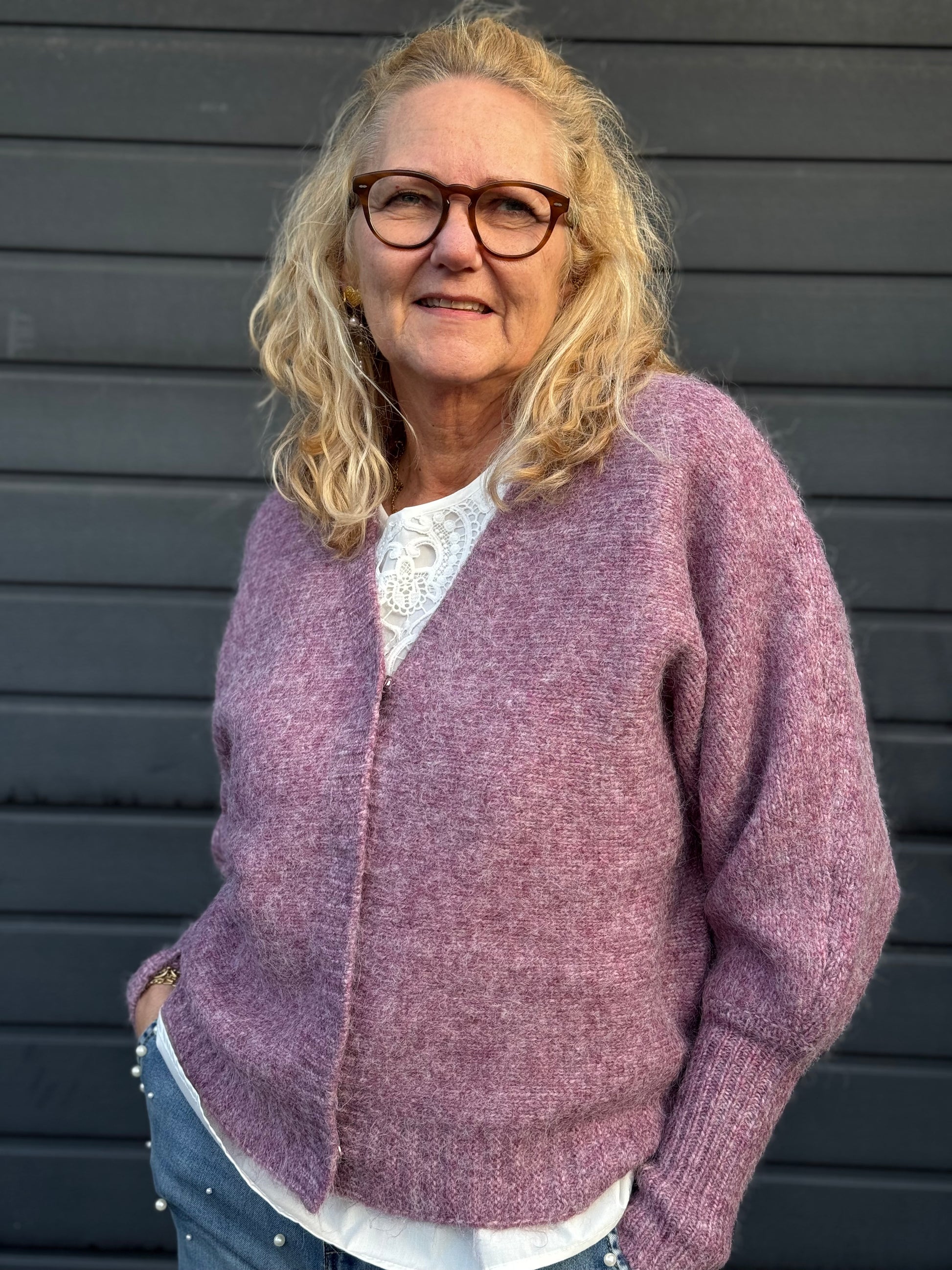 Denne lækre bløde cardigan er perfekt til de kølige dage. Cardiganen har en fin v-udskæring og lukkes foran med knapper. Den har et lang rib stykke i ærmerne, som giver et cool udtryk.