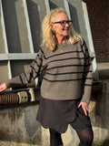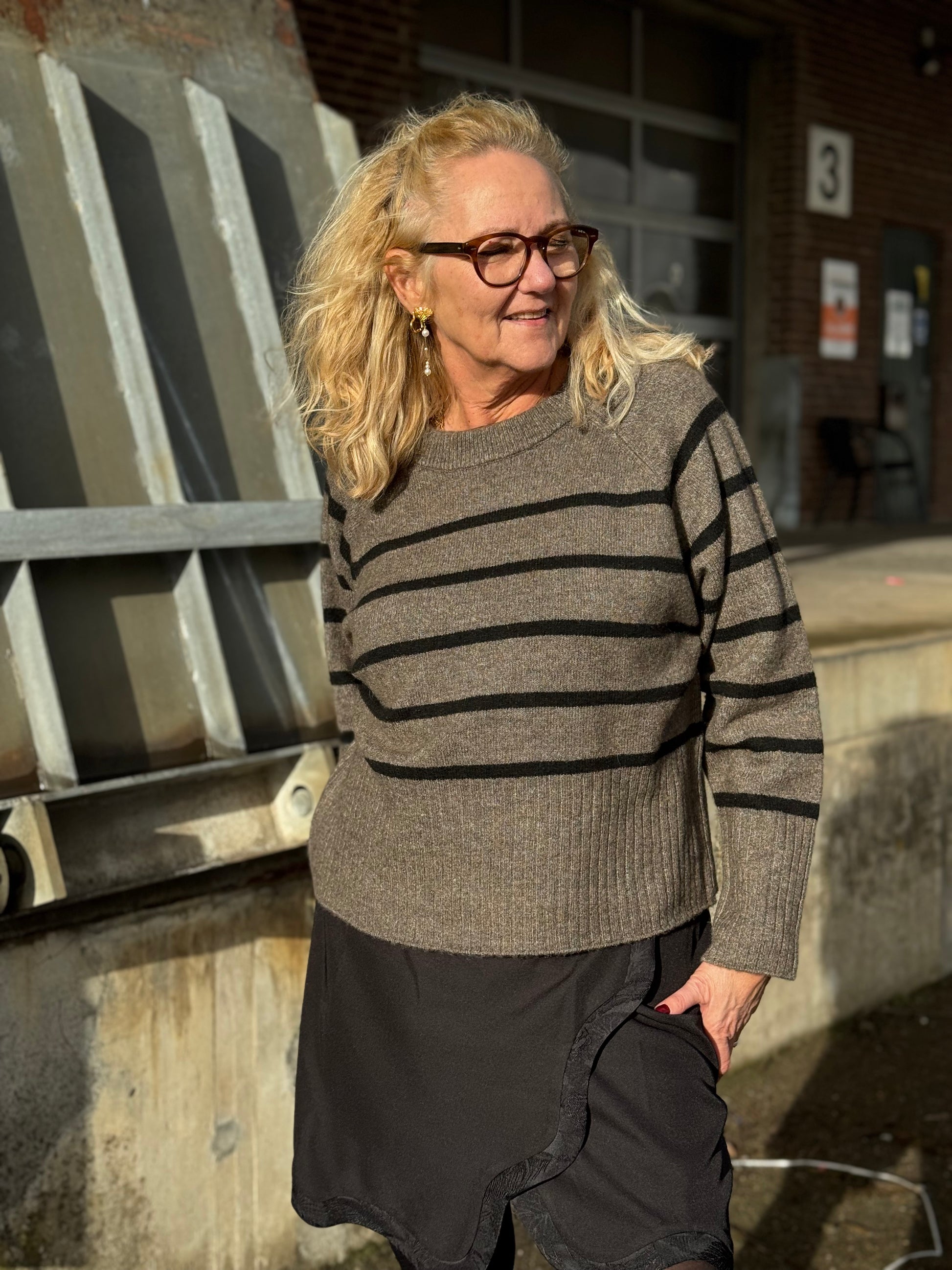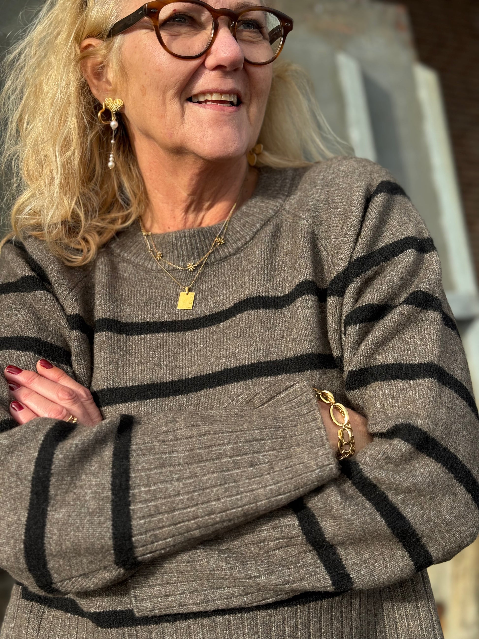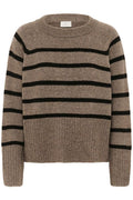 Denne lækre stribede strik fra Kaffe er helt perfekt til de kolde dage. Strikken har en fin rund hals med rib, som også går igen ved ærmerne og forneden.