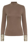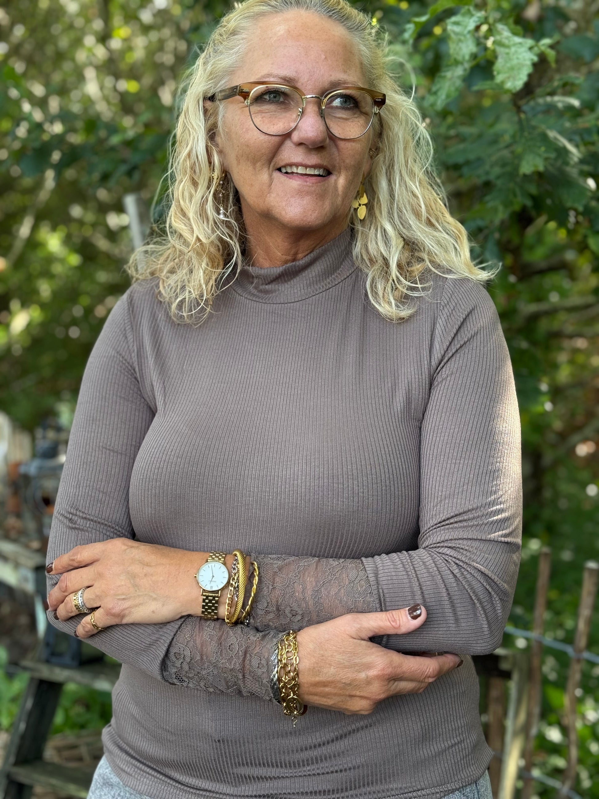 Denne basic bluse med blonde i ærmet er essentiel i din garderobe. Blusen er slim fit med ribstruktur.