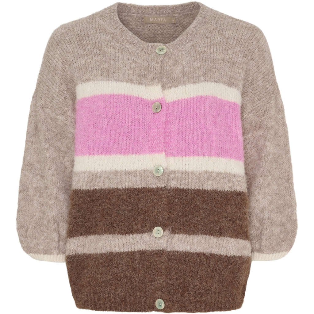 Blød strik cardigan fra Marta Du Chateau den flotteste farvekombination. Cardiganen har rund hals, knaplukning foran med beige knapper. Ærmerne er trekvarte og afsluttes med en lille ribkanter, som giver et feminint og legende udtryk.