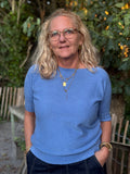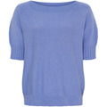 Denne lækre striktrøje har de fineste detaljer. Strikken har en rund hals med lodret ribkant foran og bagpå. Ærmerne går til omkring albuen og afsluttes med ribkant, hvilket går igen forneden af trøjen.
