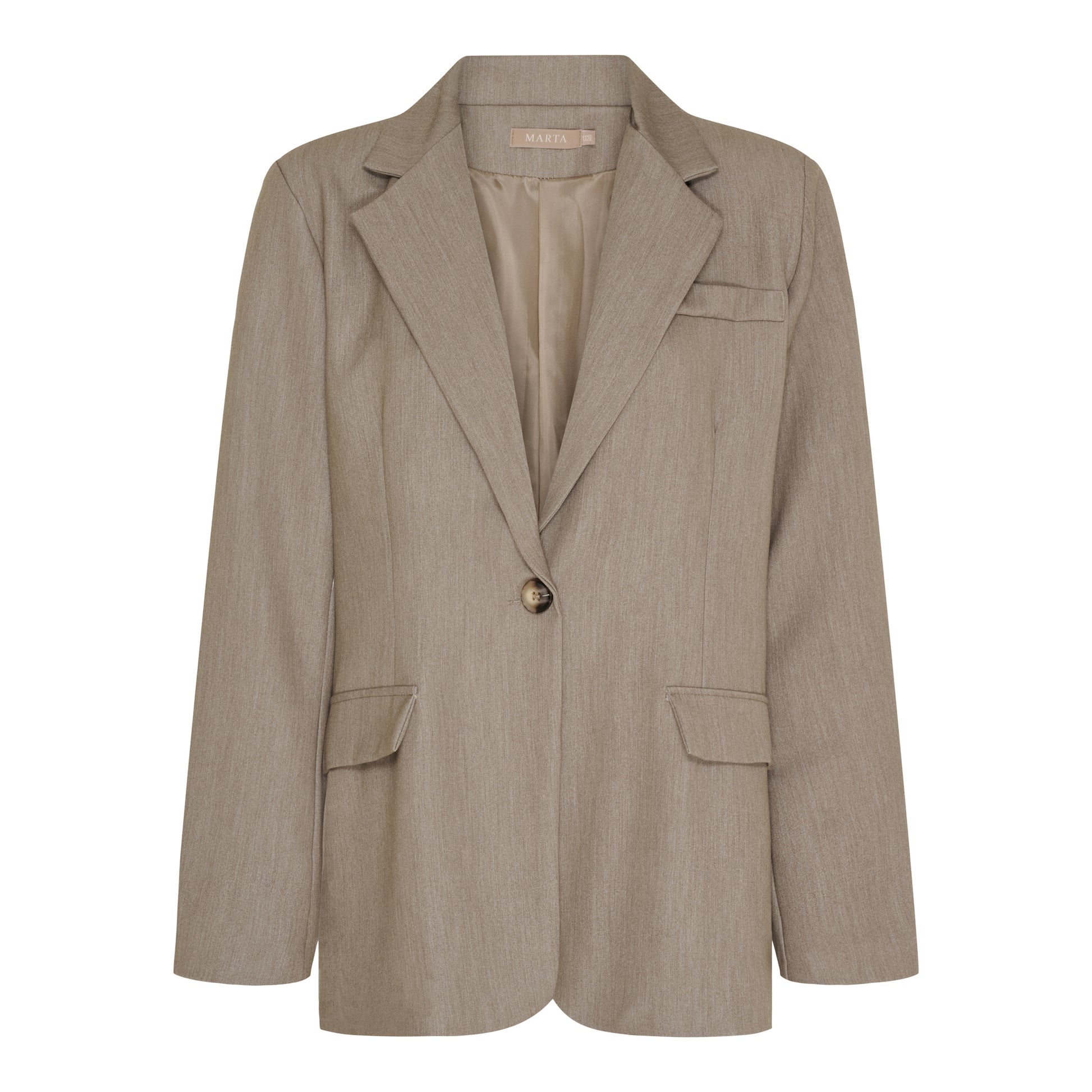 Denne lækre blazer er et must have. Blazeren har en klassisk revers og enkelt knaplukning. Den har en fin afrunding forneden, lommer i siderne samt på brystet.
