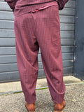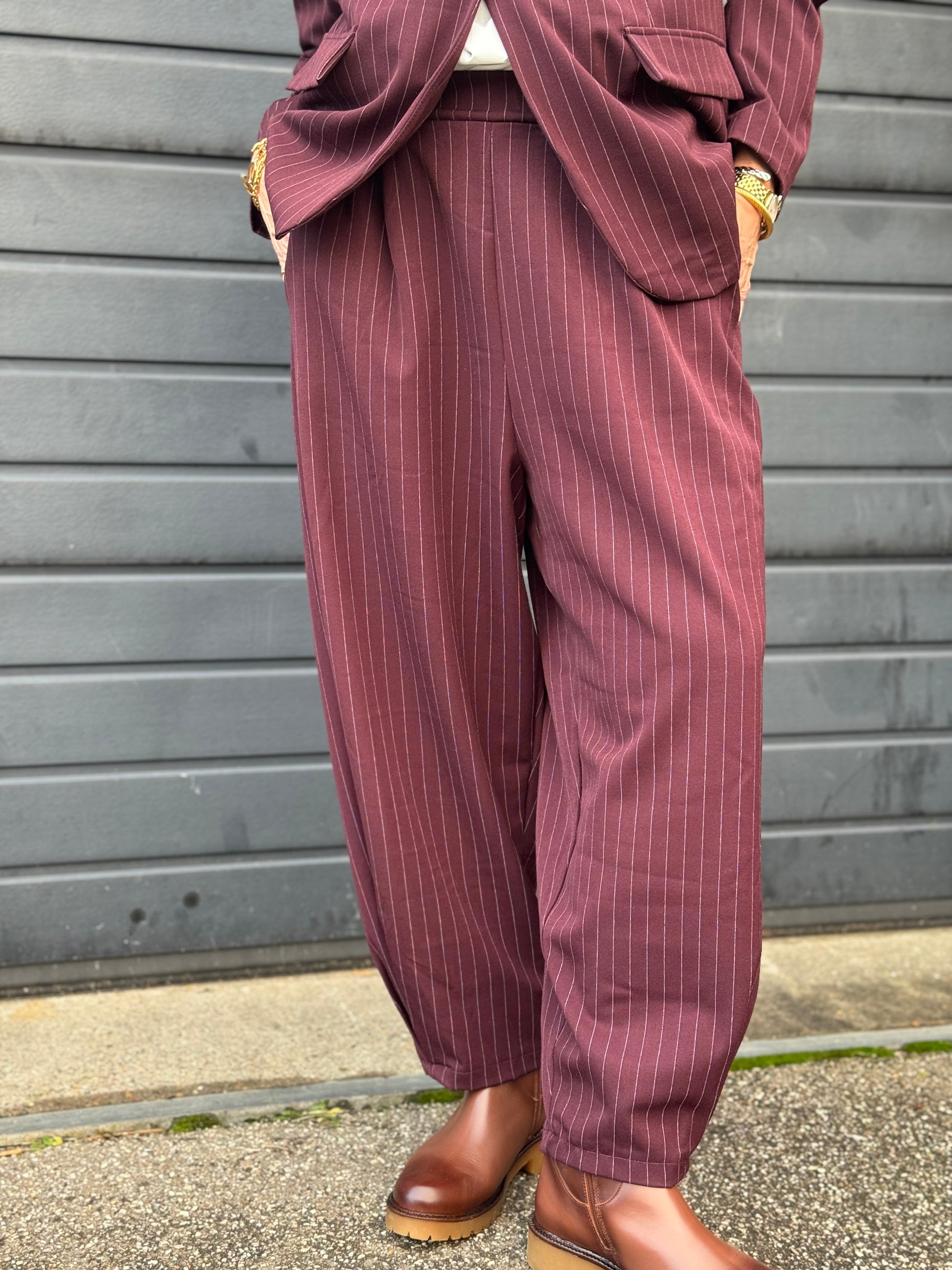 Disse lækre bukser fra Marta har den fineste nålestrib Bukserne har elastik i taljen, hvilket gør den behagelige at have på. Foran har bukserne skrålommer. Buksen har brede i benene som snævre en smule ind nederst.