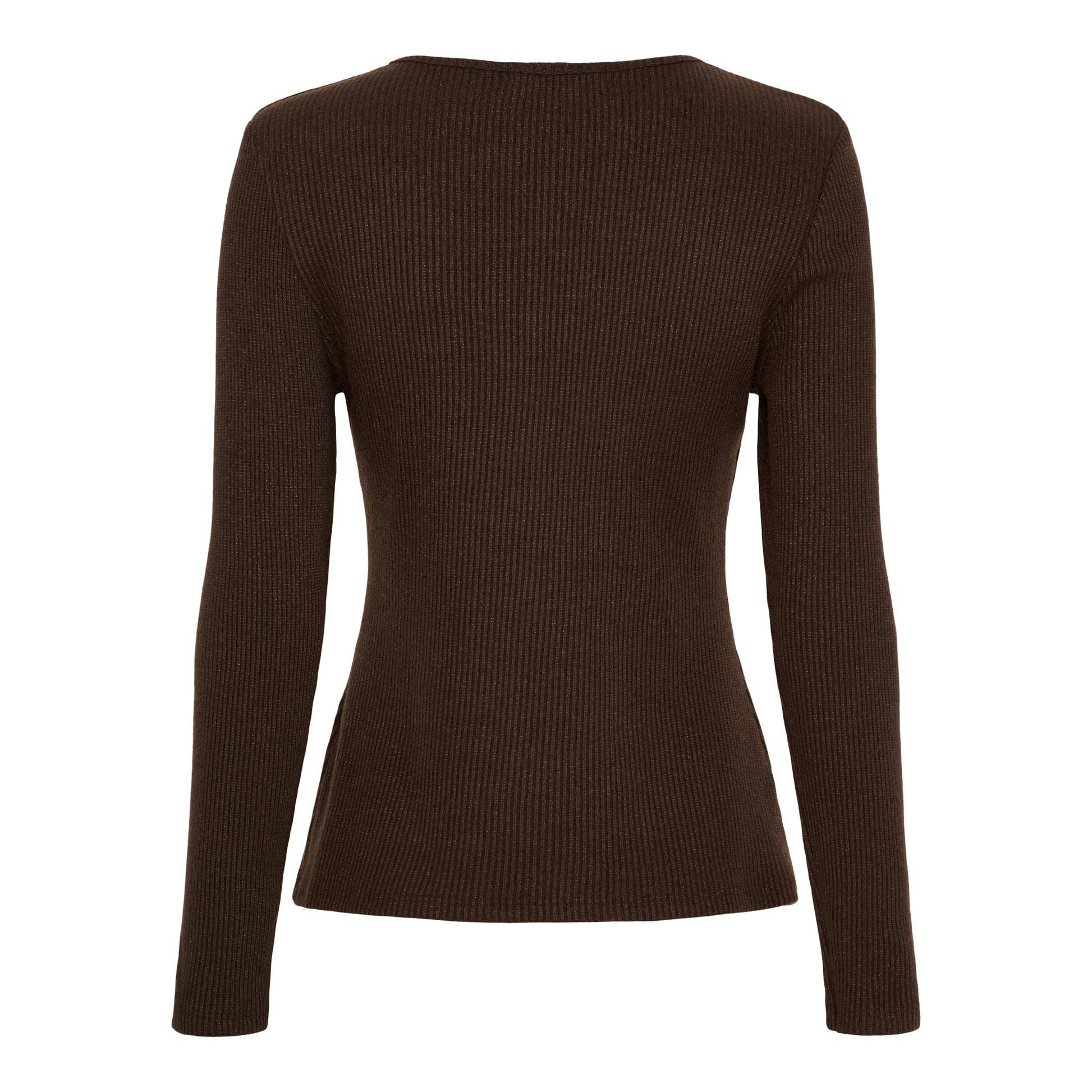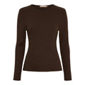 Skøn ribbet langærmet T-shirt med sart glimmertråd. Blusen har en rundhals udskæring som afsluttes med en lille ribkant.