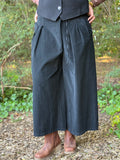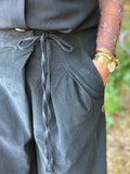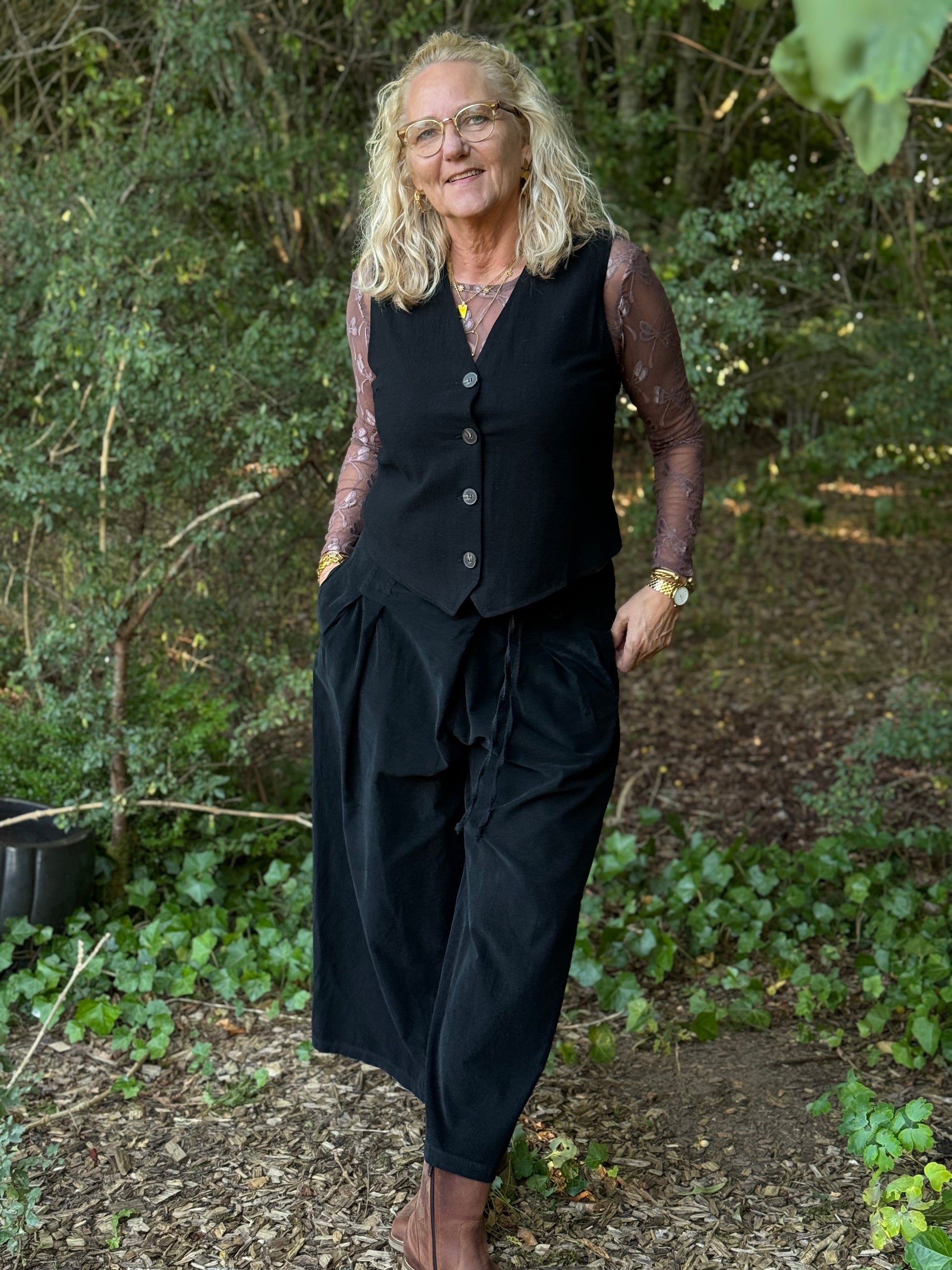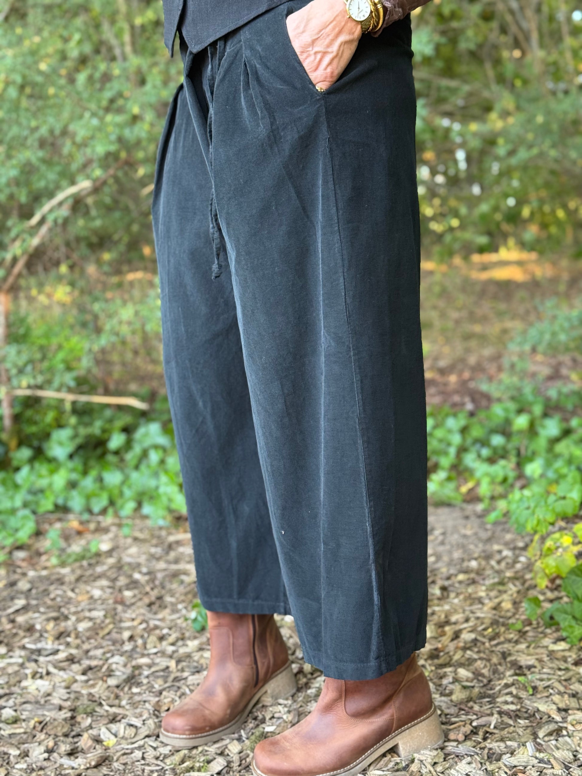 Her får du den lækre buks i babyfløjl, som ligner en nederdel med bredde ben i en smart 7/8 del længde er fra marta er fyldt med lækre detaljer. Bukserne er med elastik bag på i taljen og så har den en smart fold ind effekt foran med bindebånd.