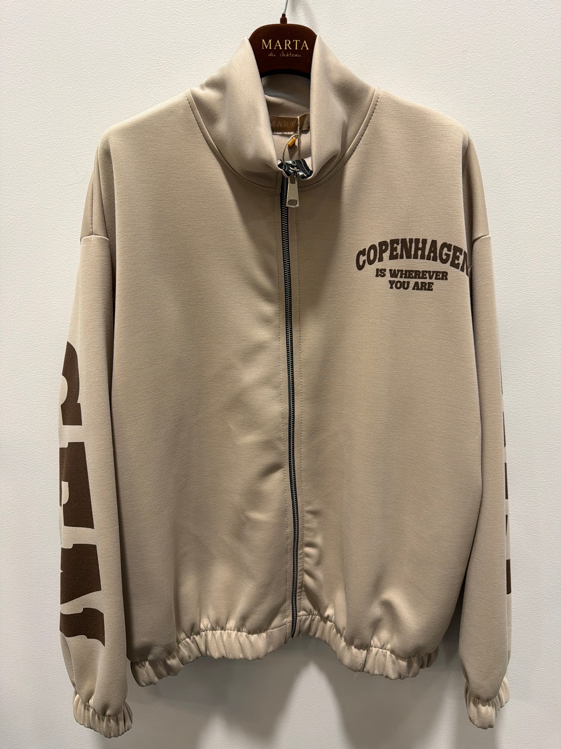 Denne lækre sweatcardigan er et must have da den er fyld med komfort. Cardiganen har en lille høj hals og klassisk lynlås lukning foran. Den er med elastik i taljen og ærmerne, bagpå har den en fed skrift i en lækker mørke brun, hvor der står COPENHAGEN - hvilket går igen på det ene bryst.