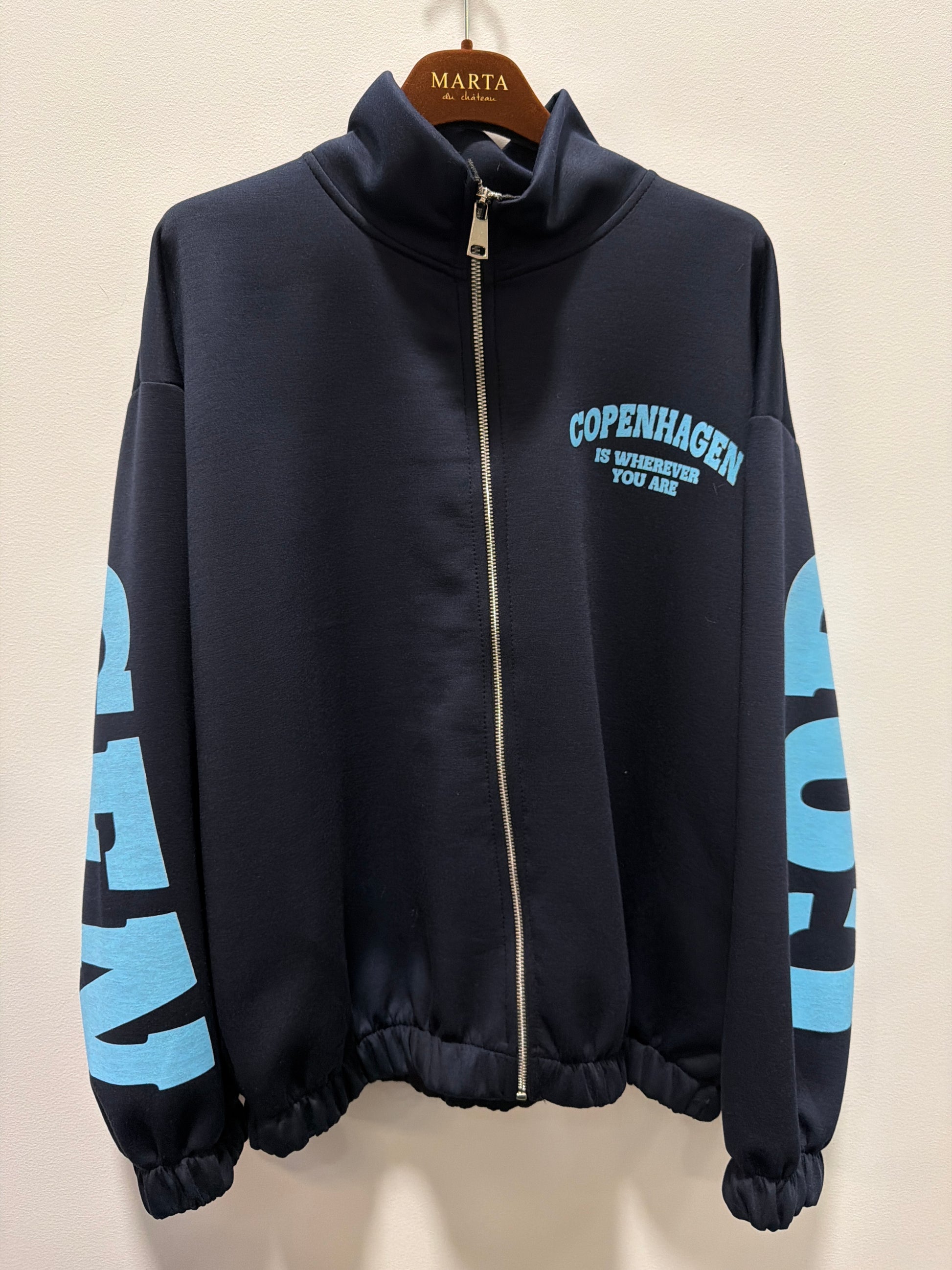 Denne lækre sweatcardigan er et must have da den er fyld med komfort. Cardiganen har en lille høj hals og klassisk lynlås lukning foran. Den er med elastik i taljen og ærmerne, bagpå har den en fed skrift i en lækker lyseblå, hvor der står COPENHAGEN - hvilket går igen på det ene bryst.