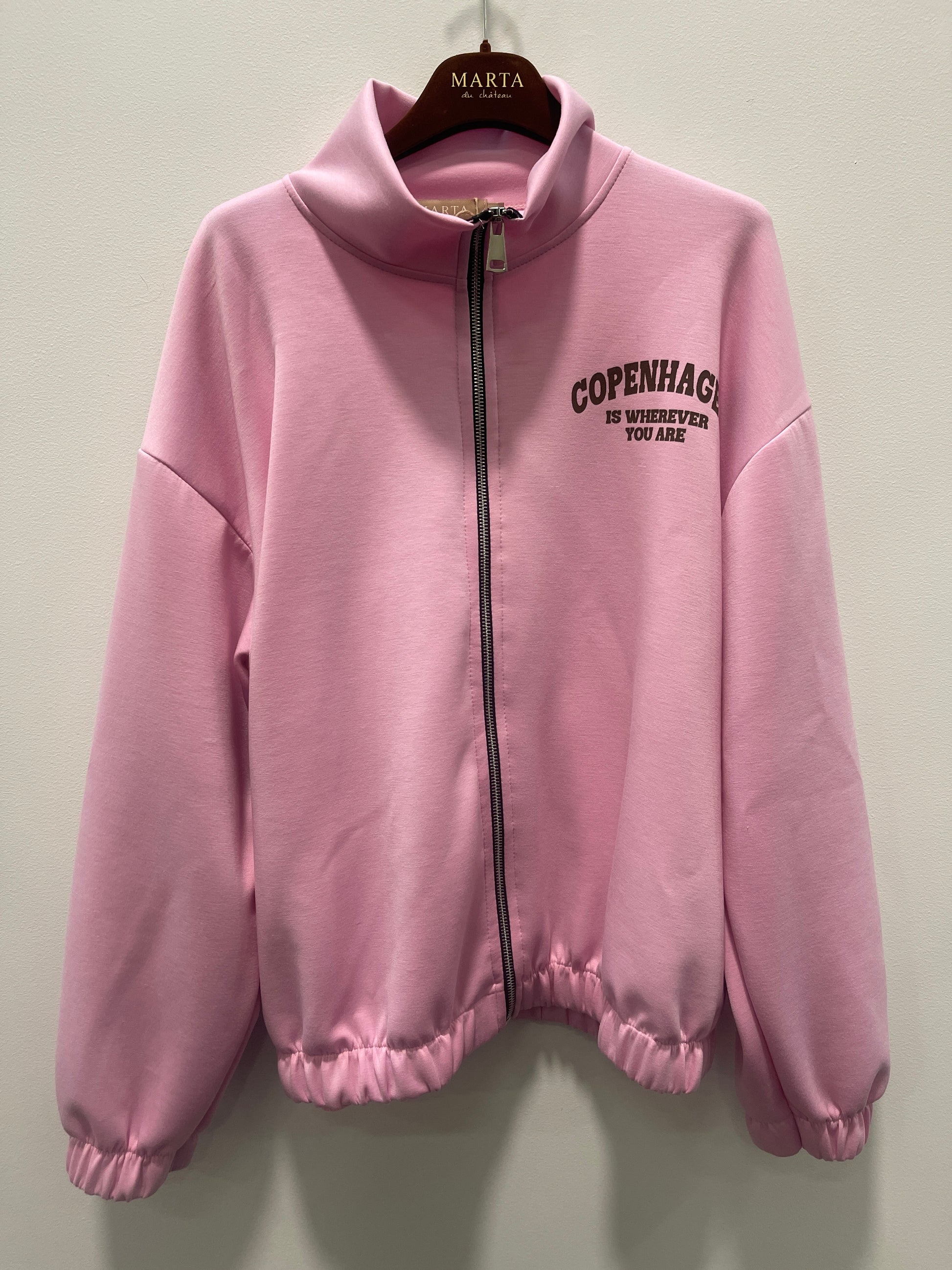 Denne lækre sweatcardigan er et must have da den er fyld med komfort. Cardiganen har en lille høj hals og klassisk lynlås lukning foran. Den er med elastik i taljen og ærmerne, bagpå har den en fed skrift i en lækker brun, hvor der står COPENHAGEN - hvilket går igen på det ene bryst.