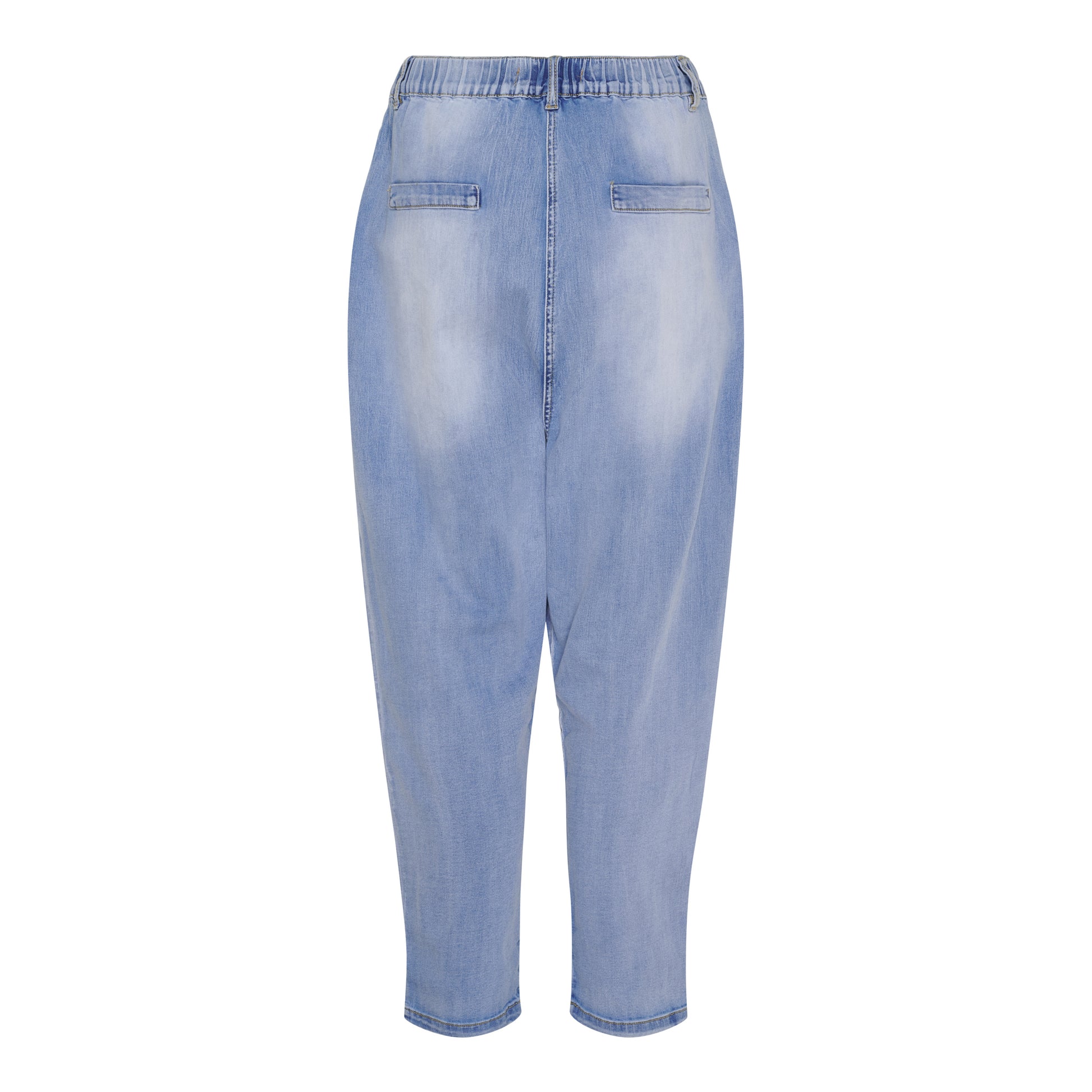 Cool jeans med indbygget hængerøv fra Marta som kan redde en hver tøjkrise. Bukserne har fast linning med klassisk knaplukning foran og elastik i taljen bagpå. Bukserne er i den lækreste vask, har lommer i siderne og vidde i benene, som snævre en smule ind forneden.