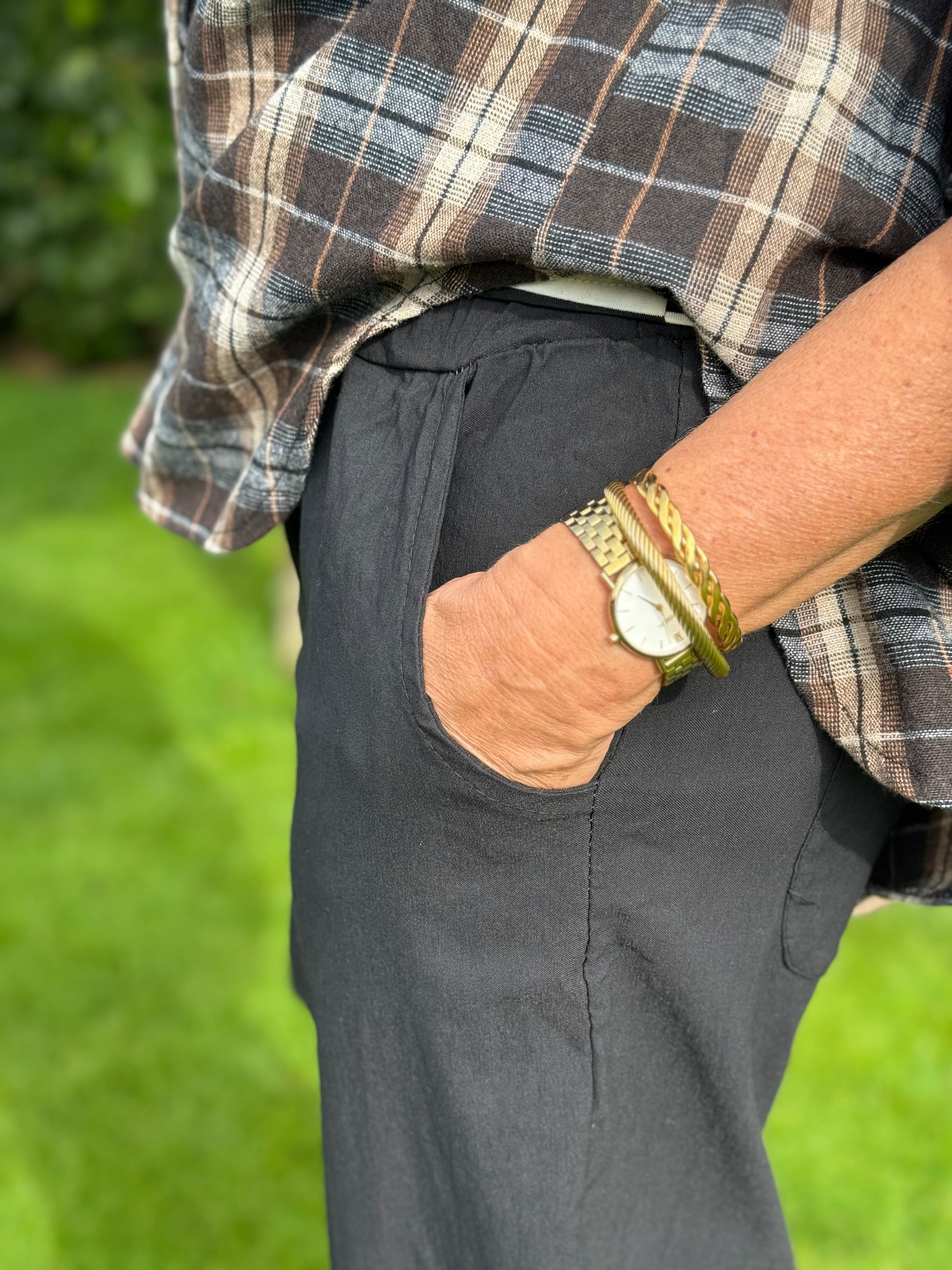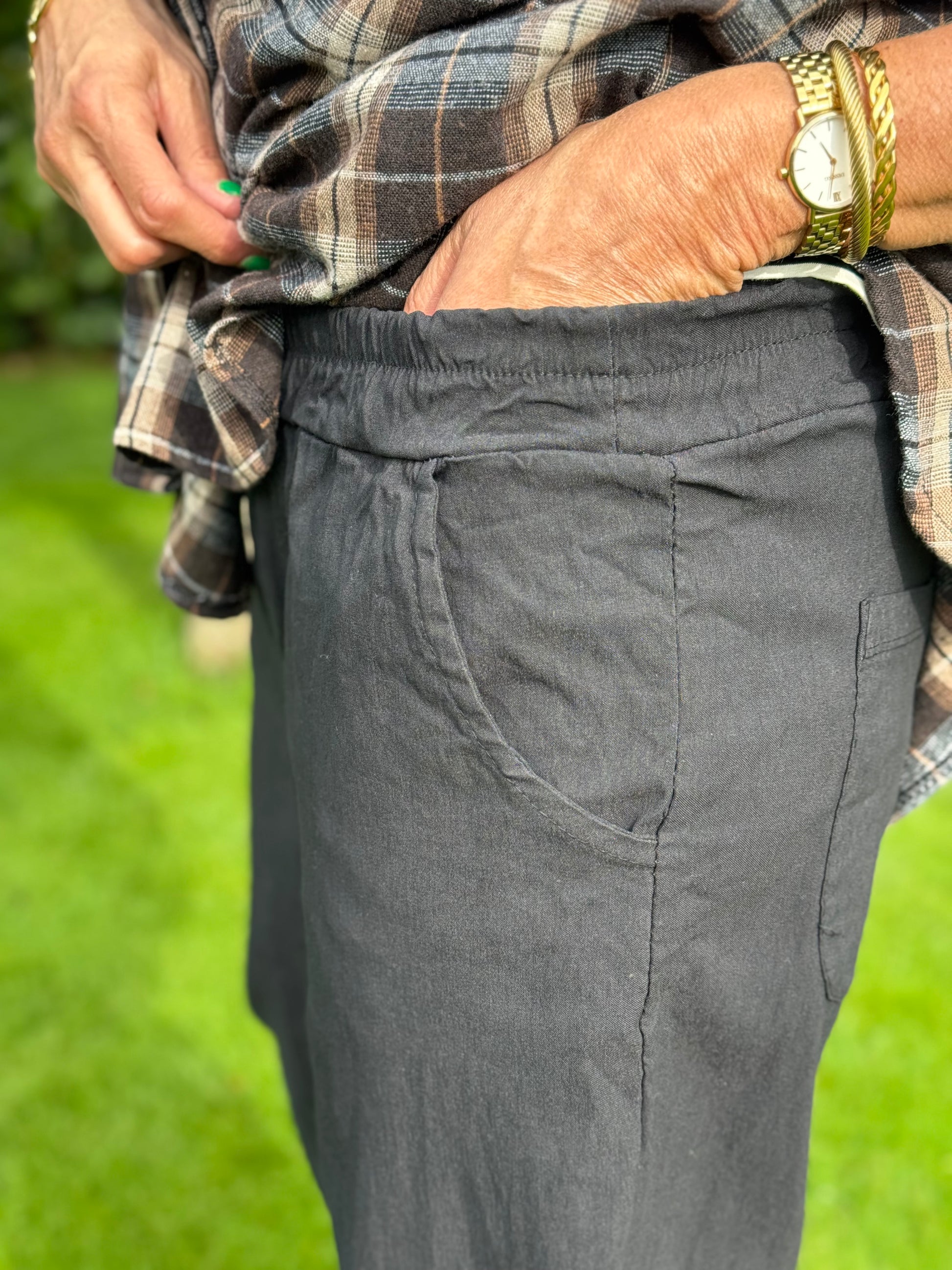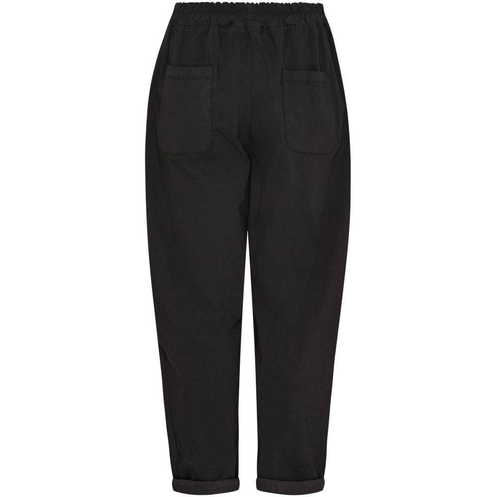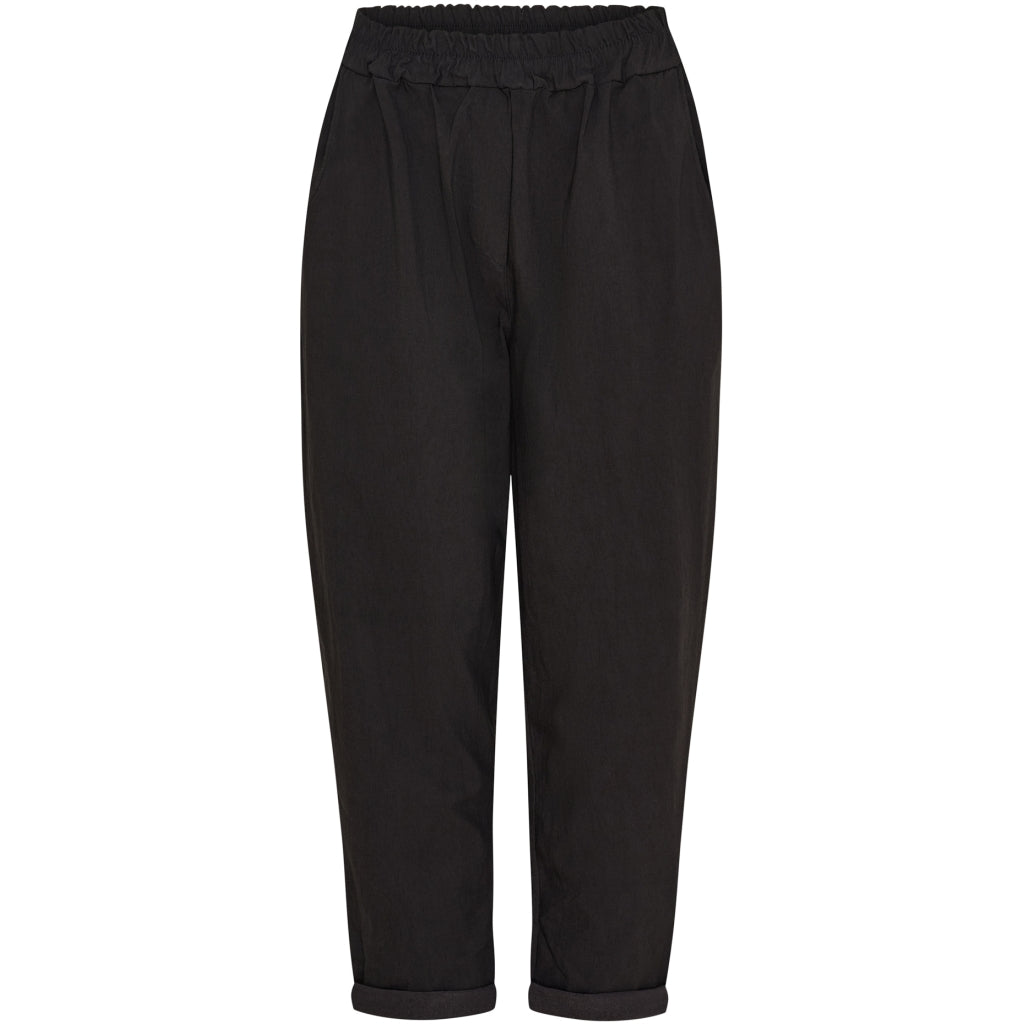 Disse lækre bukser fra Marta er i det blødeste viskosekvalitet, som sikre en afslappet pasform. Bukserne har elastik i taljen, hvilket gør den behagelige at have på. Foran har bukserne skrålommer. Buksen har brede i benene som snævre en smule ind nederst, den er desuden i en let cropped længde, hvilket giver dem et utal af stylingsmuligheder.