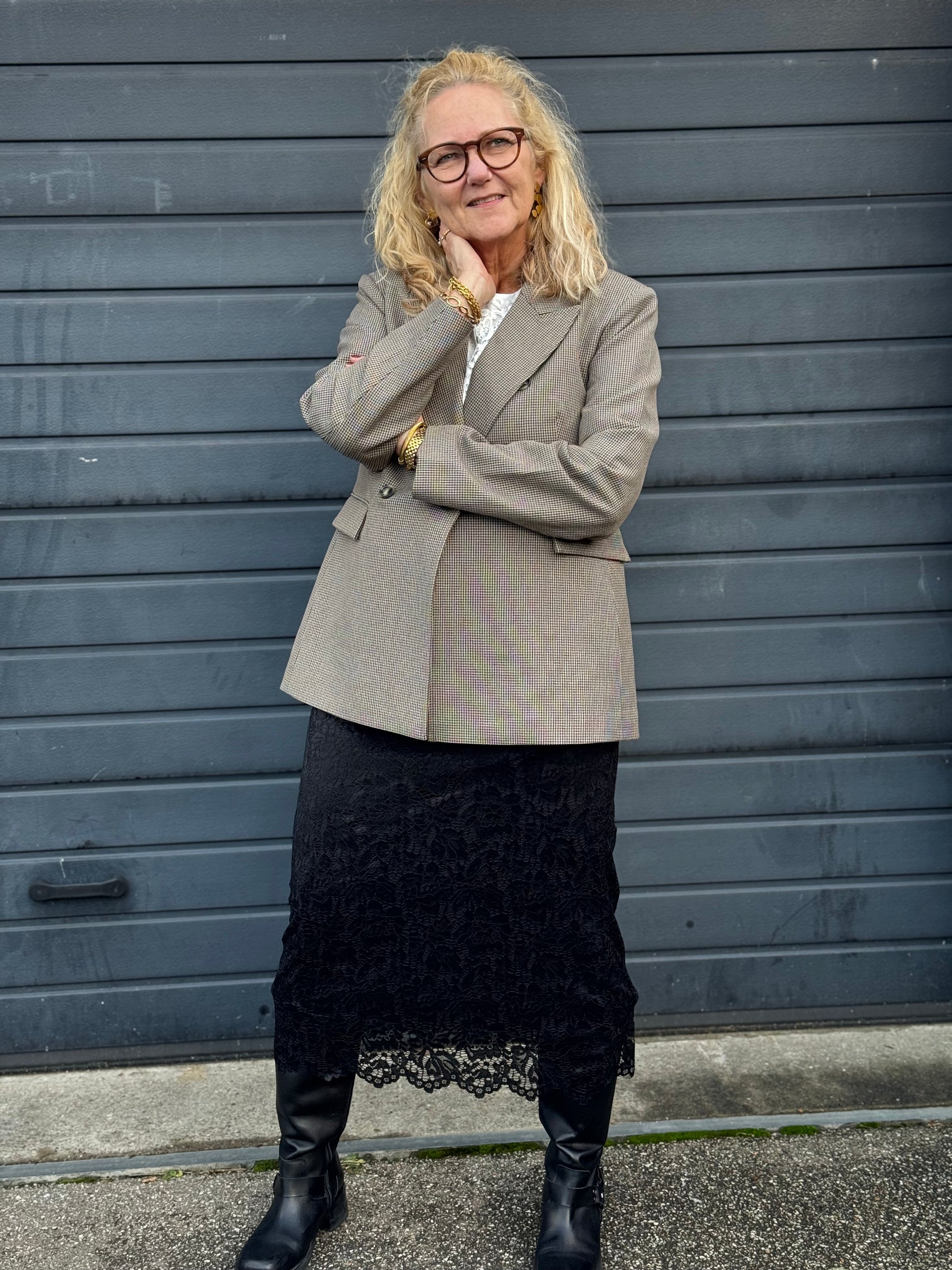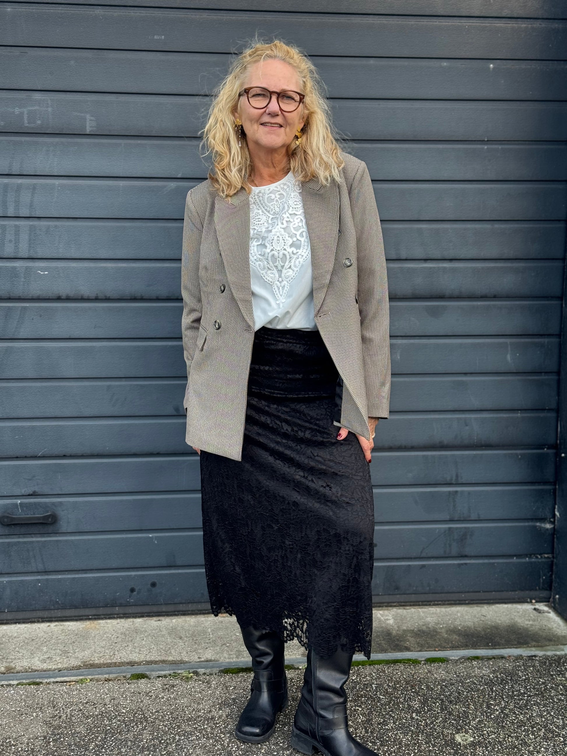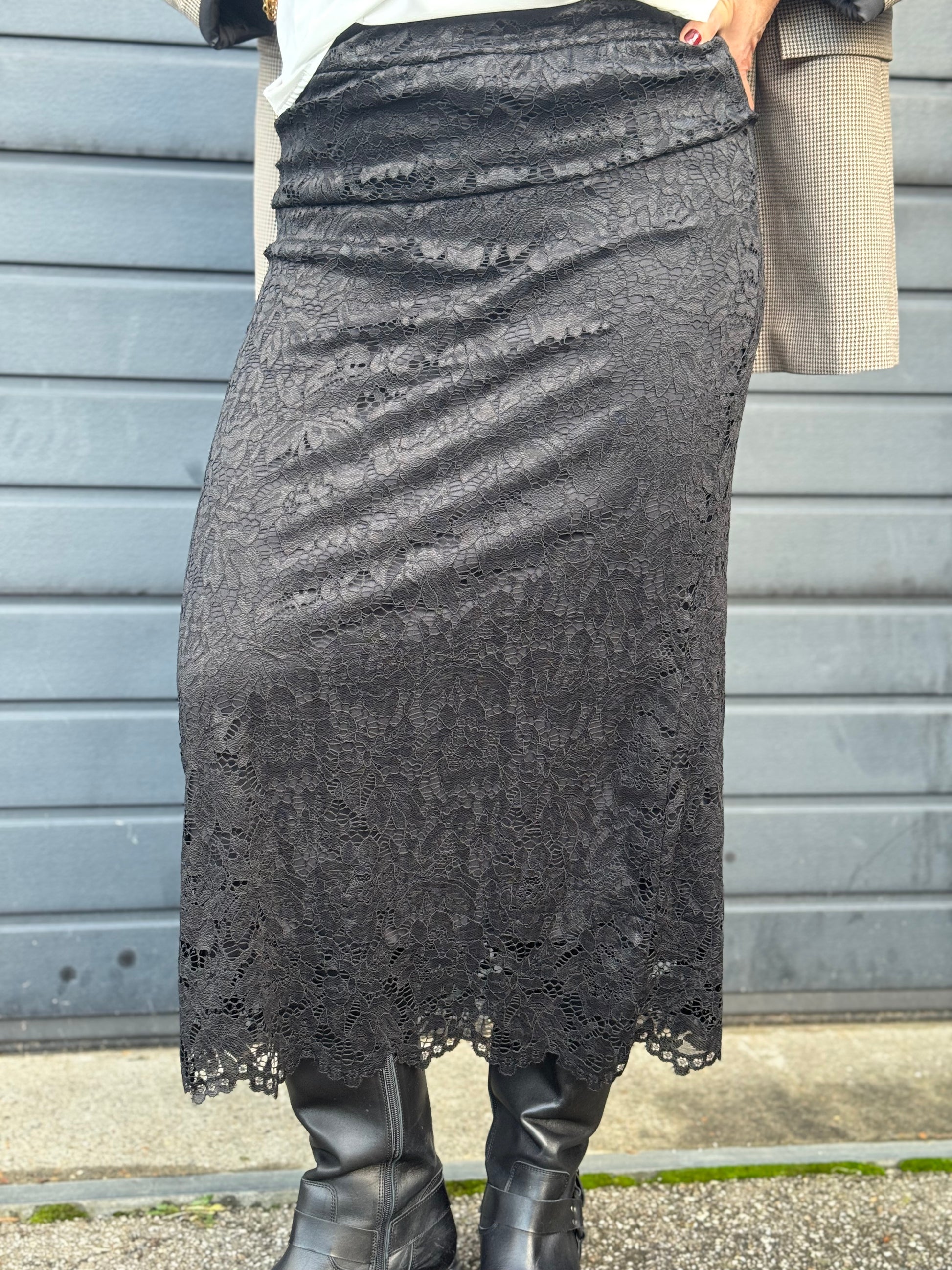 Denne lækre blonde nederdel er perfekt til at pifte et hvert outfit op. Nederdelen har elastik i taljen og ankellang.