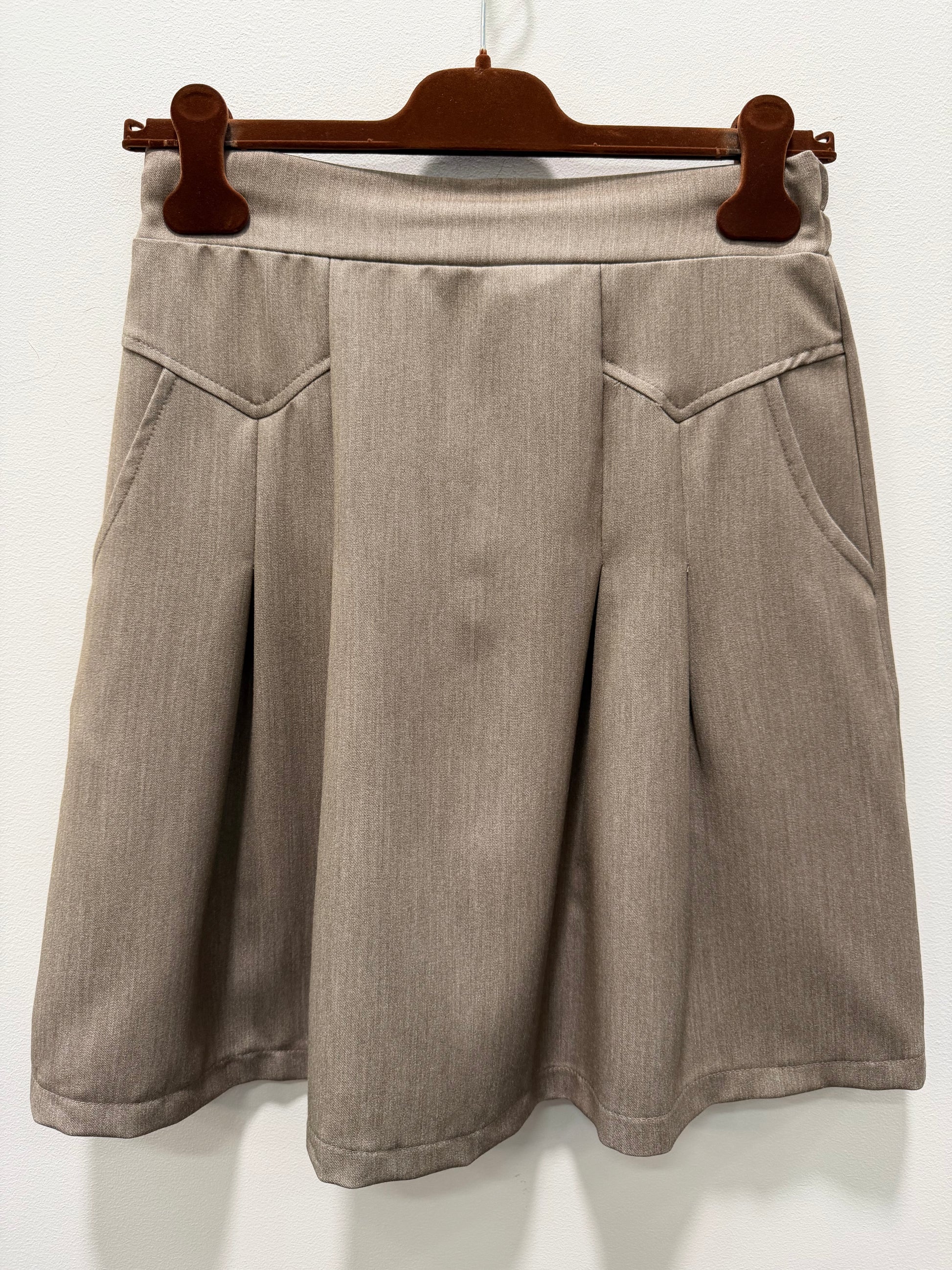Denne lækre nederdel del fra Marta de fineste detaljer foran. Nederdelen er med fast linning foran mens der er elastik bagpå. Foran har den et glat stykke, som sikre et flot fald, da læggene først kommer et stykke nede, samt skrålommer.