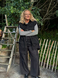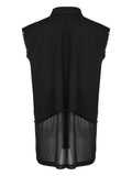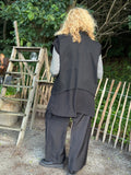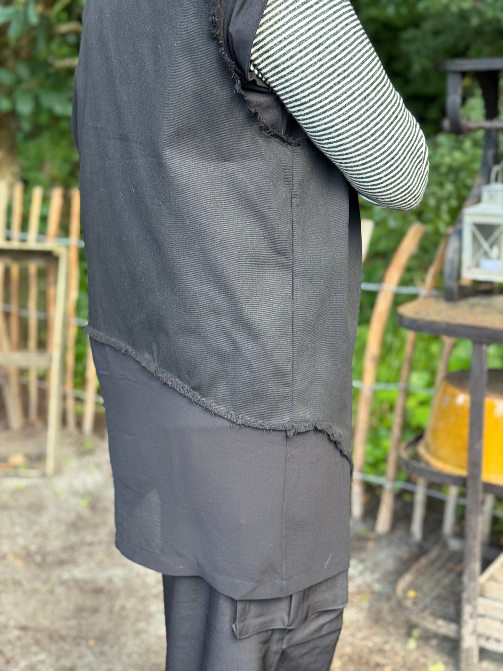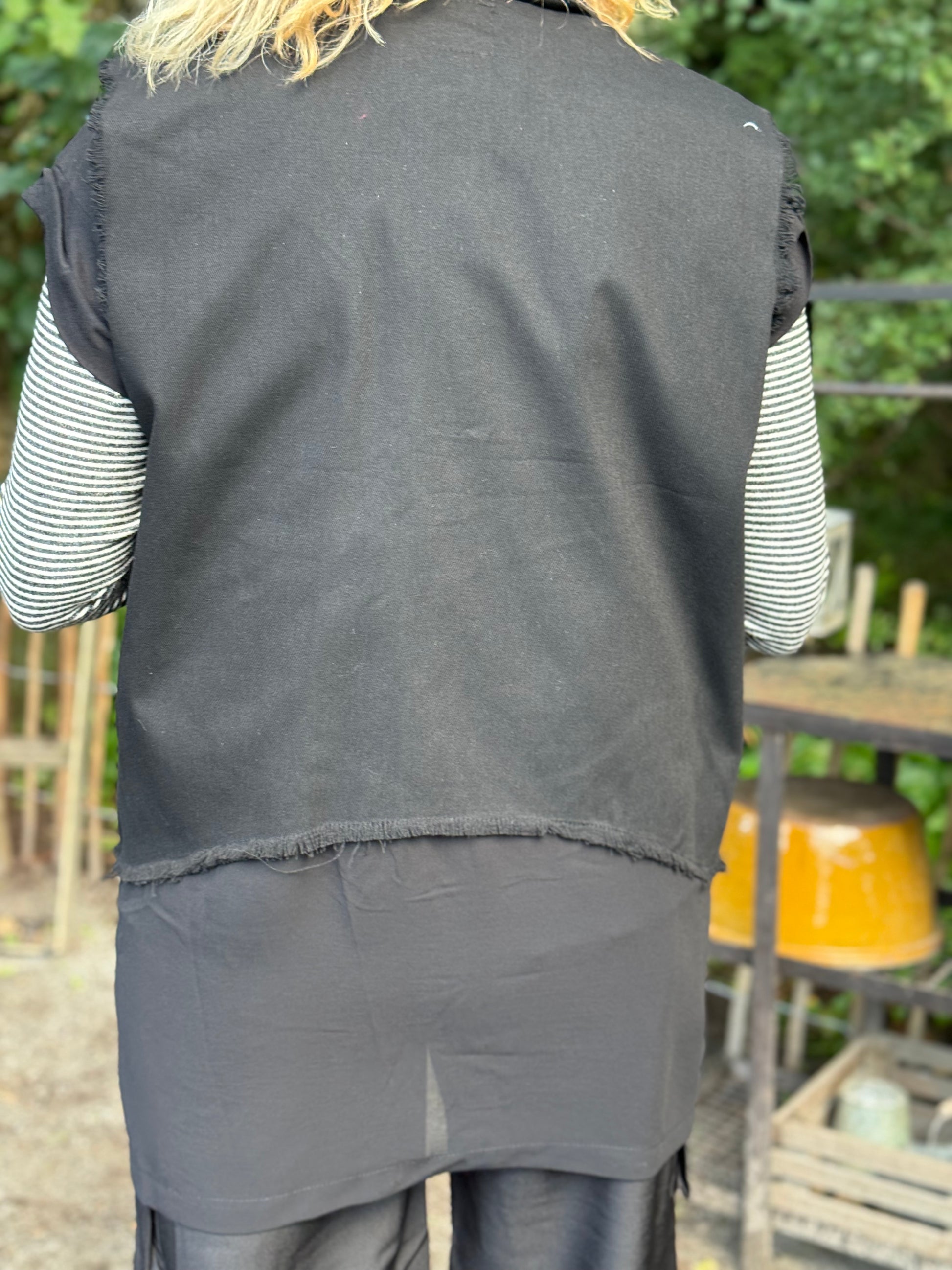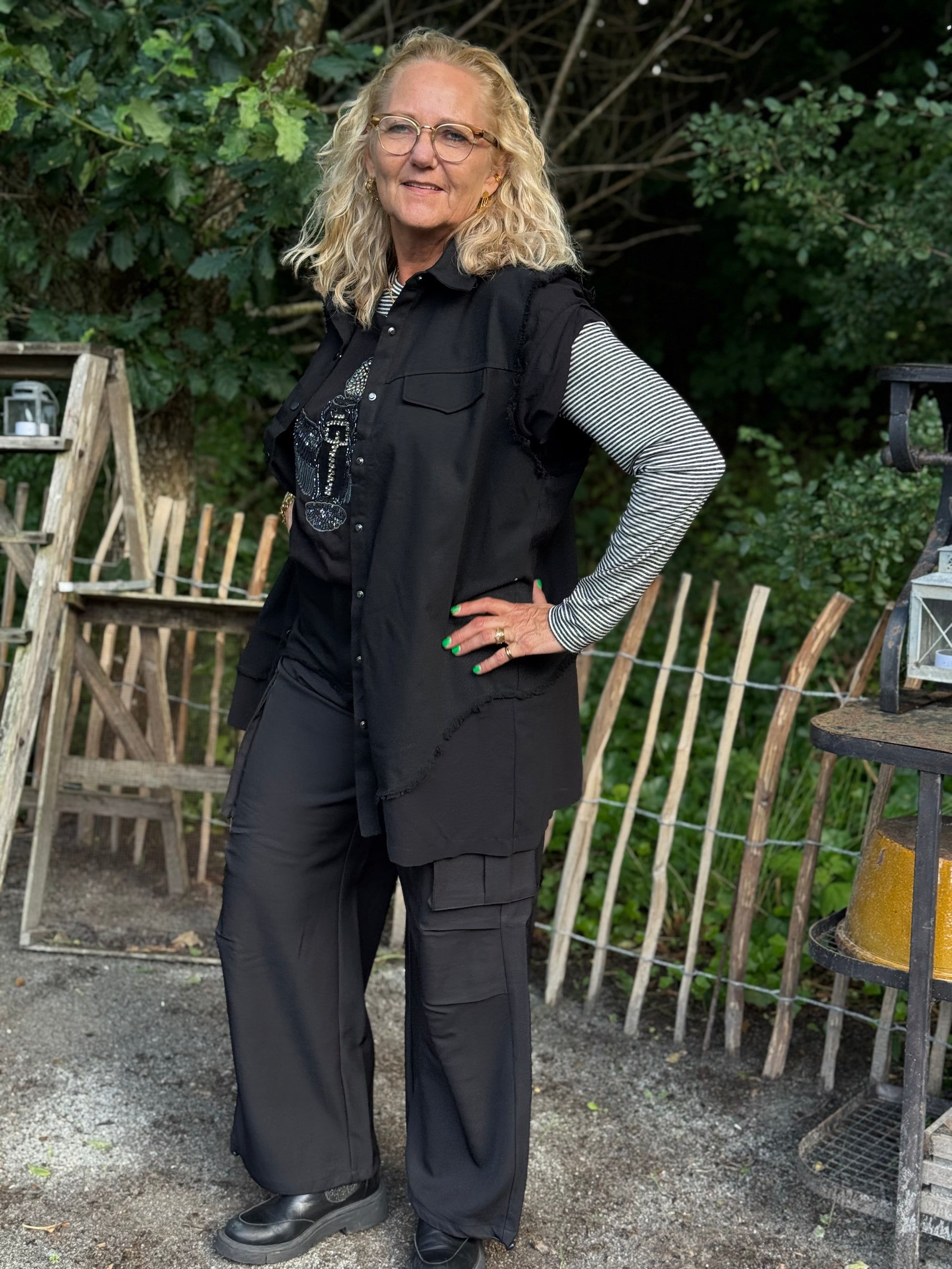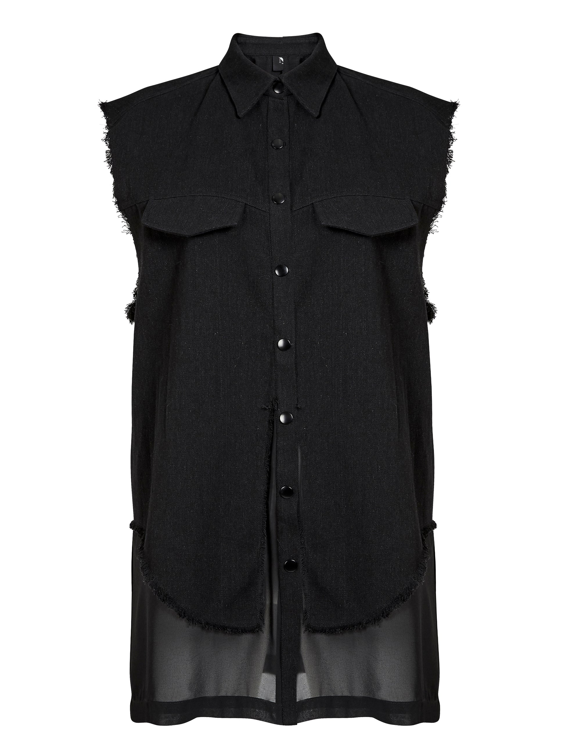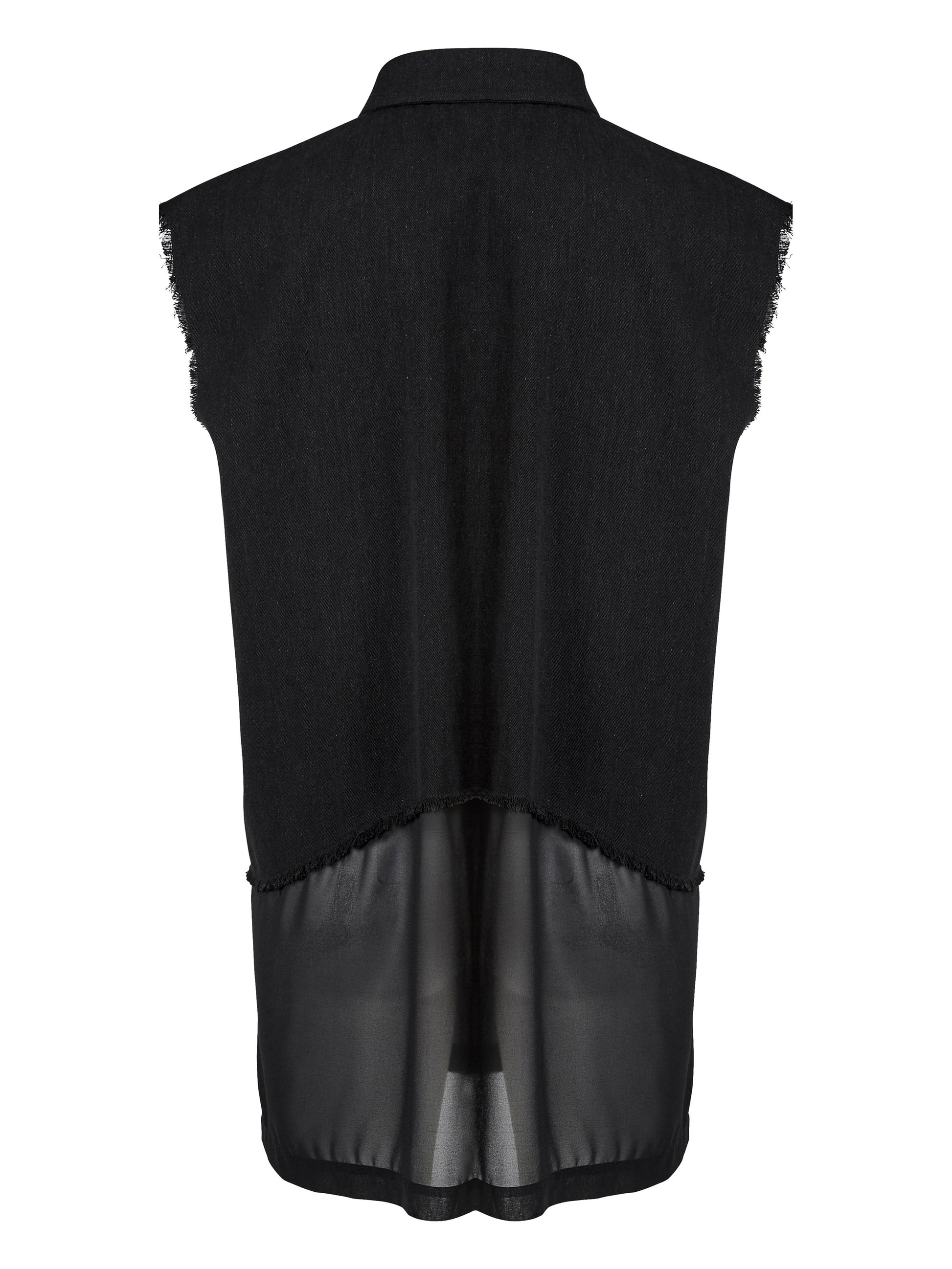 Denne cool sortvasket denim vest fra Nü Denmark er et must have i garderoben. Vesten har en klassisk krave, knaplukning med trykknapper og brystlommer. Den en frynset afslutning på ærmerne og chiffon stof forneden.