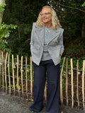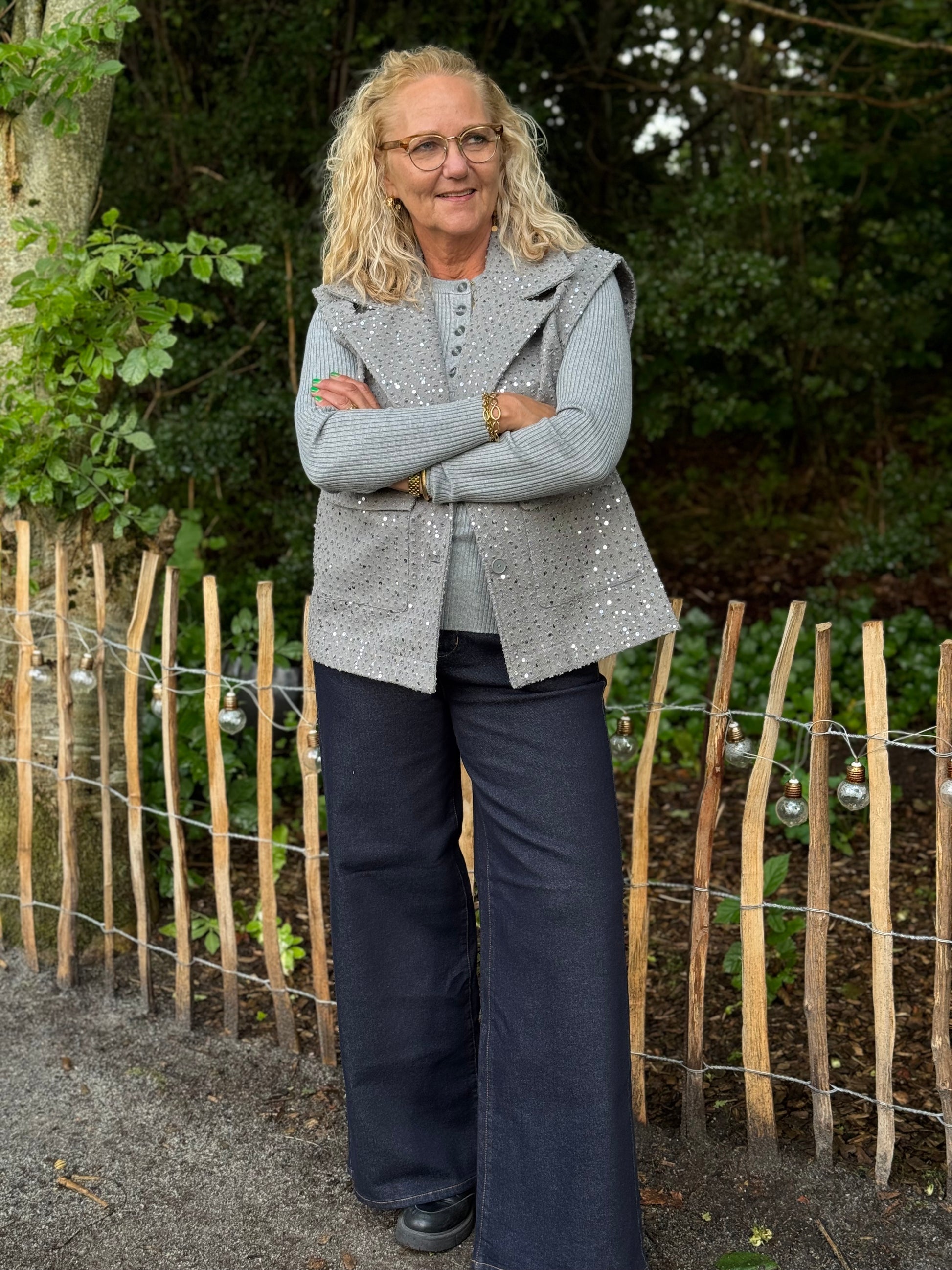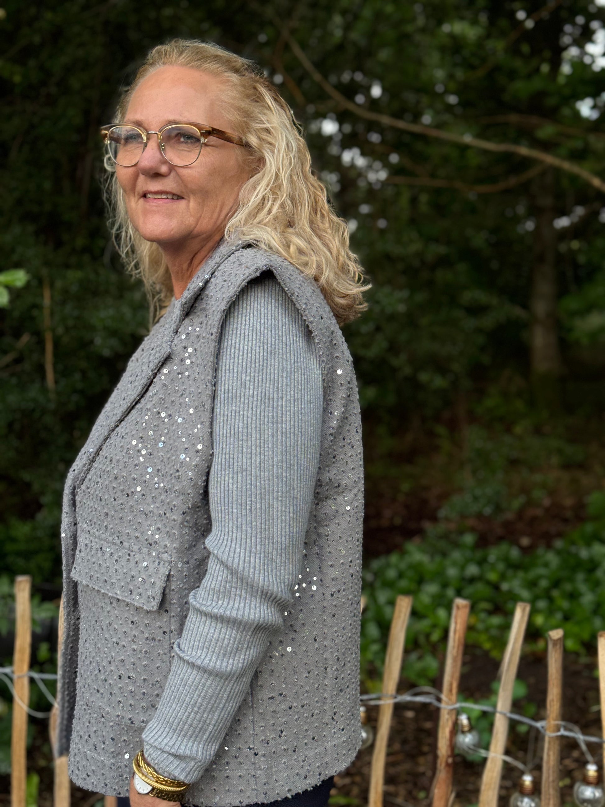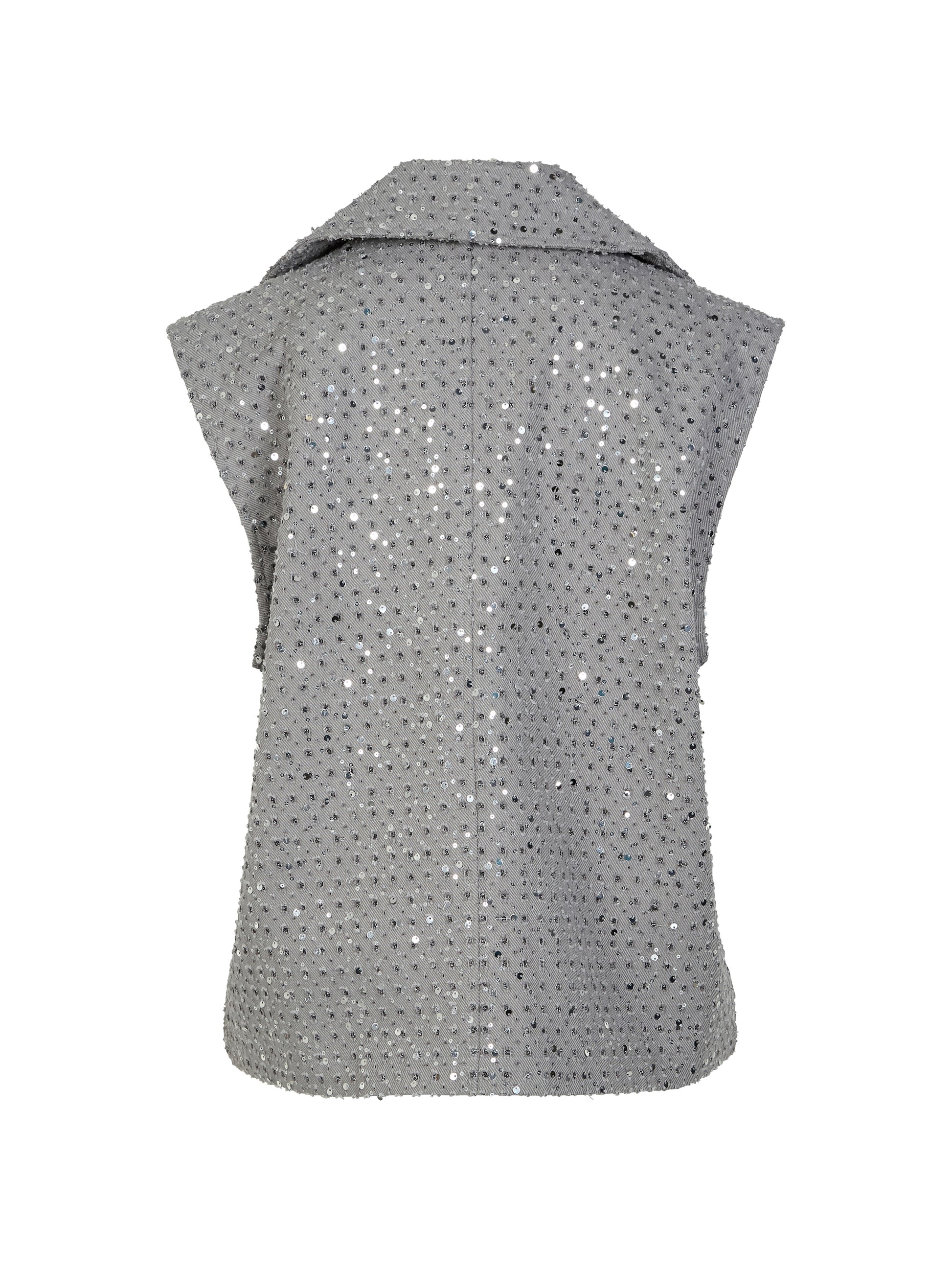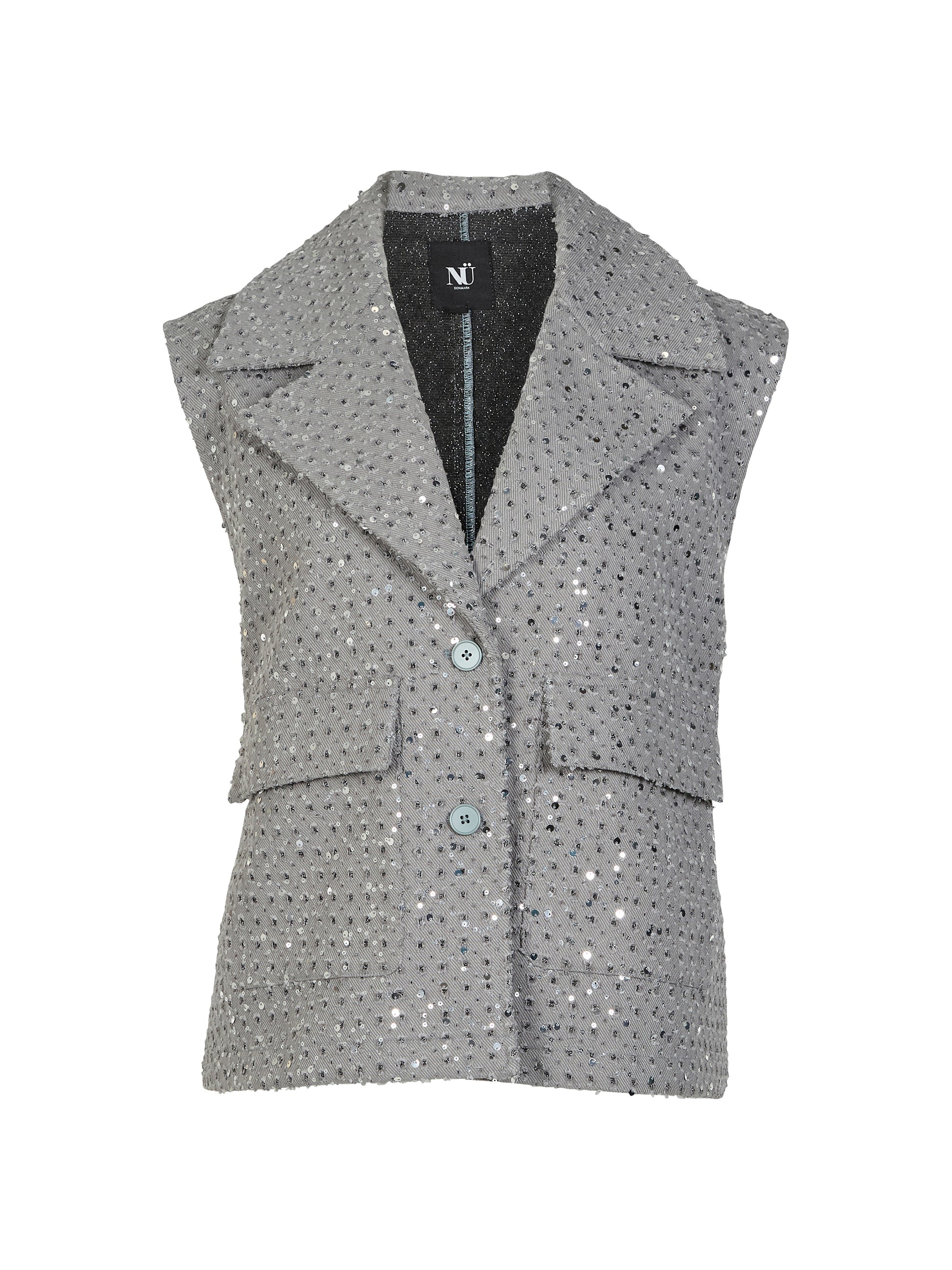 Denne vest udstråler elegante på lang afstand. Vesten har en klassisk bred revers, to knapslukning og frontlommer. Den er besat med små sølvfarede pailletter, som giver et feminint udtryk.