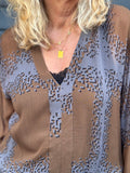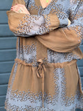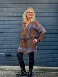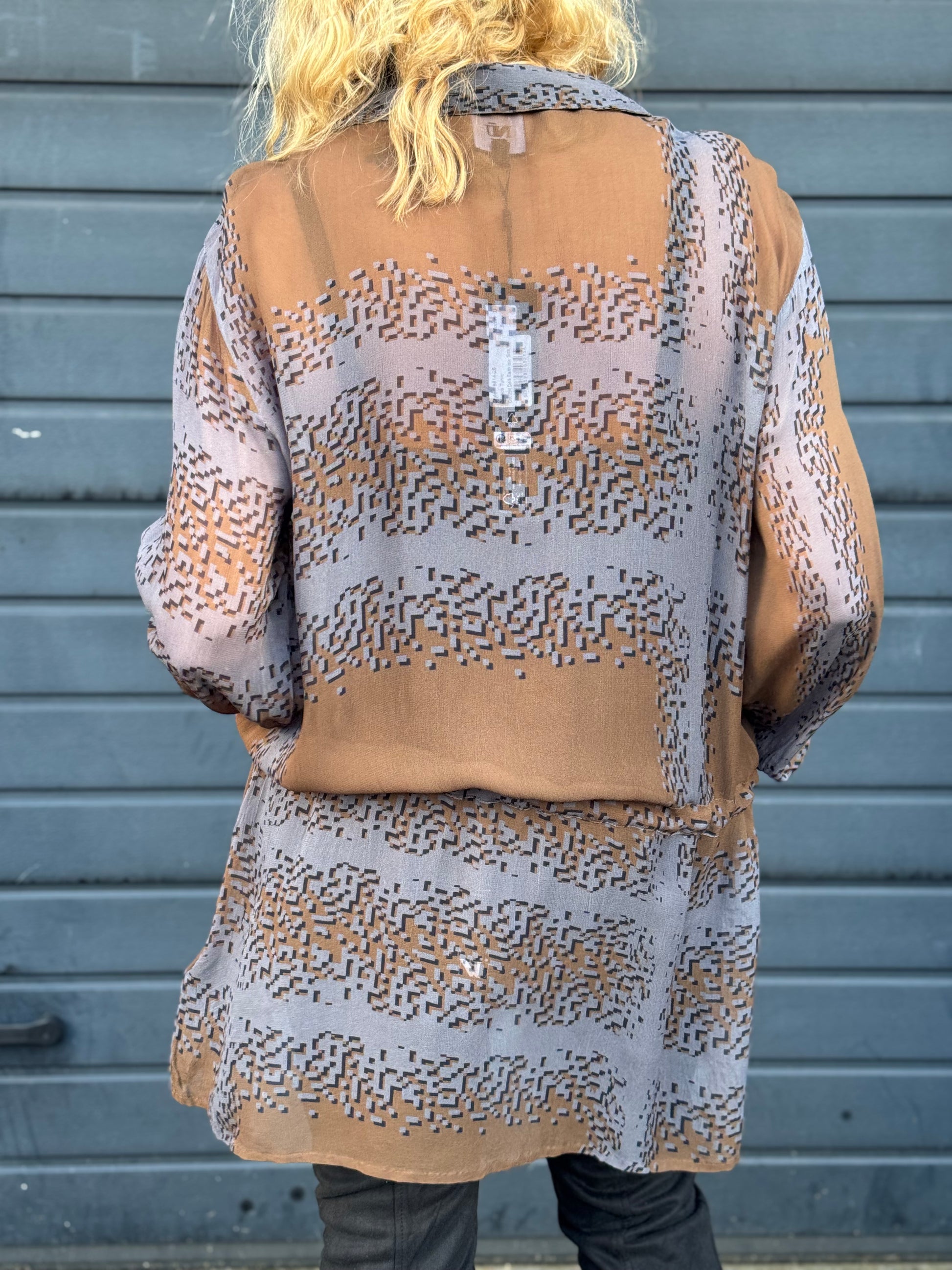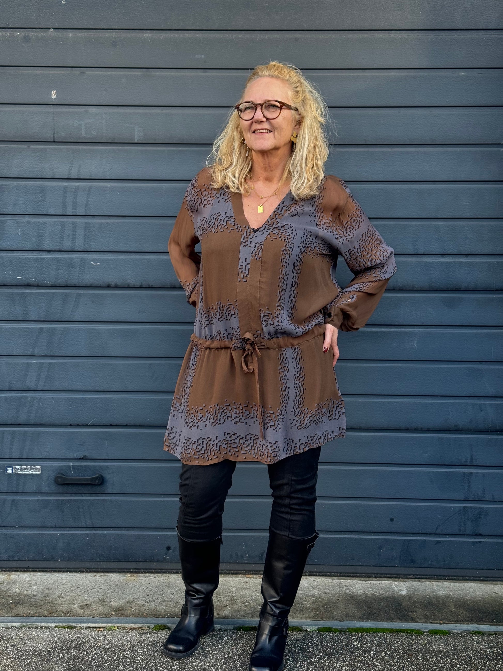 Smuk tunika i den fineste farvekombination mellem brun, grå og sort. Tunikaen har v-udskæring med en bred kant og lange ærmer som afsluttes med et lille ribkant. Den har et lille bindebånd i taljen, så det er muligt at style den på forskellige måder.