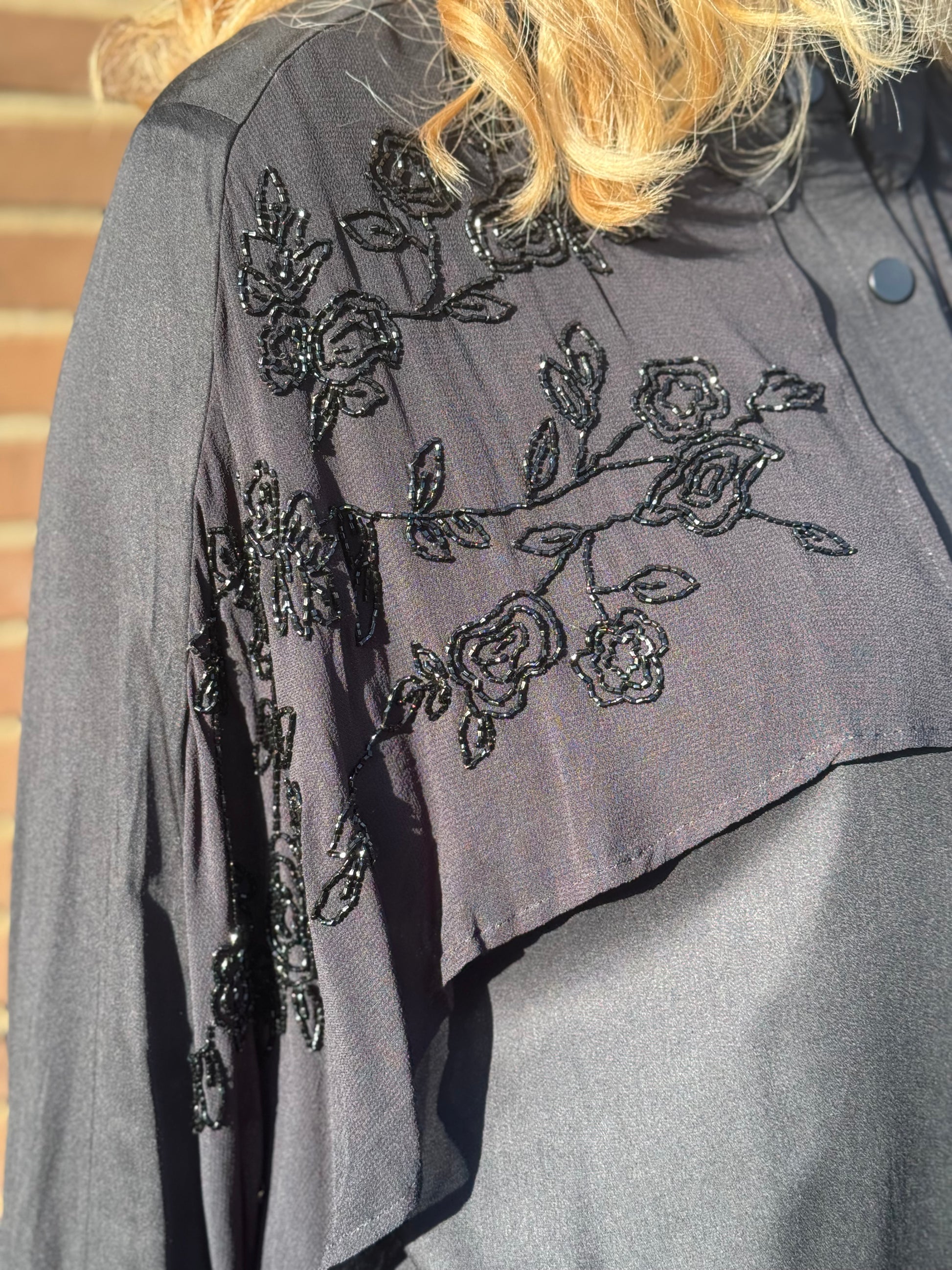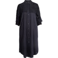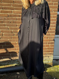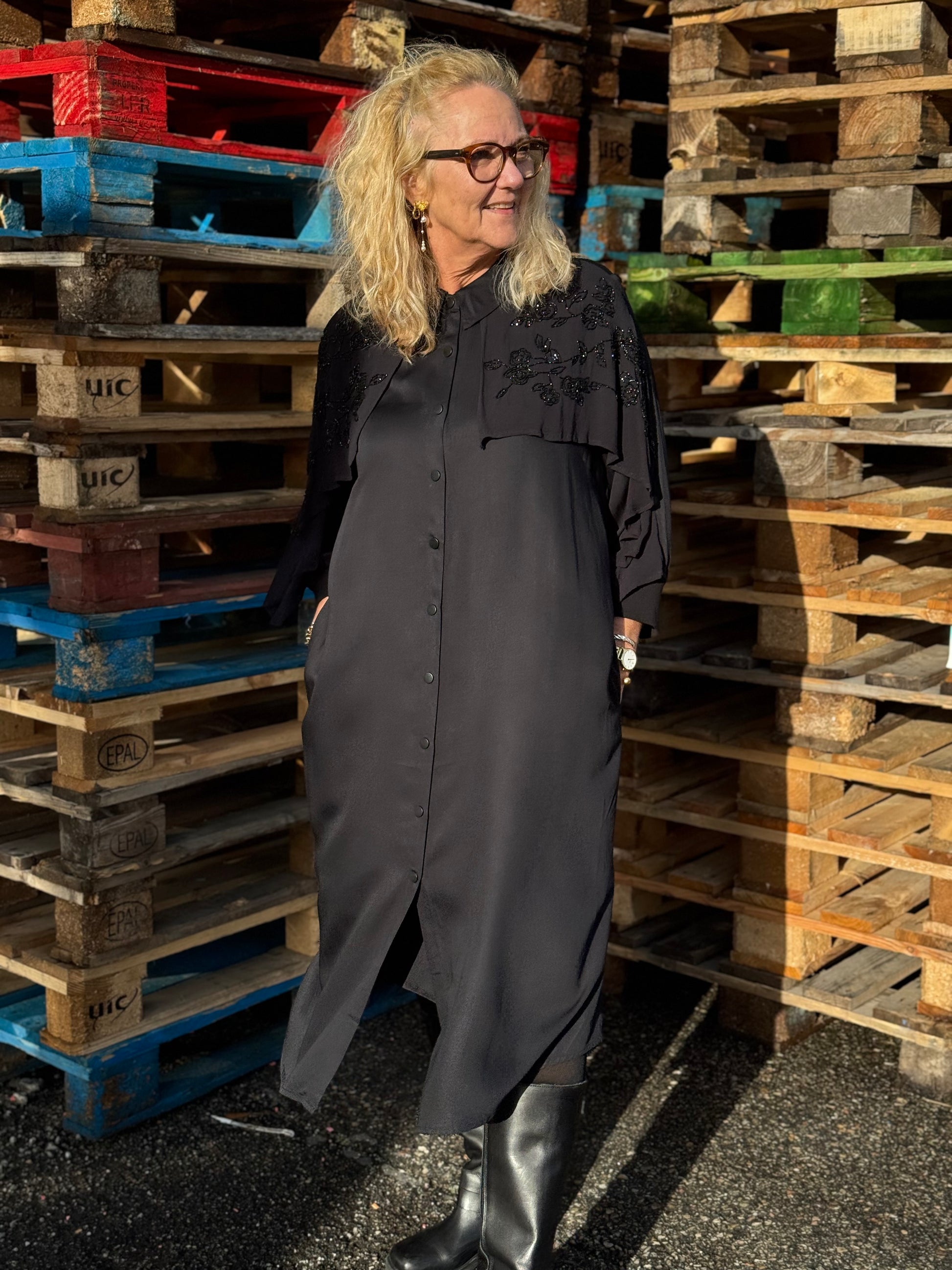 Denne elegante kjole fra Nü Denmark kan redde en hver tøjkrise. Kjolen har en klassisk krave og er gennemknappet - men det som gør den til mere end en klassisk kjole er den smukke kappe som er besat med perler. Ærmerne er trekvart og afsluttes med en lille ribkant.