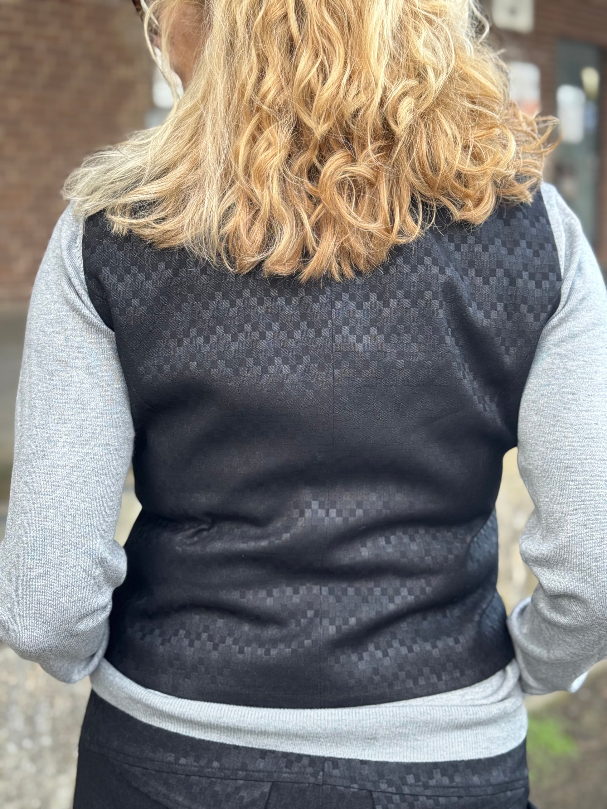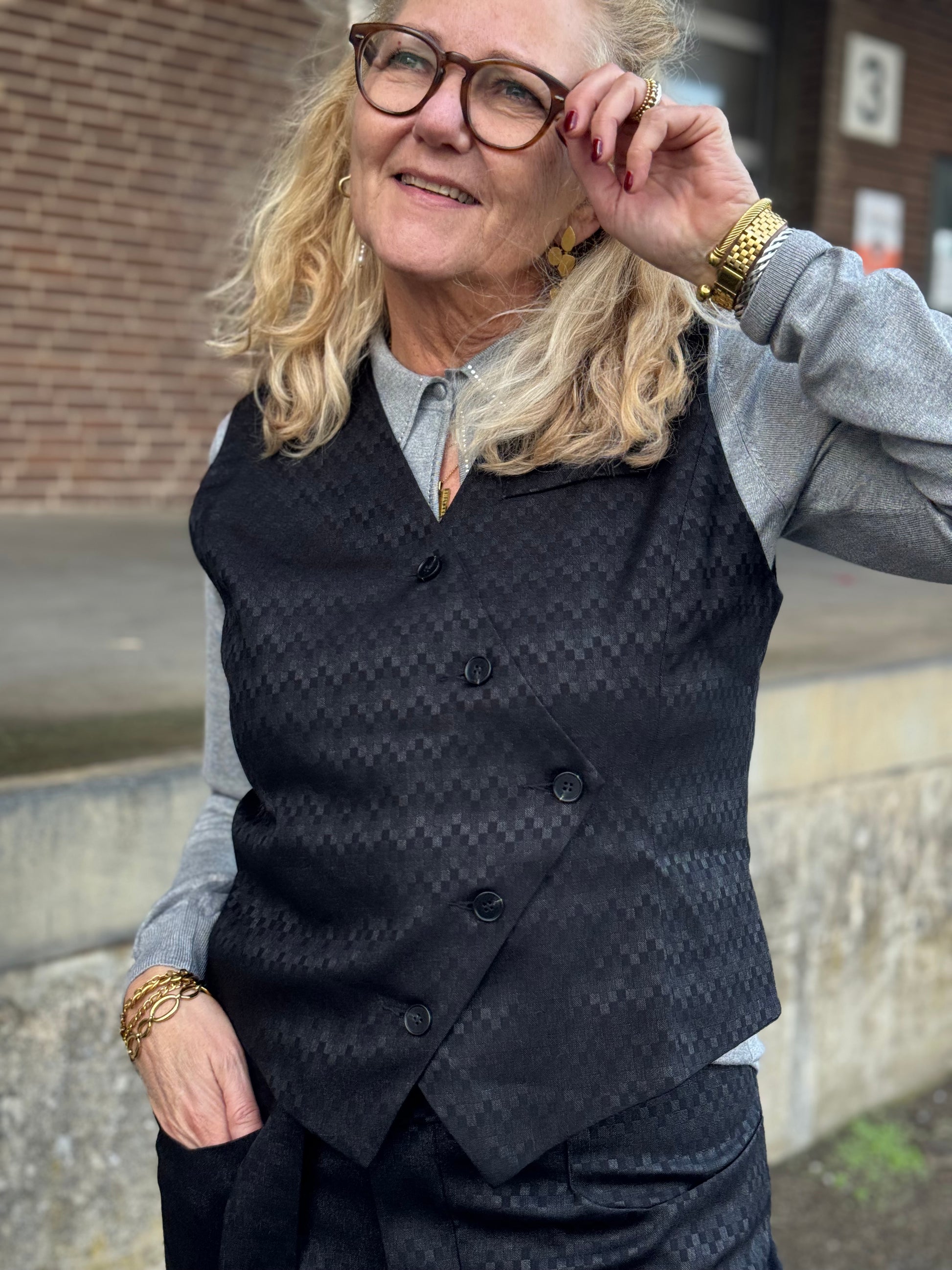 Denne lækre vest i det smukkeste grafiske stof er et must have med sit tailored fit. Vesten har et asymmetrisk fit foran - hvor knaplukningen sider i siden. Den har en lille brystlomme med flap som en fin detalje.