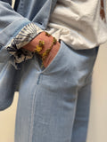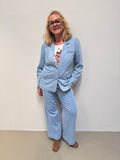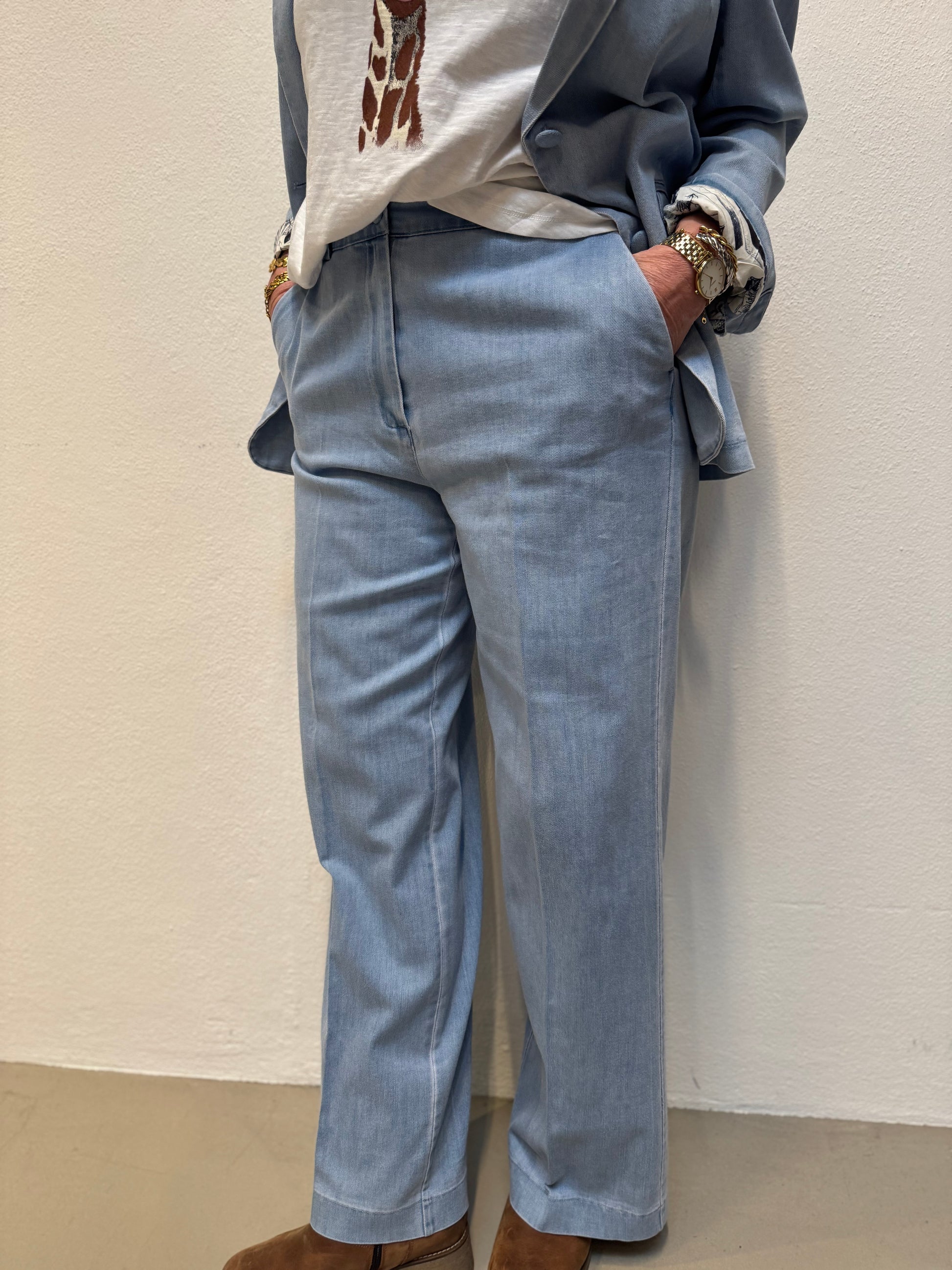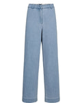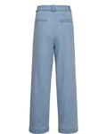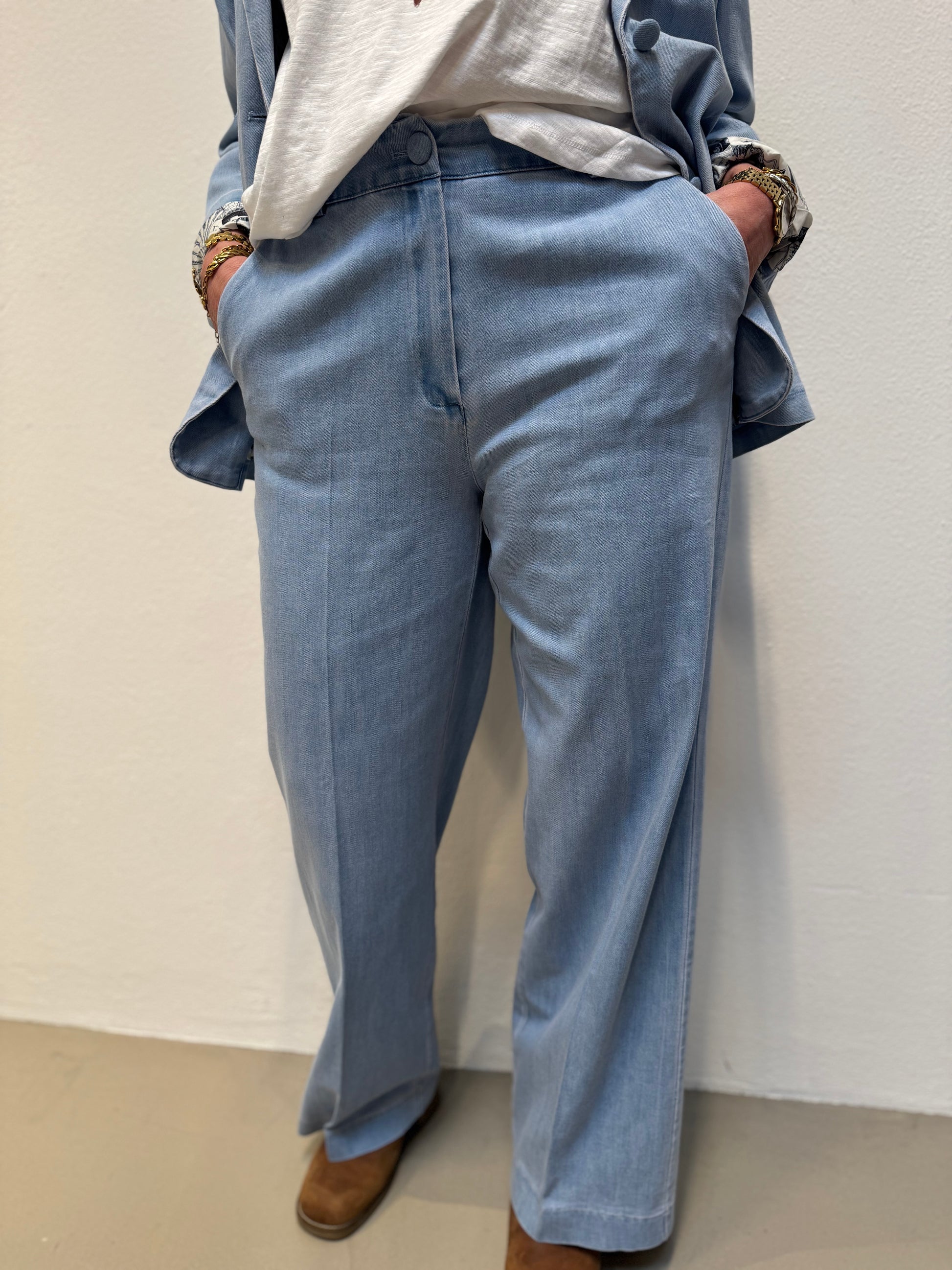 Disse lækre denim habitbukser er et must have - da de med sit klassiske snit kan styles til en hver lejlighed. Bukserne har fast linning med bæltestropper og klassisk knaplukning med stofbetrukket knap. Der er skrålommer i siderne mens der er paspolerede baglommer. Bukserne er fitted omkring hofterne mens de får vidde i benene.