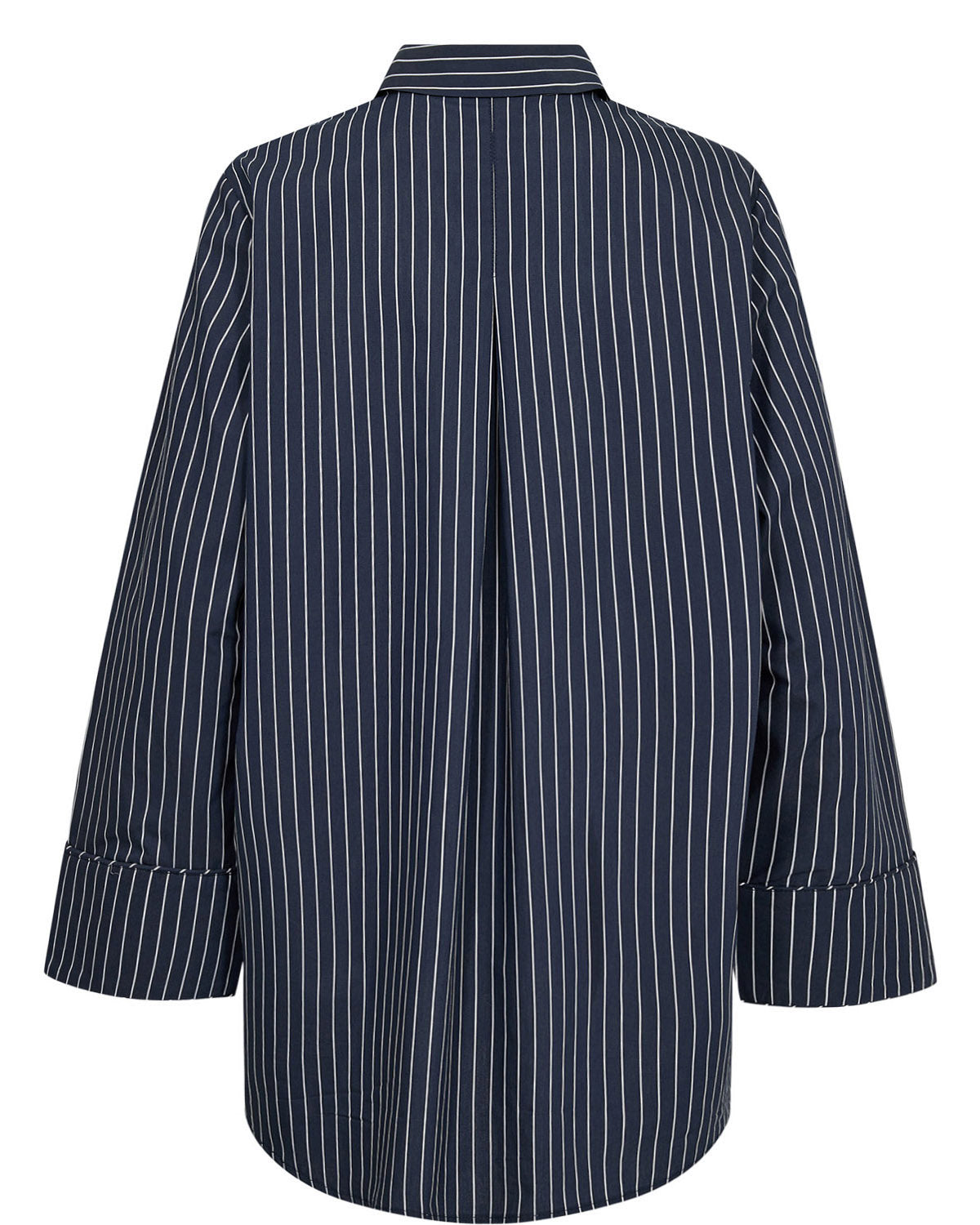 Denne lækre mørkeblå stribet skjorte fra Nümph er fyld med de lækreste detaljer. Skjorten har knaplukning ned til omkring brystet og en klassisk skjortekrave. Skjorten har bredde kimono ærmer som afsluttes med de fineste brune border. Foran har den en fed skrift som leder tanker hen på eventyr - samt en smule shine i stoffet.