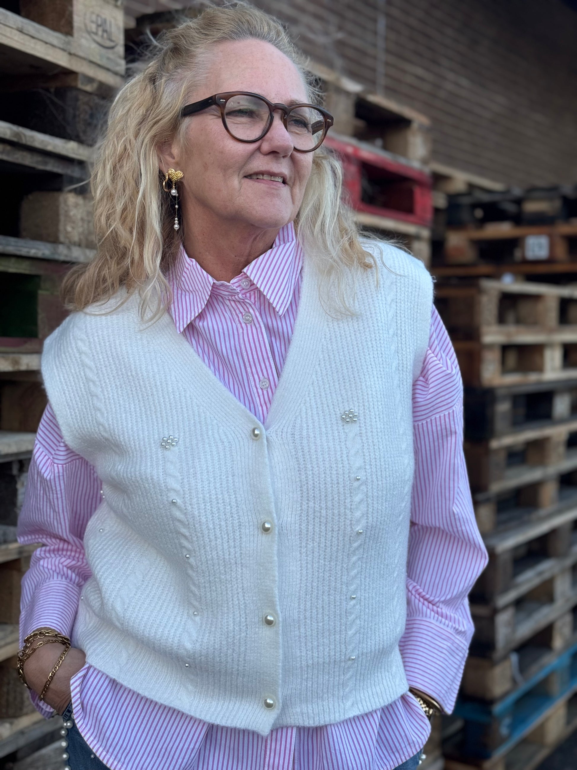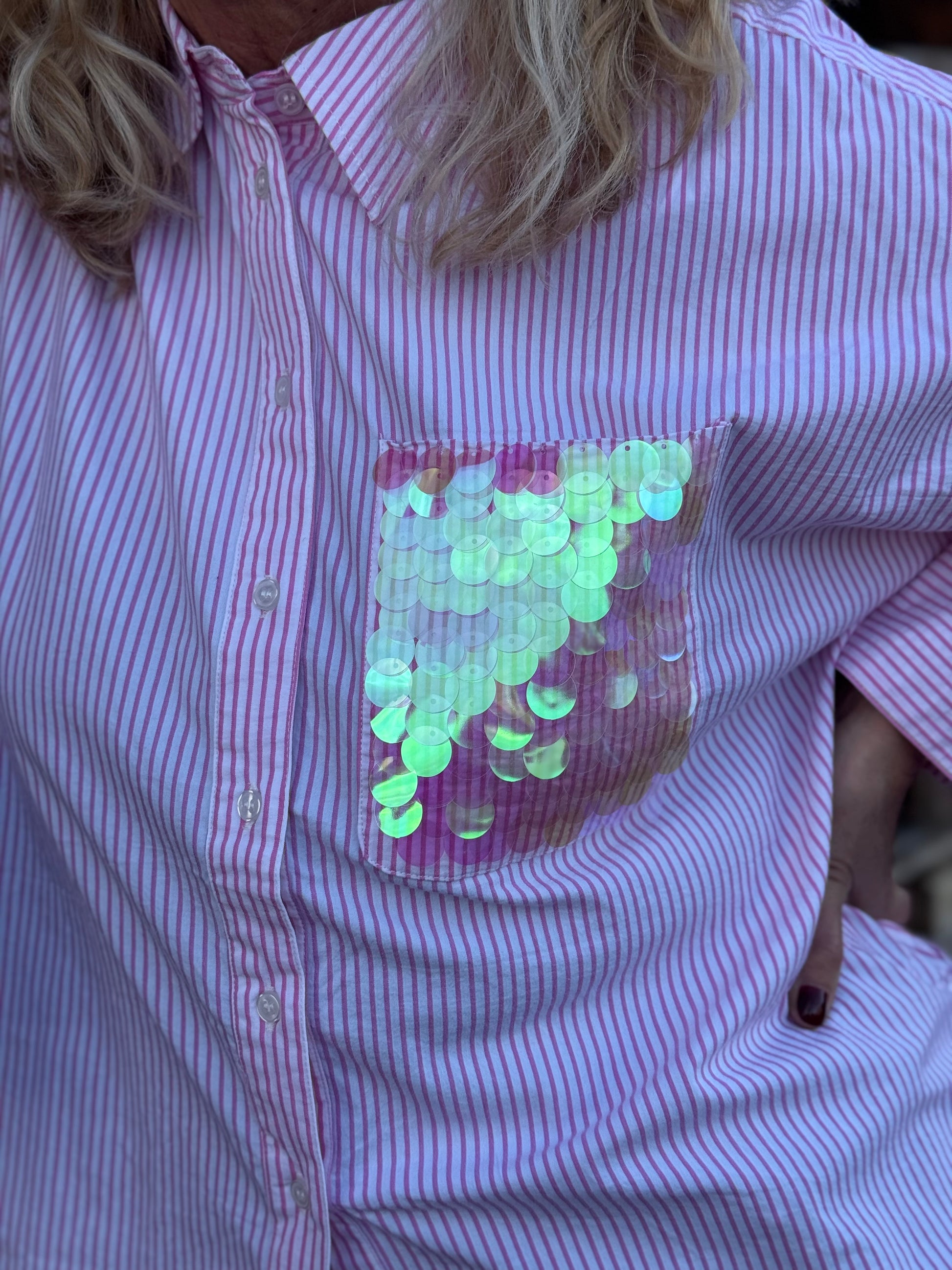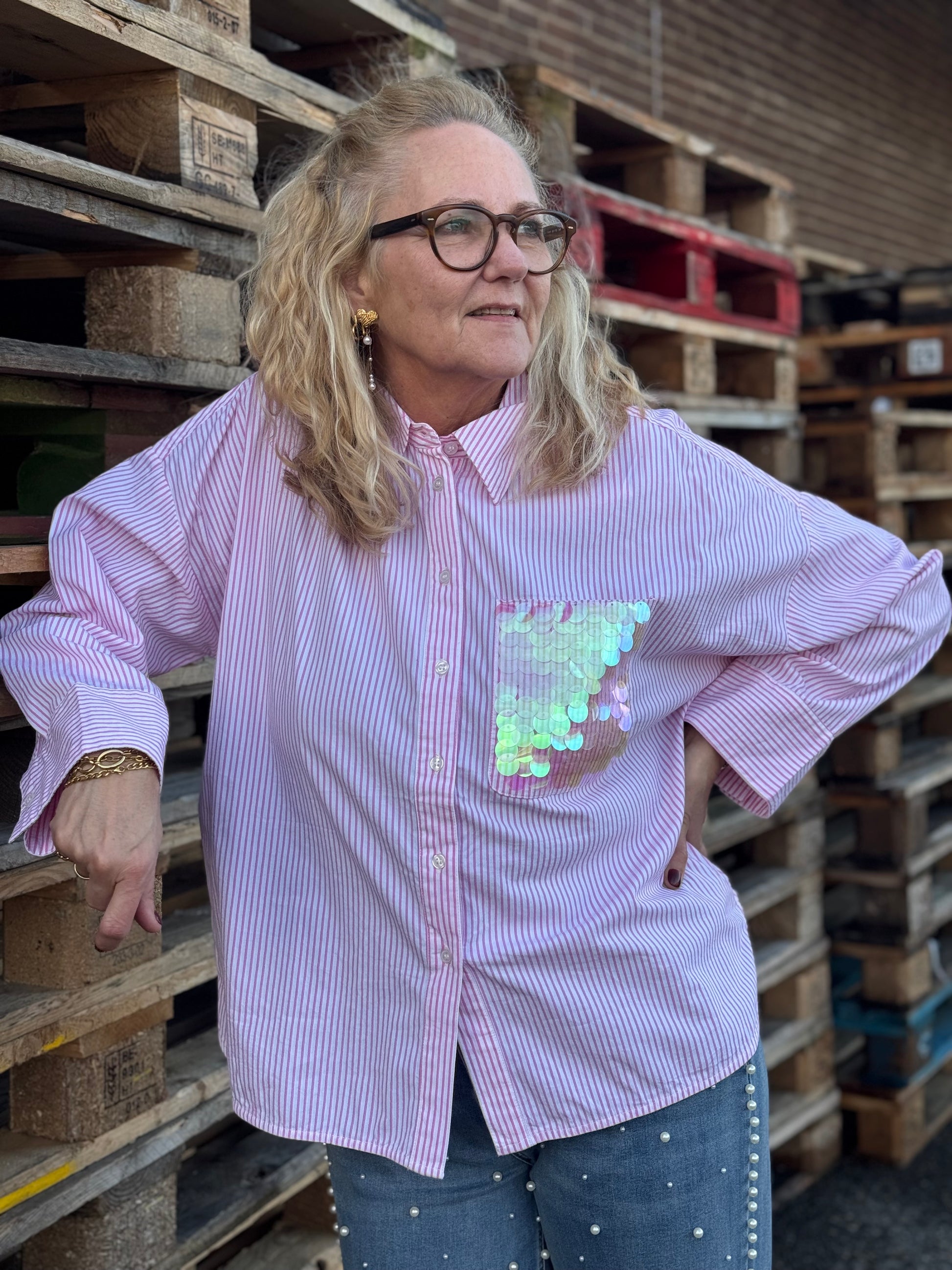 Denne skønne stribet skjorte kan pifte et hvert outfit op. Den har en klassisk krave og knaplukning. På det ene bryst har den en lomme, som er pyntet med klare lyserøde pailletter.