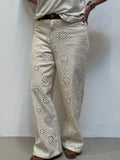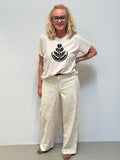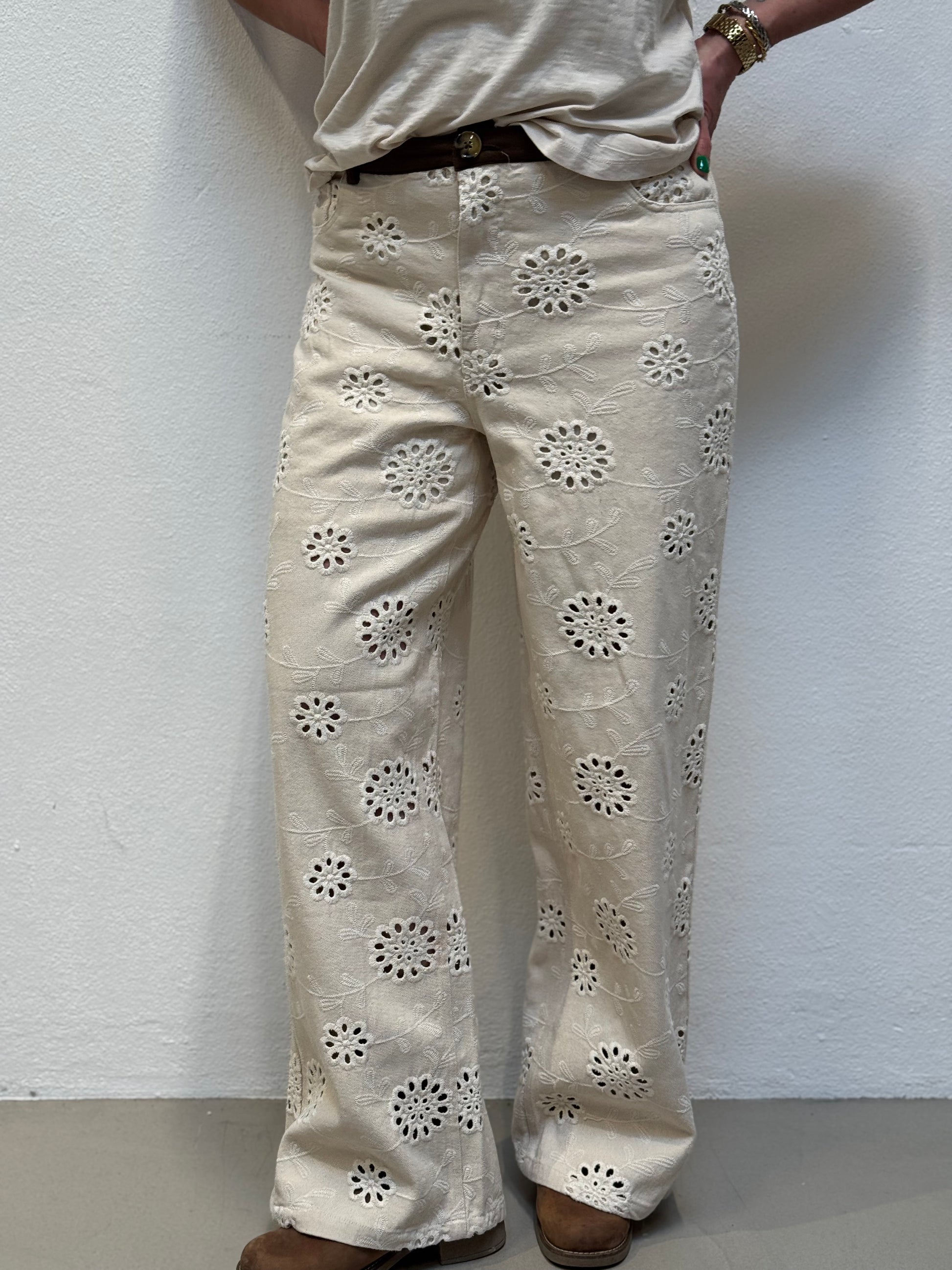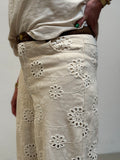 Disse super fine broderi anglaise bukser fra Nümph i den smukkeste creme farve er en favorit i garderoben. Bukserne har fast linning i en lækker brun kontrastfarve og knaplukning. Bukserne er med five pocket og en smule vidde i benene. Bukserne har indbygget shorts som slutter omkring låret.
