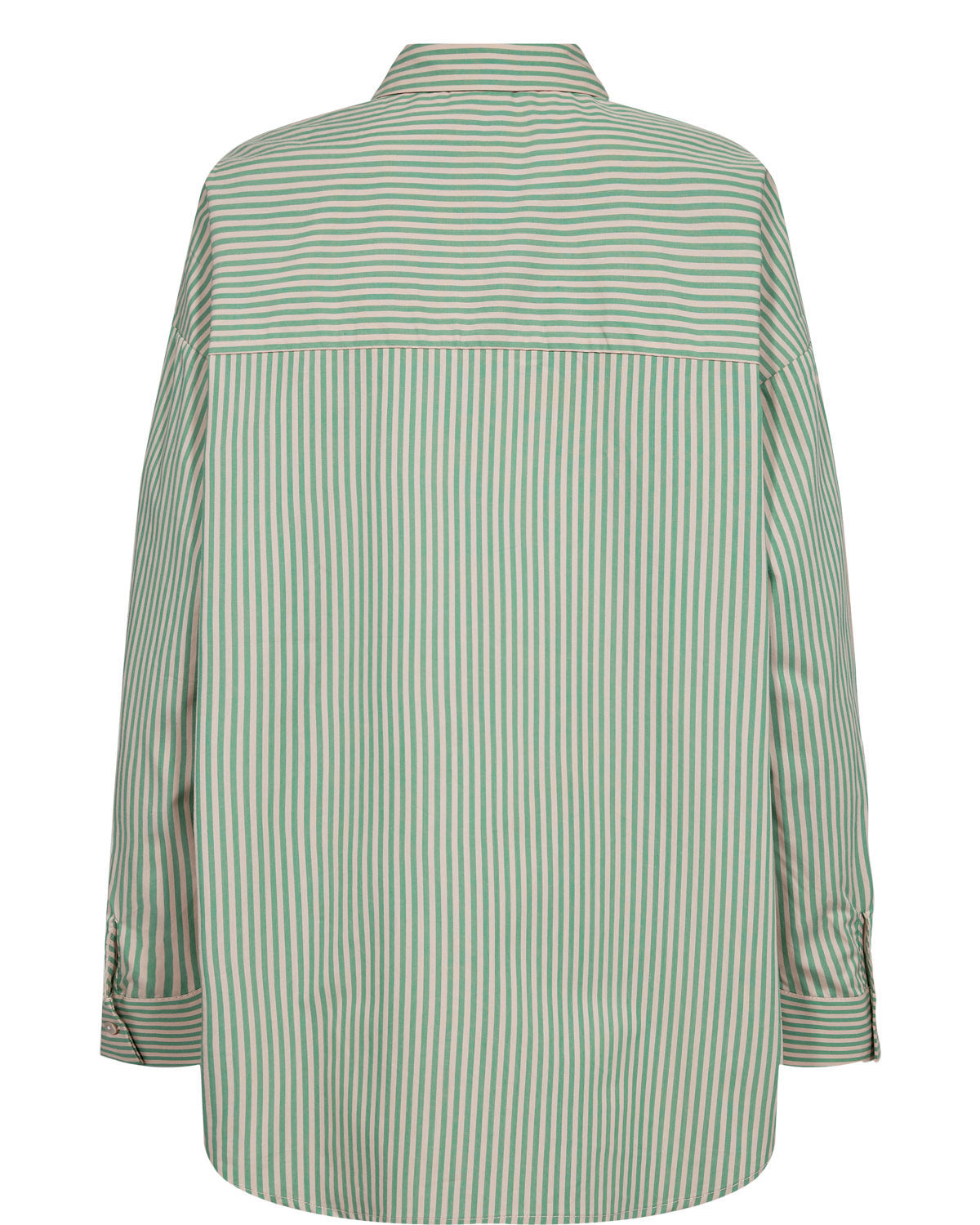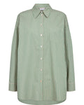Denne lækre oversize skjorte i den smukkeste grønne strib er et must have da den kan redde en hver tøjkrise. Skjorten er med klassisk krave og knaplukning med de smukkeste perlemorslignende knapper. Den har en lille manchet med modsatrettede striber som går igen på det øverste rygstykke.